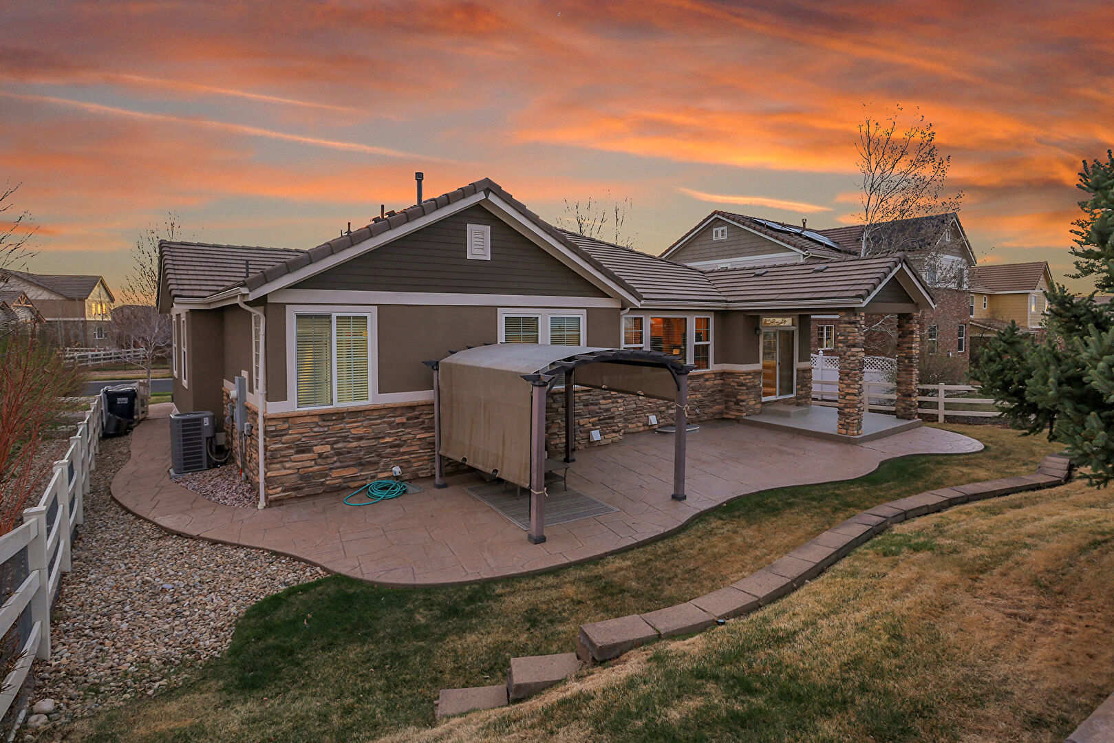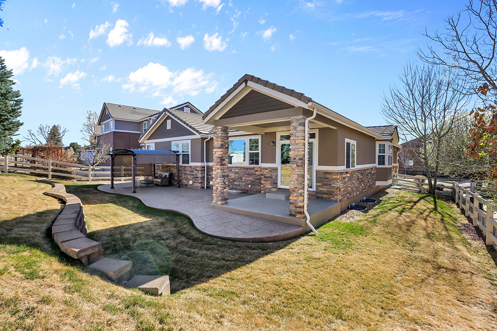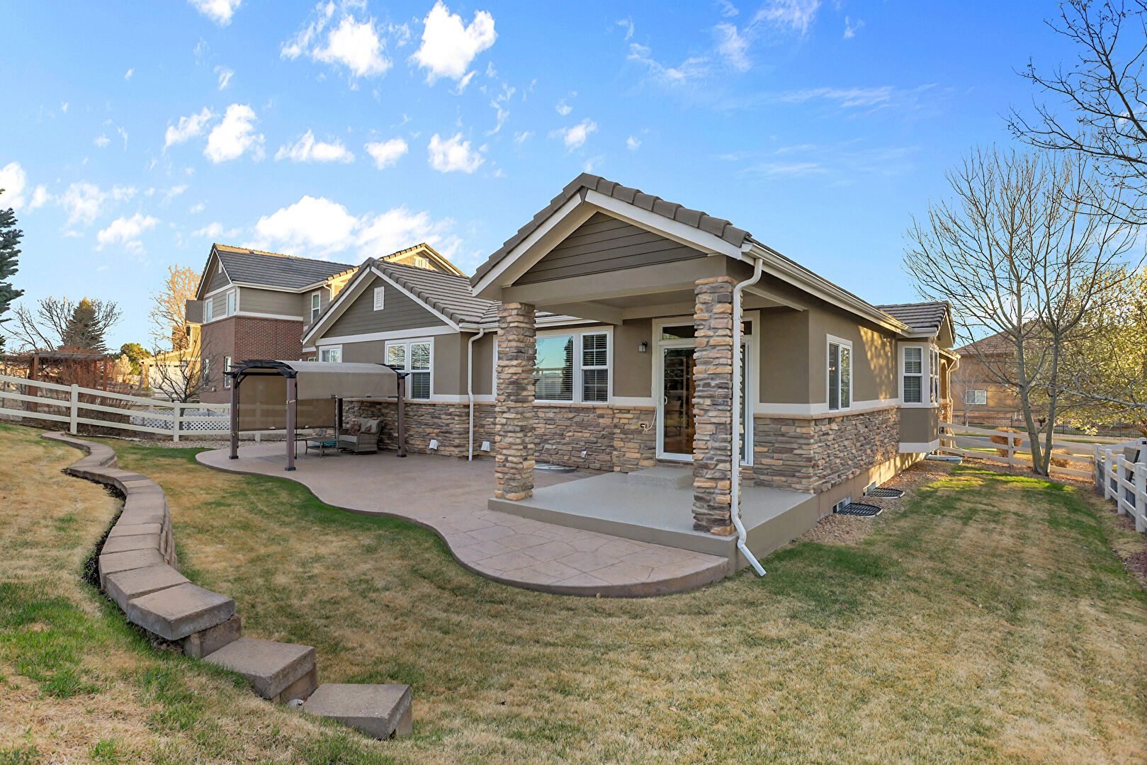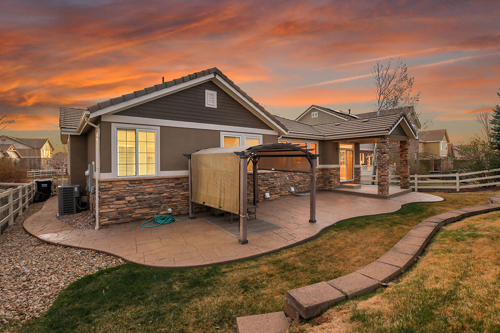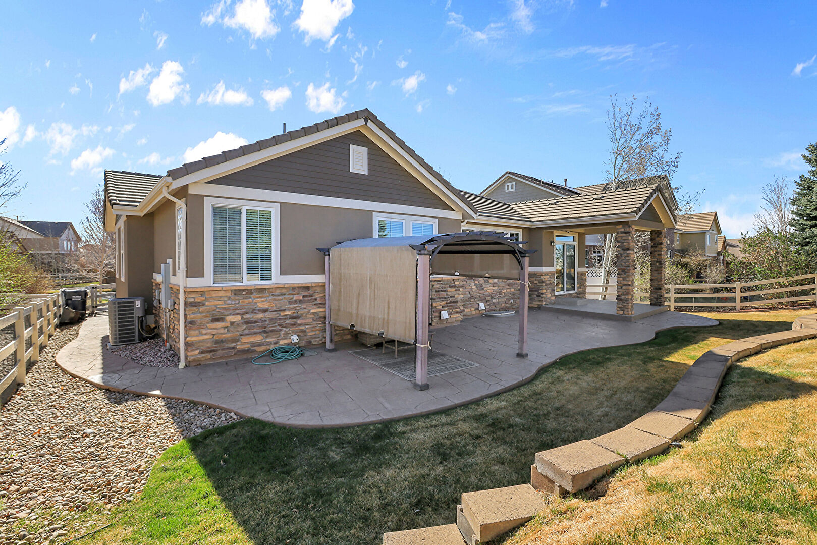 Central Ac, Concrete Foundation, Downspout, Fence, Gazebo, Grill, Gutters, Horizontal Siding, Hot Tub, Lawn, Outdoor Living Space, Patio, Pergola, Stone Siding, Stucco Siding, Tile Roof, Concrete Foundation, Downspout, Gazebo, Gutters, Horizontal Siding, Lawn, Stone Siding, Stucco Siding, Tile Roof