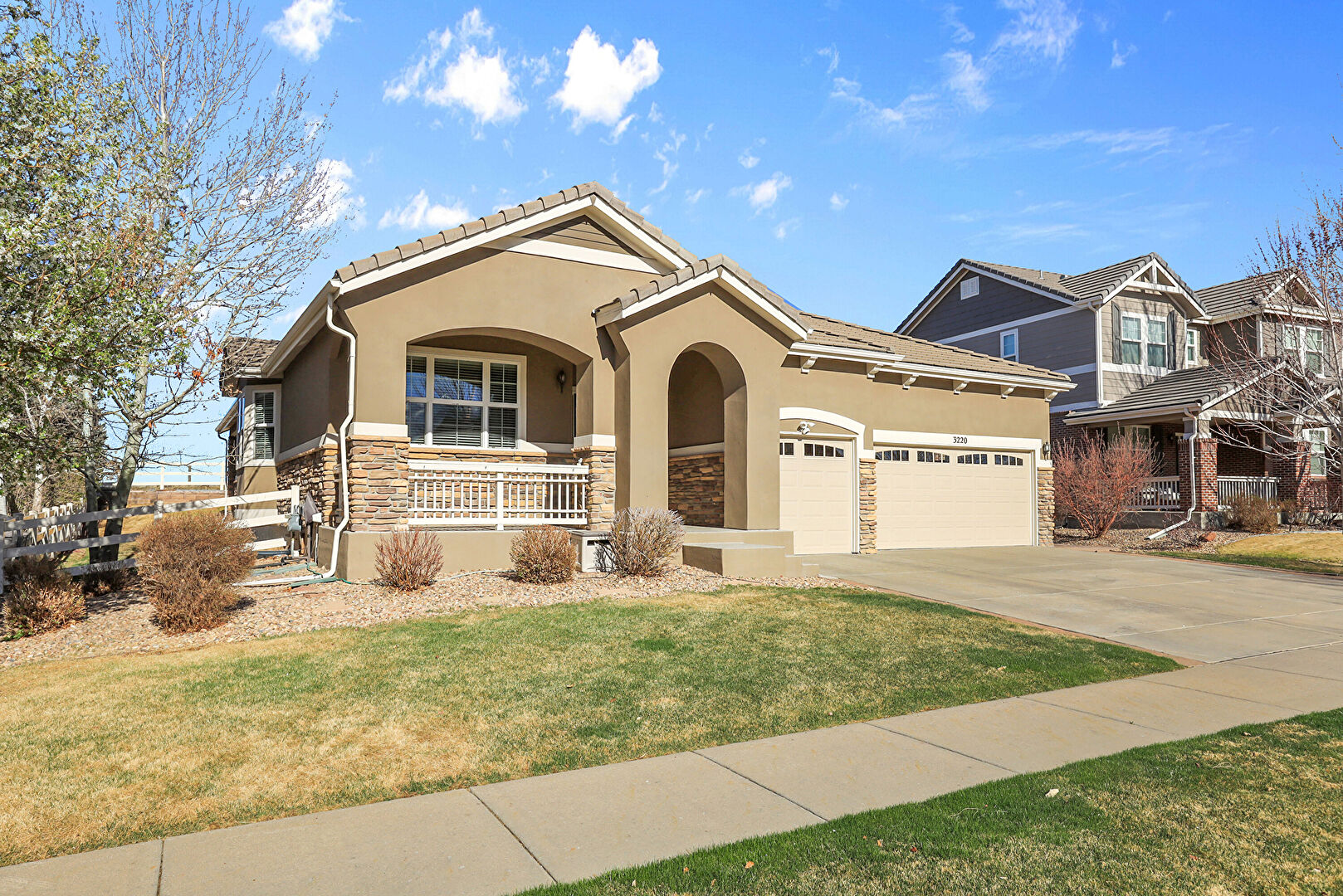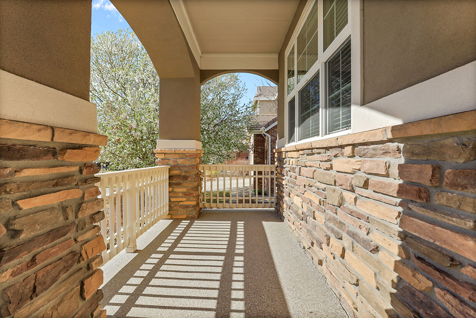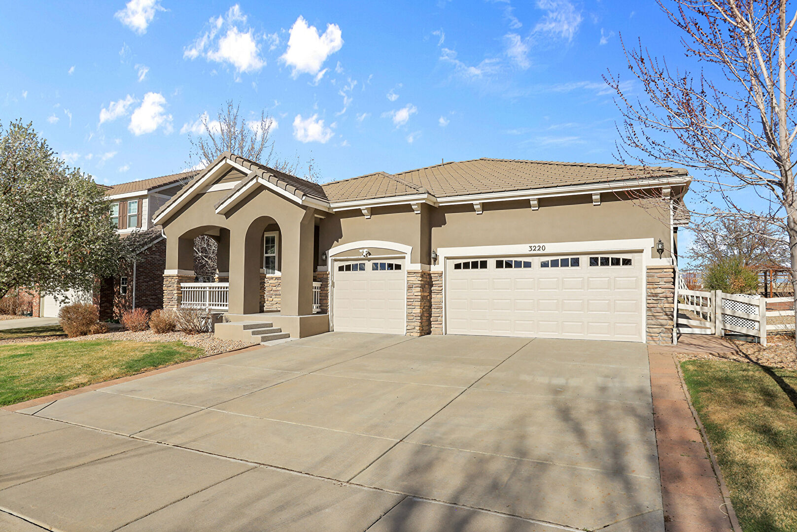 Downspout, Driveway, Fence, Gate, Gutters, Lawn, Porch, Stone Siding, Stucco Siding, Tile Roof, Downspout, Driveway, Gutters, Lawn, Porch, Stone Siding, Stucco Siding