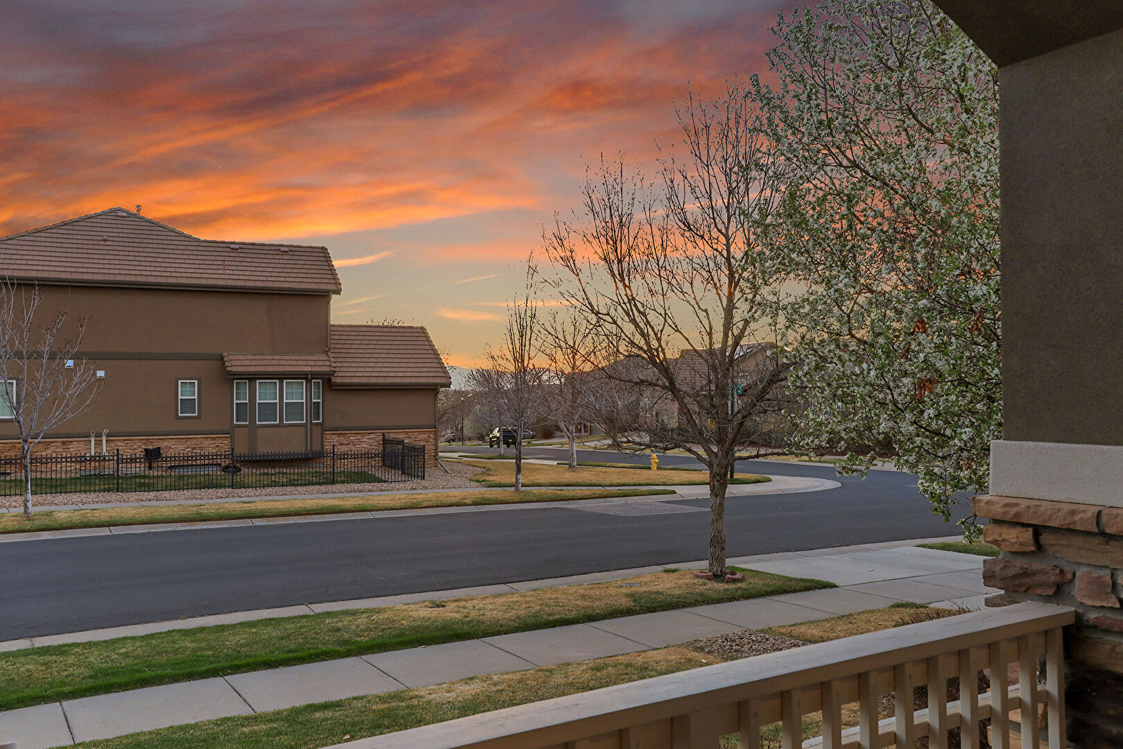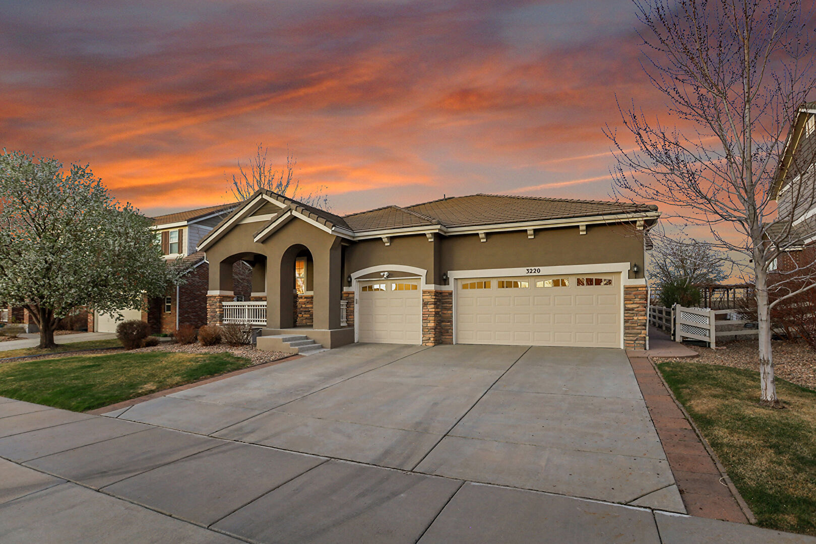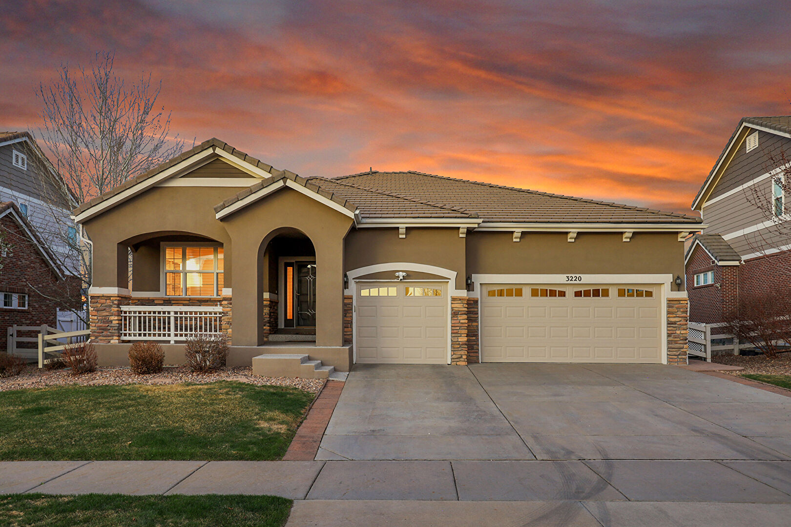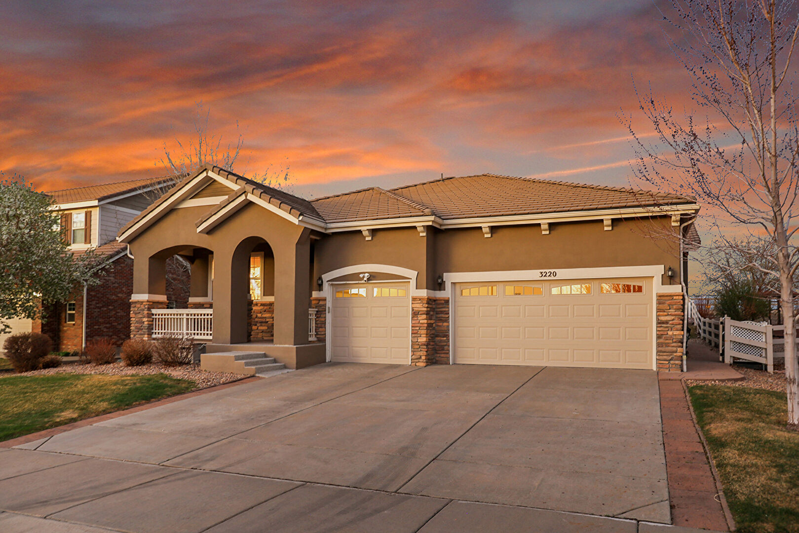 Downspout, Driveway, Fence, Gate, Gutters, Lawn, Porch, Stone Siding, Stucco Siding, Tile Roof, Downspout, Driveway, Gutters, Lawn, Porch, Stone Siding, Stucco Siding