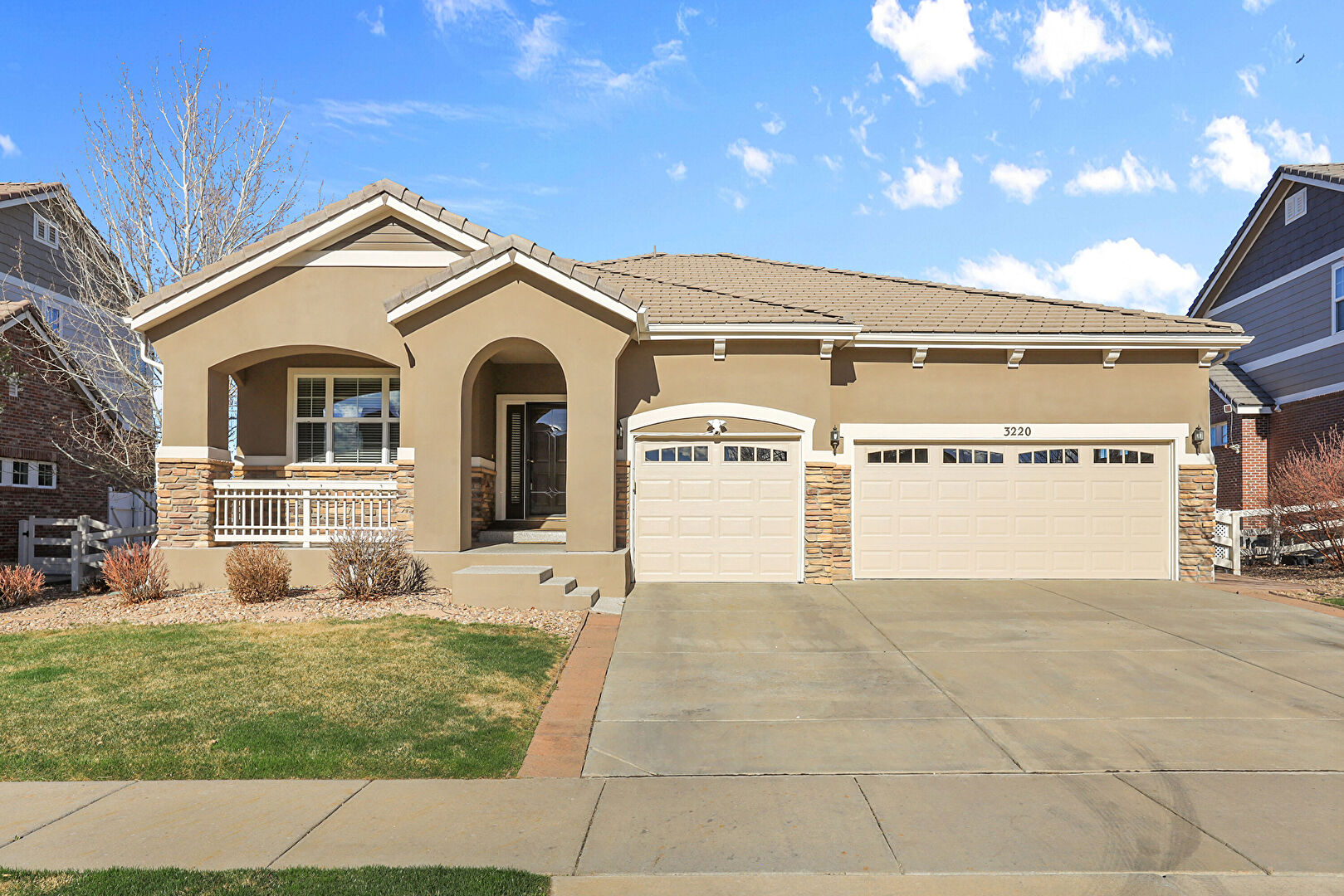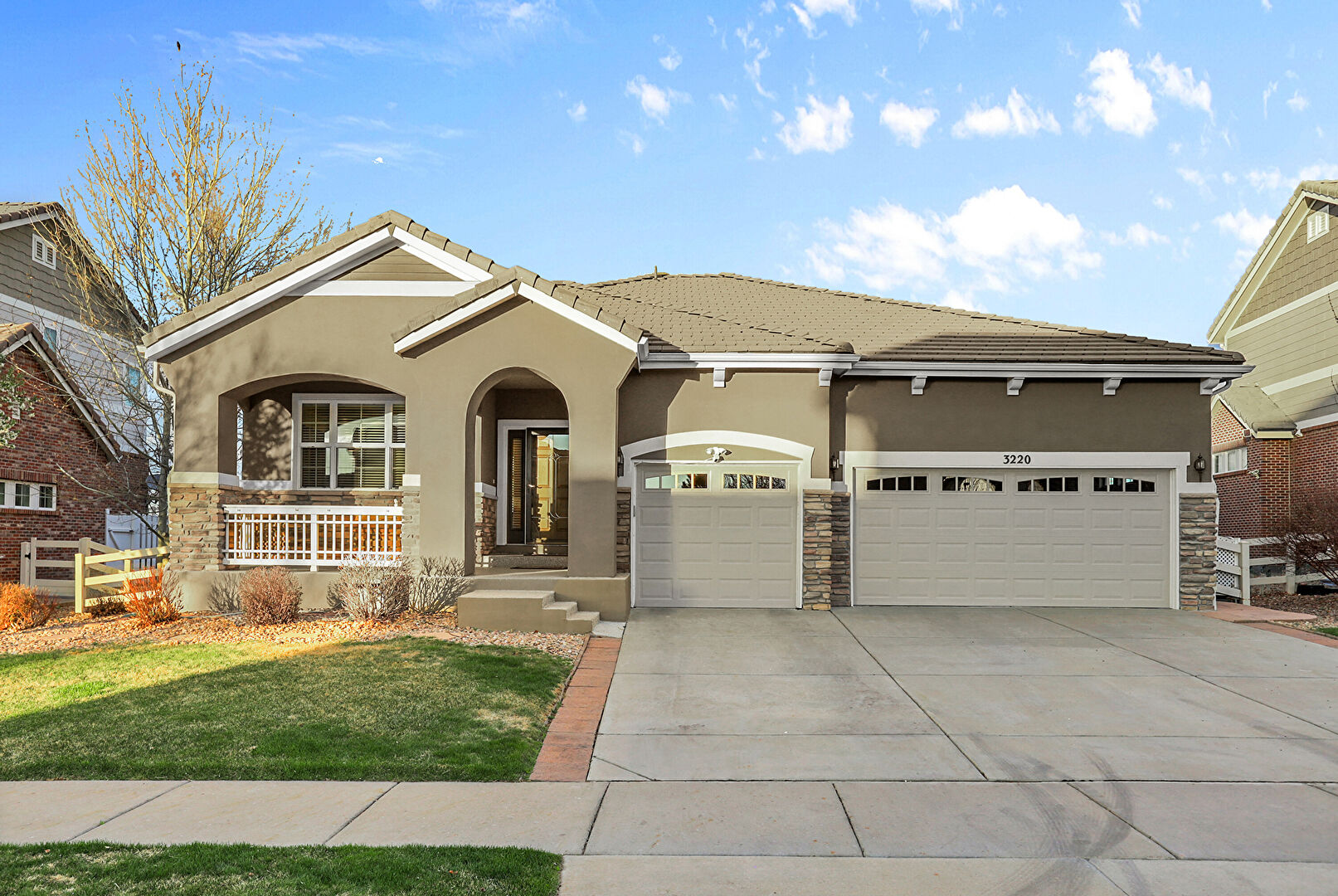 Porch, Stone Siding, Stucco Siding, Garage