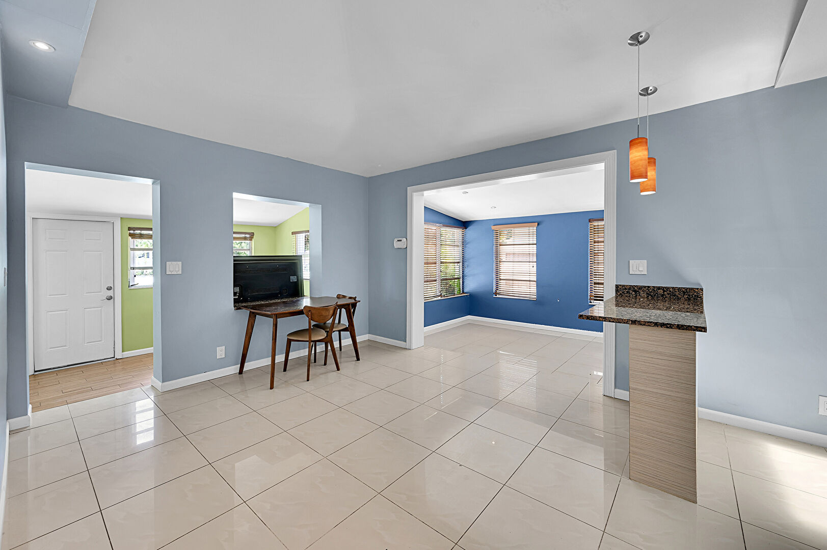 Baseboards Wall, Drywall, Natural Light, Recessed Lighting, Vaulted Ceiling, Tile Floor