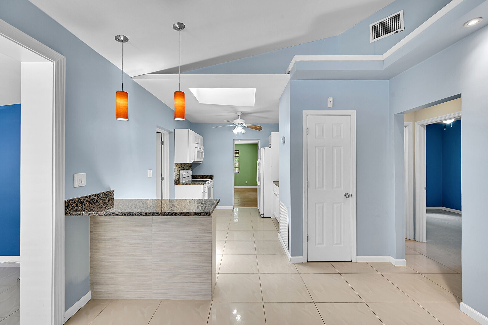 Baseboards Wall, Ceiling Fan, Drywall, Kitchen Bar, Kitchen Peninsula, Natural Light, Opens To Living Area, Pendant Lighting, Shaker Cabinets, Skylight, Stone Countertops, Tile Floor, Vaulted Ceiling, Vent, Wood Finish Floor, Ceiling Fan, Kitchen Peninsula, Raised Cabinets, Stone Countertops