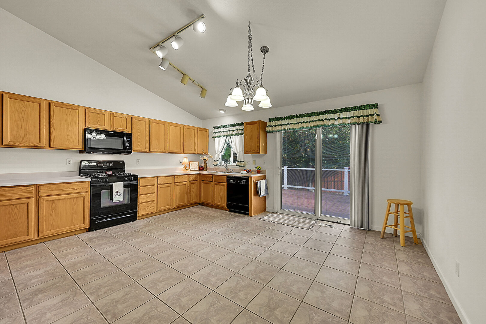 Arched Cabinets,  Baseboards Wall,  Concrete Floor,  Drywall,  High Ceiling,  Medium Brown Cabinets,  Natural Light,  Notable Chandelier,  Pendant Lighting,  Shaker Cabinets,  Tile Floor,  Track Lighting,  U Shaped Kitchen,  Vaulted Ceiling, Baseboards Wall, Natural Light, Track Lighting, Vaulted Ceiling