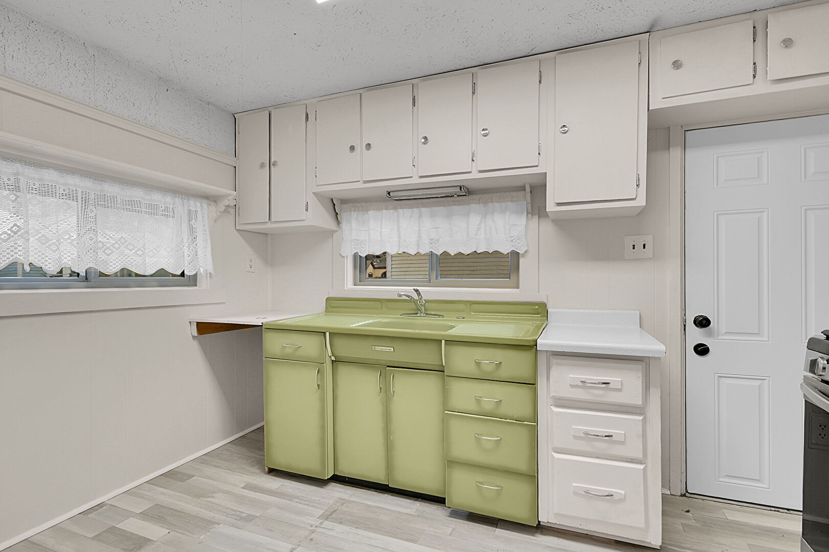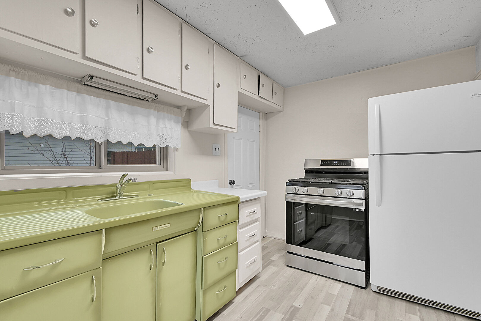 Cream Cabinets, Drywall, Natural Light, Textured Ceiling, Visible Hinge Cabinets, Wood Finish Floor, Textured Ceiling, Wood Finish Floor