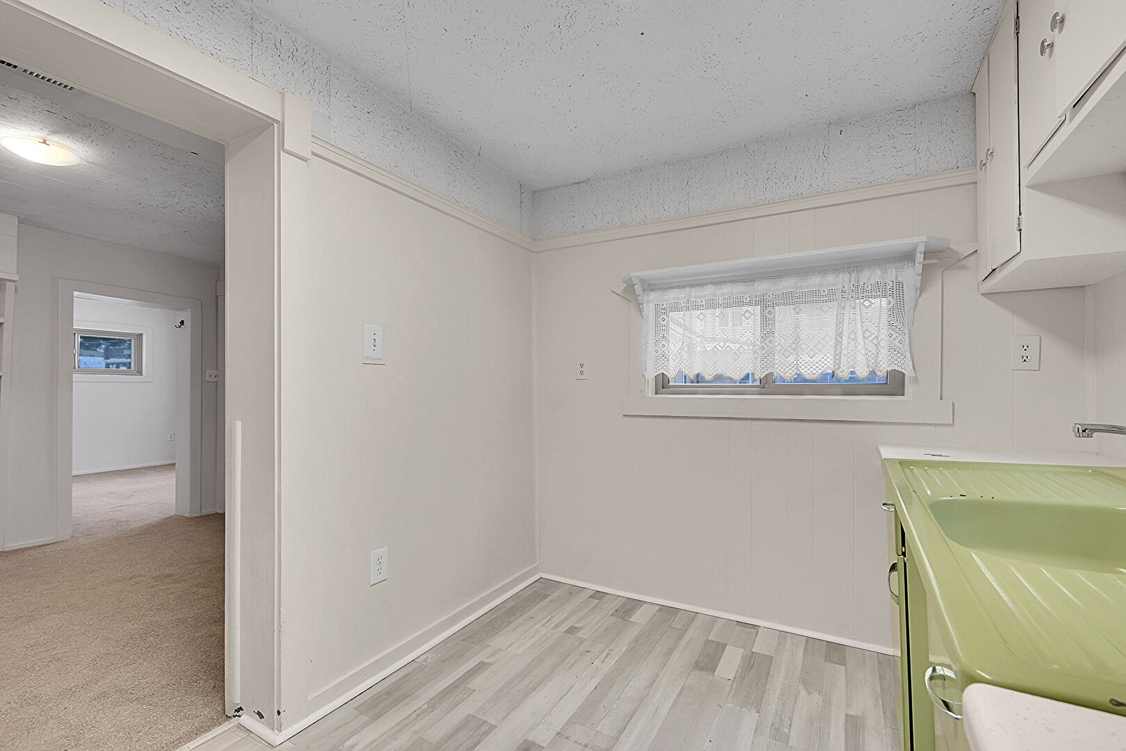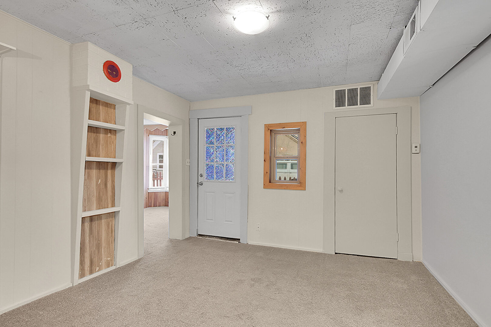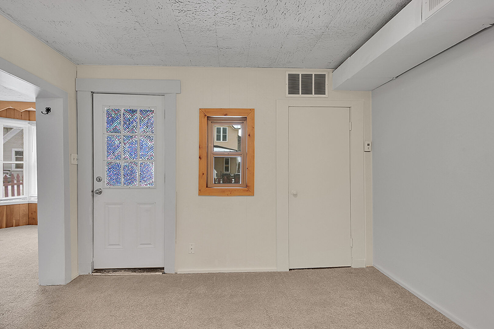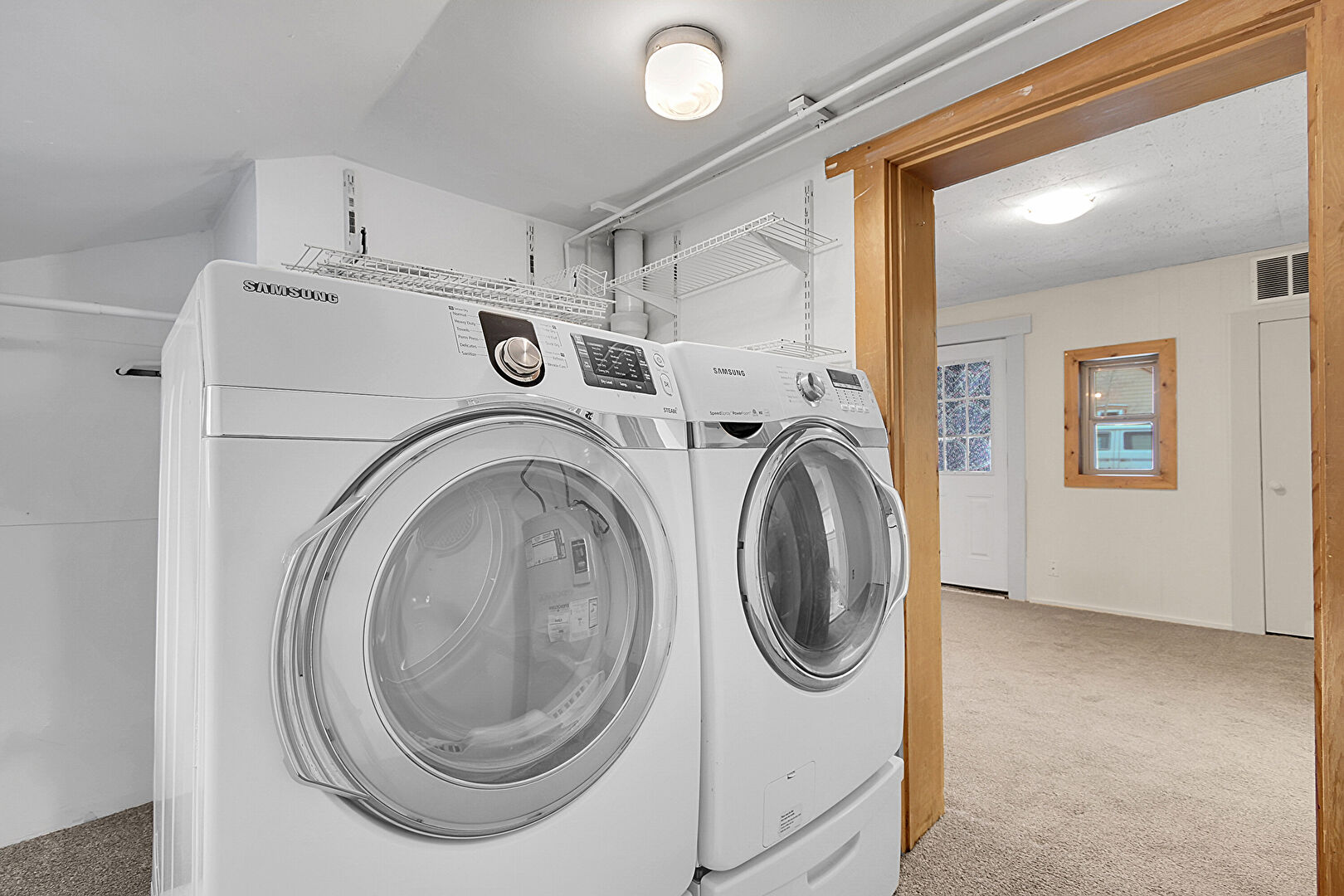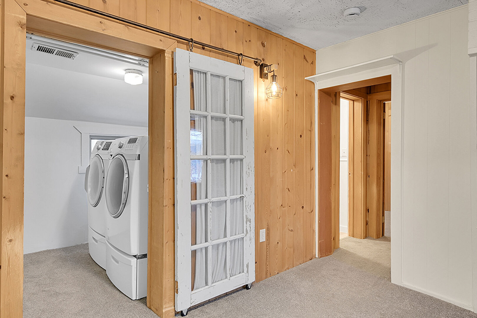 Baseboards Wall, Carpet, Drywall, Laundry, Natural Light, Textured Ceiling, Vent, Wood Finish Floor, Wood Wall, Drywall, Laundry, Smoke Carbon Monoxide Detector