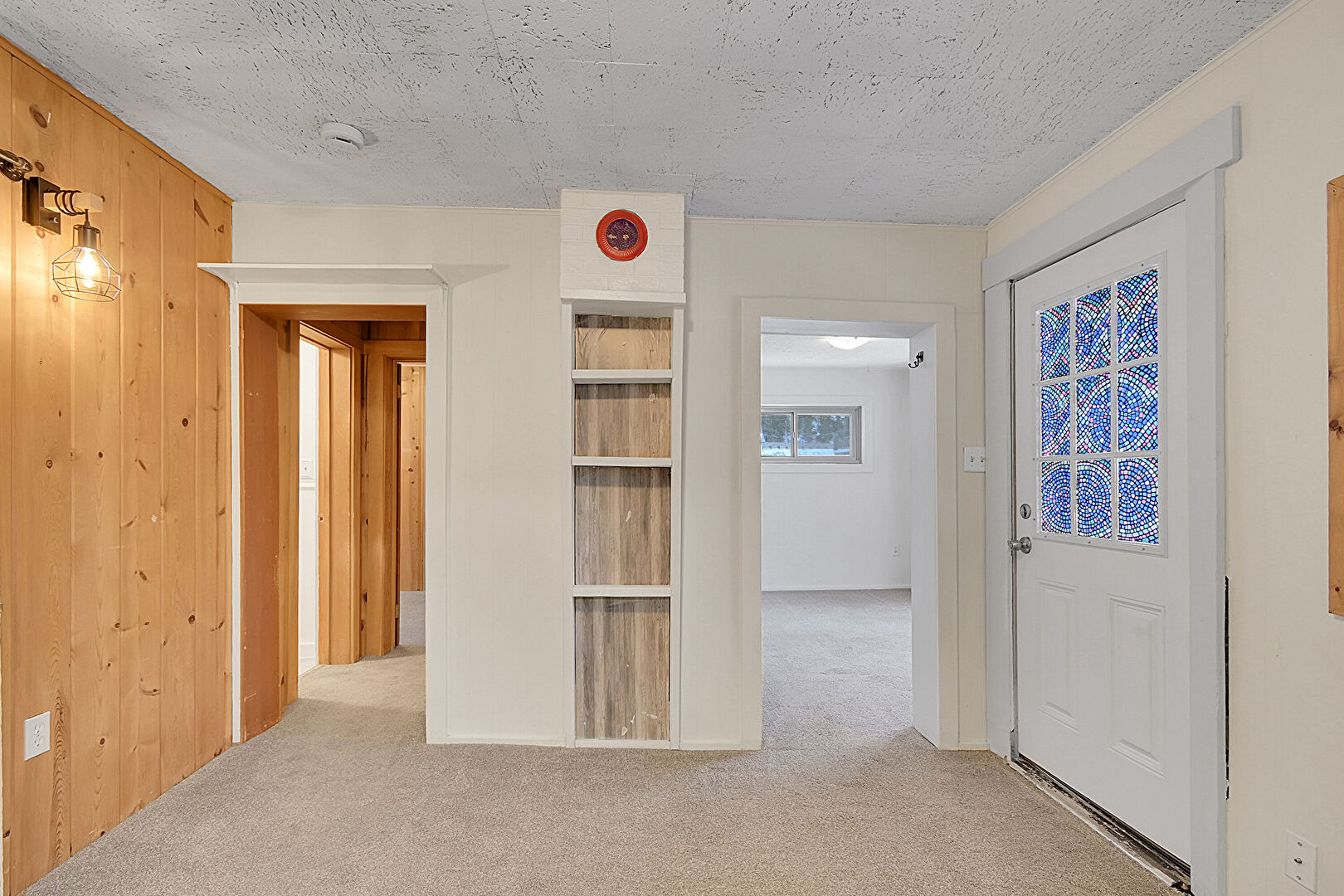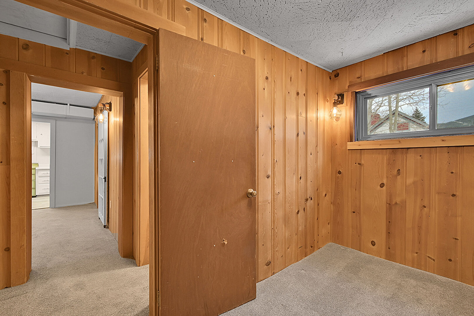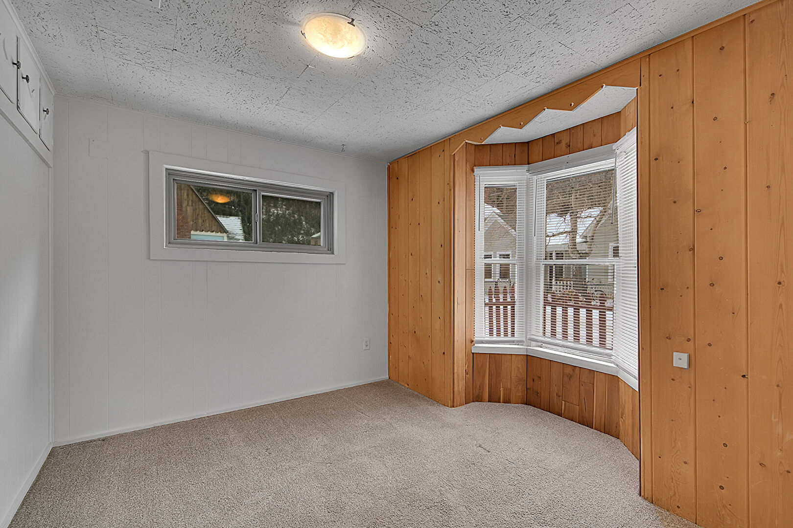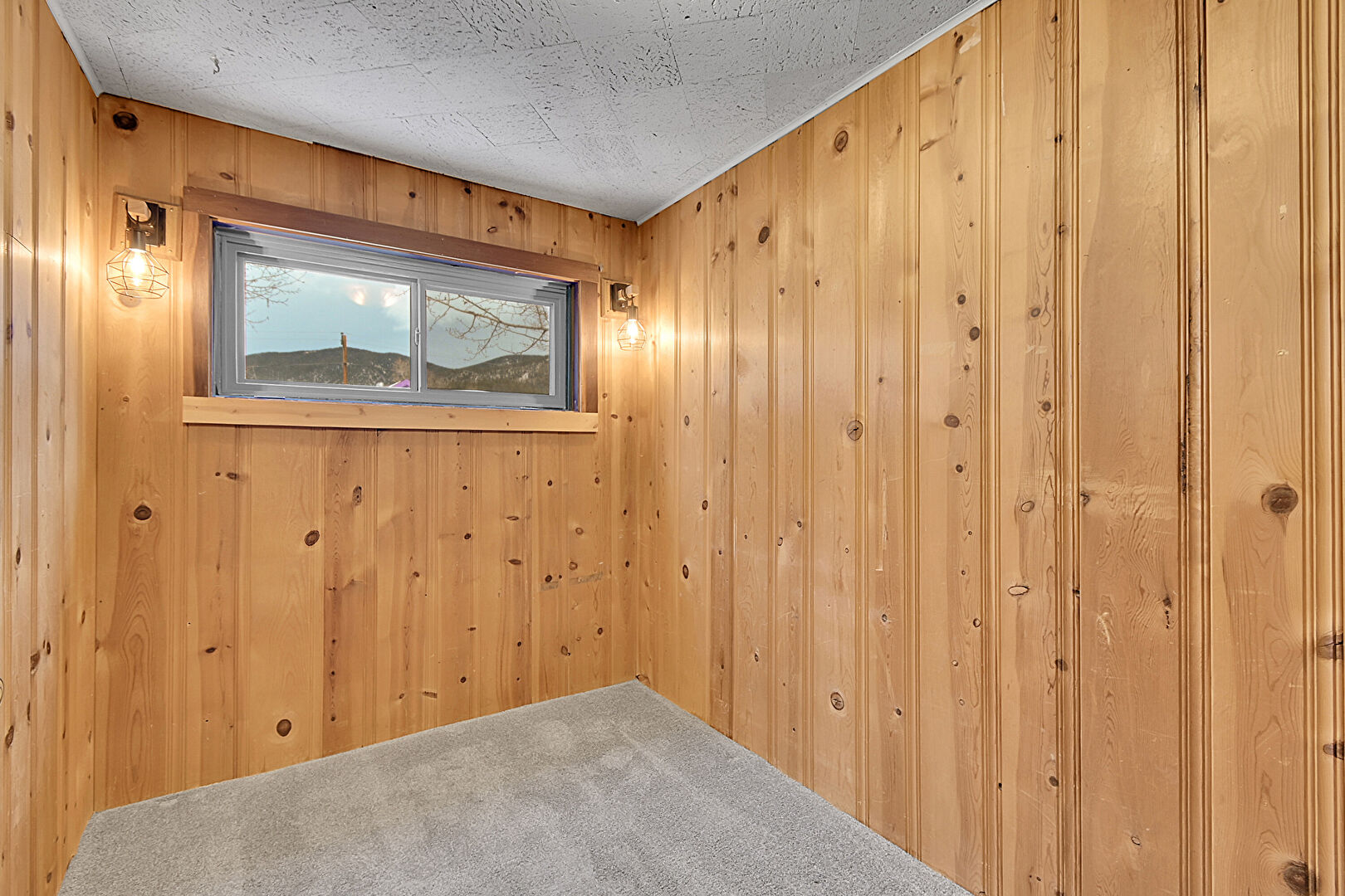 Baseboards Wall, Carpet, Natural Light, Space Heater, Textured Ceiling, Wood Wall, Natural Light, Textured Ceiling, Wood Wall