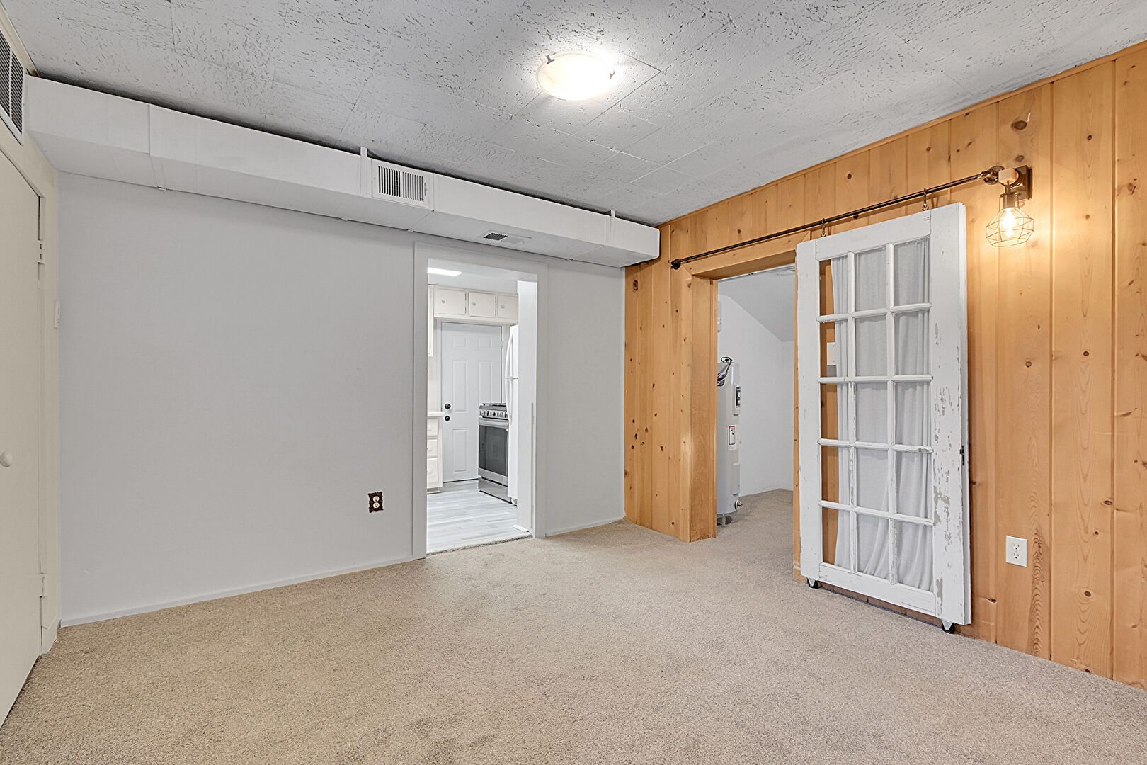 Baseboards Wall, Built In Shelves, Carpet, Drywall, Fire Alarm, Natural Light, Textured Ceiling, Vent, Water Heater, Wood Wall, Drywall, Smoke Carbon Monoxide Detector, Vent