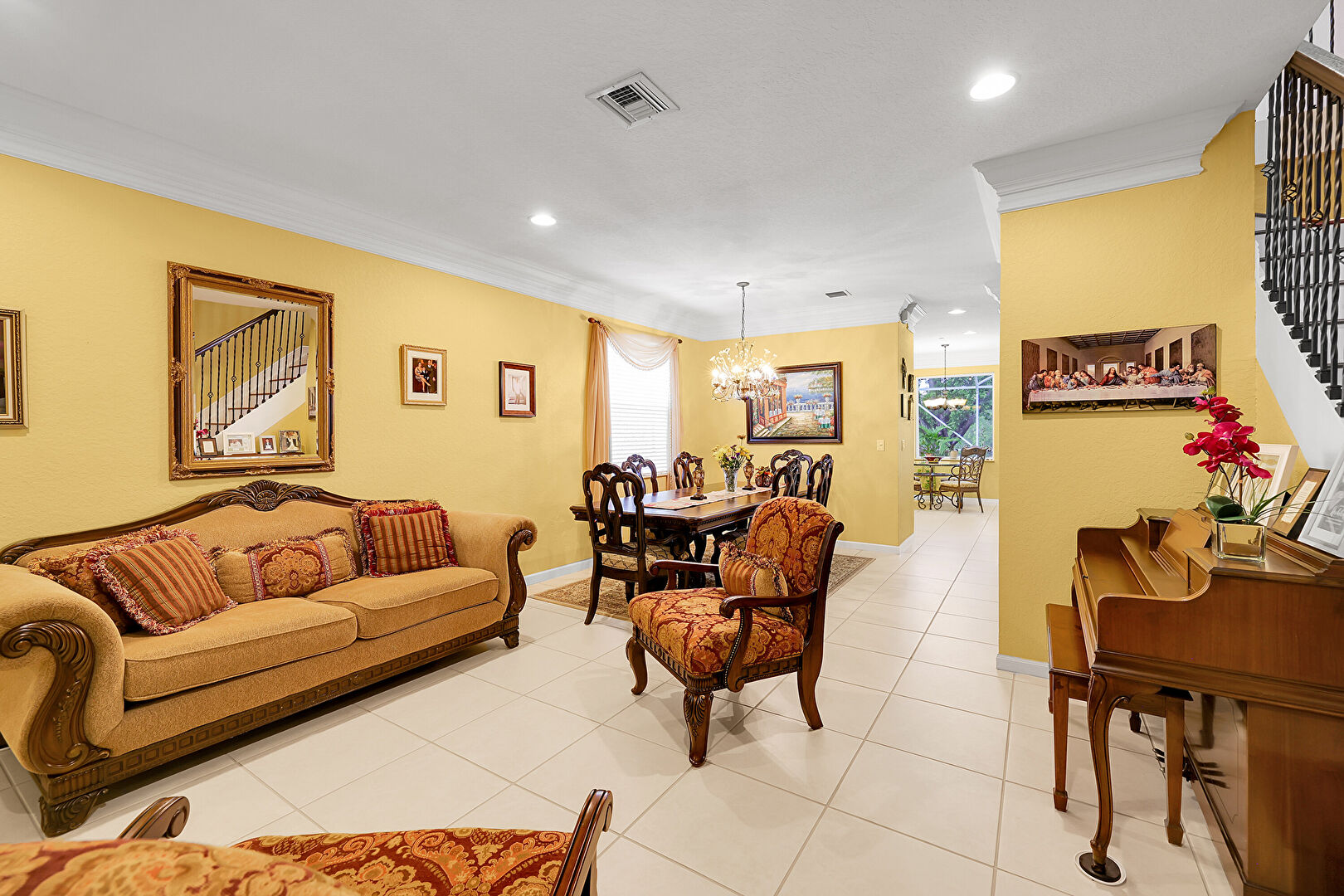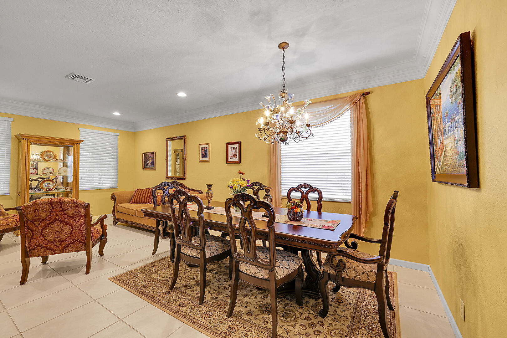 Baseboards Wall, Crown Molding, Natural Light, Notable Chandelier, Recessed Lighting, Tile Floor, Vent, Drywall