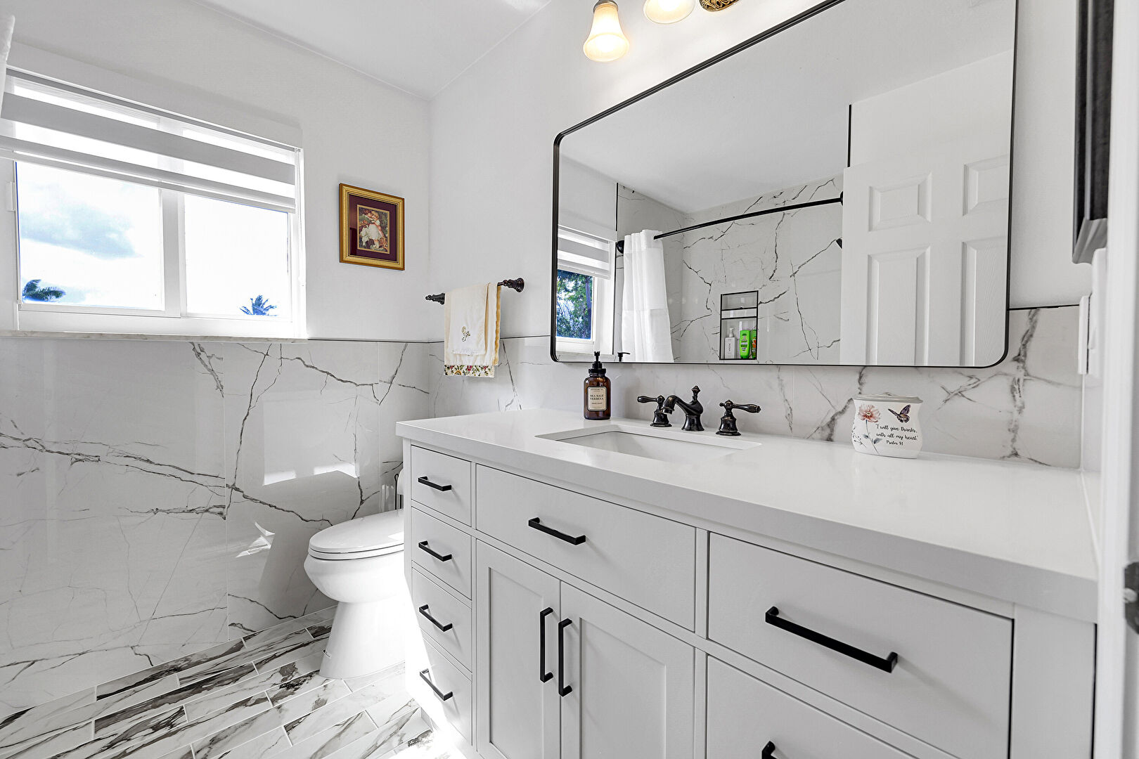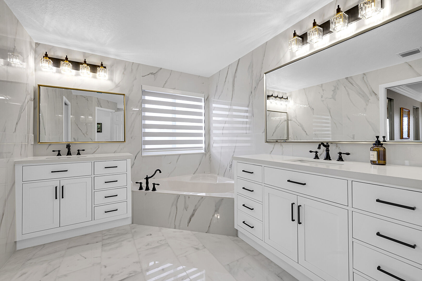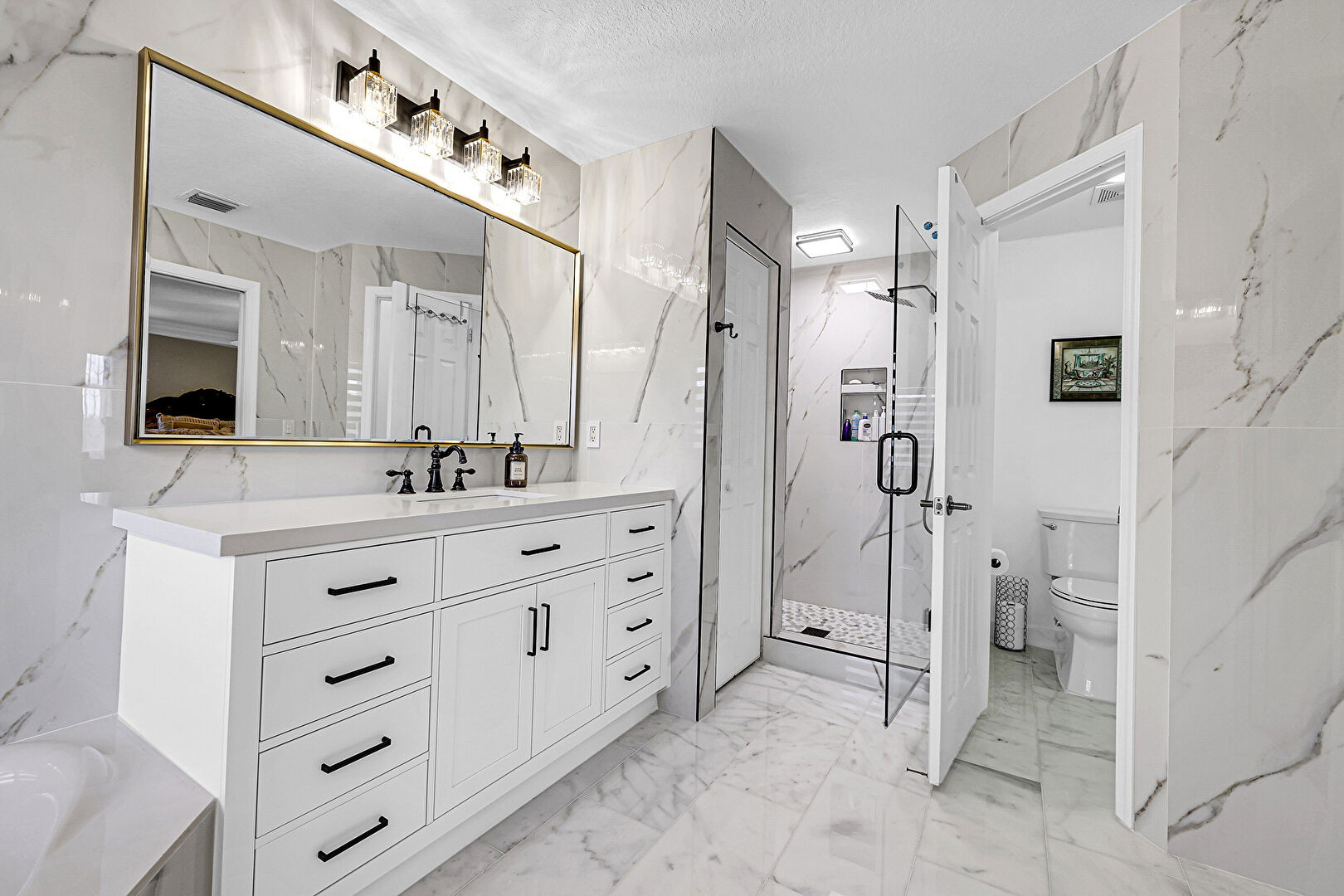 Combined Bath Shower, Drywall, Full Bathroom, Marble Finish Floor, Marble Wall, Natural Light, Radiator, Tile Wall, Vanity, Vent, Wainscot Wall, Water Closet, Crown Molding, Drywall, Marble Finish Floor, Natural Light, Two Single Vanities