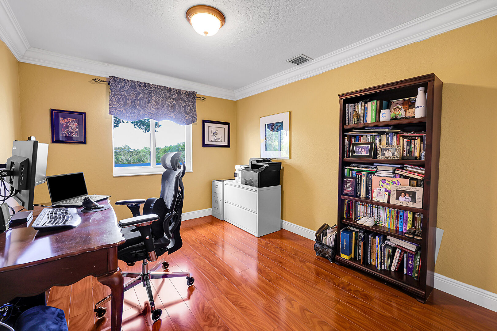 Baseboards Wall, Ceiling Fan, Crown Molding, Drywall, Natural Light, Office Area, Smoke Carbon Monoxide Detector, Textured Ceiling, Vent, Wood Finish Floor, Baseboards Wall, Drywall, Natural Light