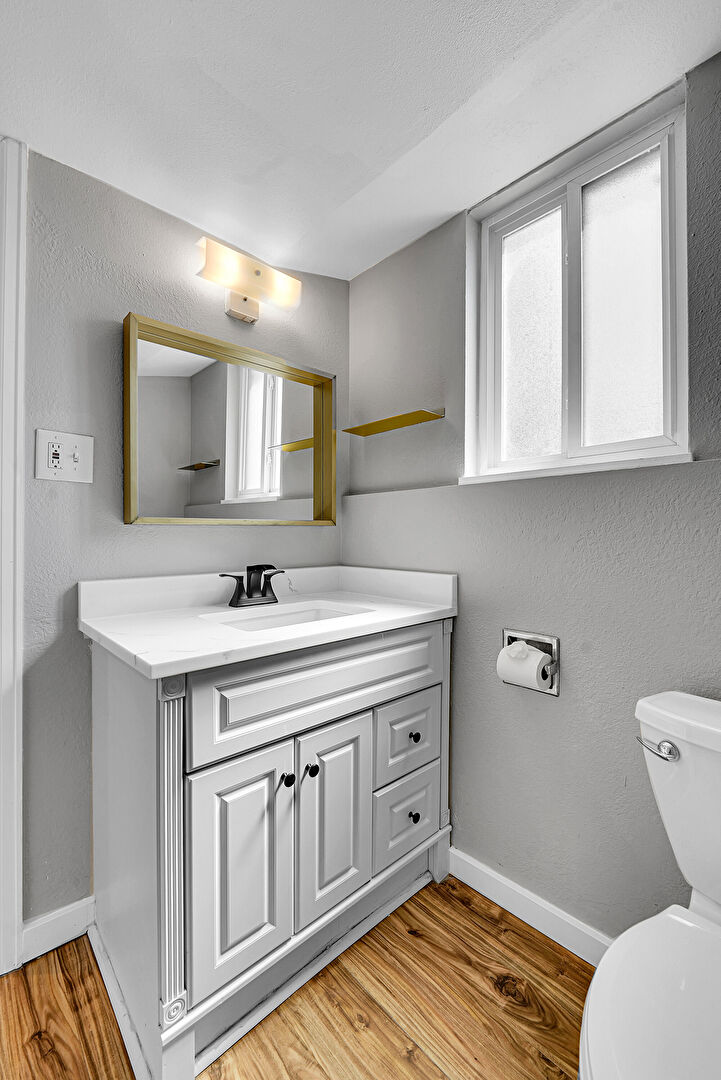 Baseboards Wall, Drywall, Full Bathroom, Half Bathroom, Natural Light, Textured Ceiling, Textured Wall, Vanity, Wood Finish Floor, Full Bathroom, Natural Light, Textured Ceiling