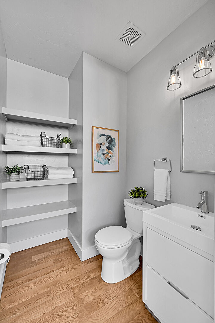 Baseboards Wall, Drywall, Laundry, Natural Light, Vent, Wood Finish Floor, Wood Wall, Natural Light, Recessed Lighting
