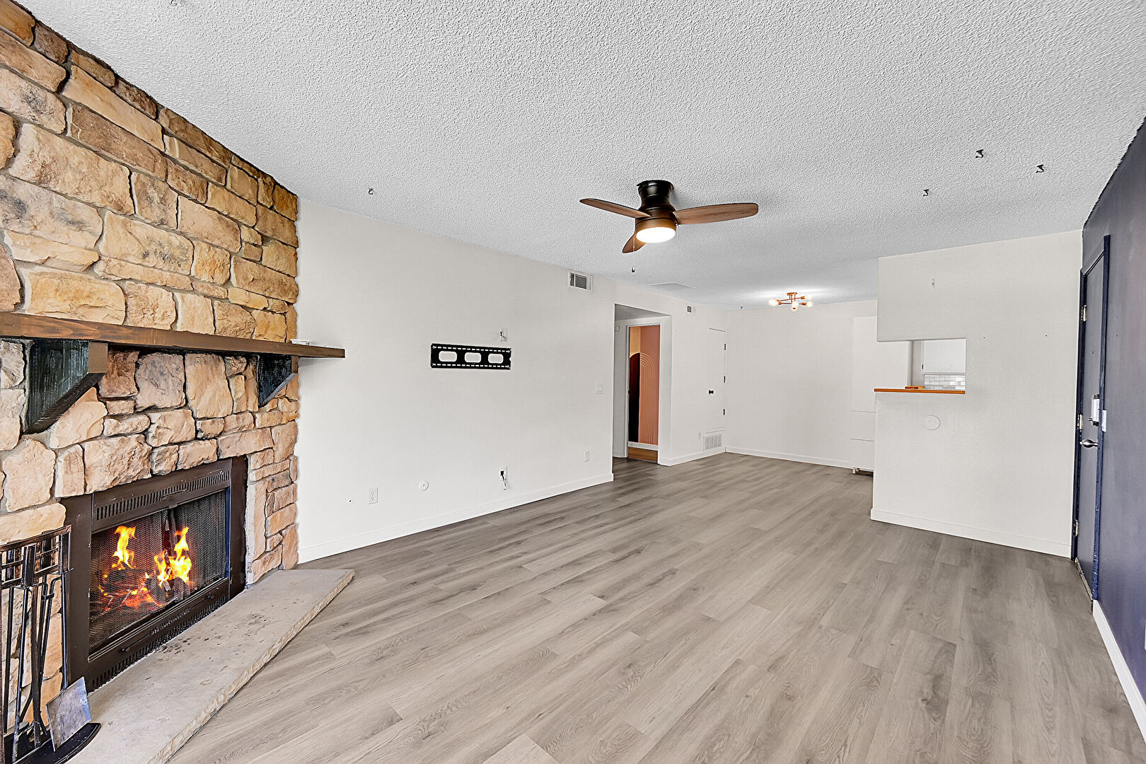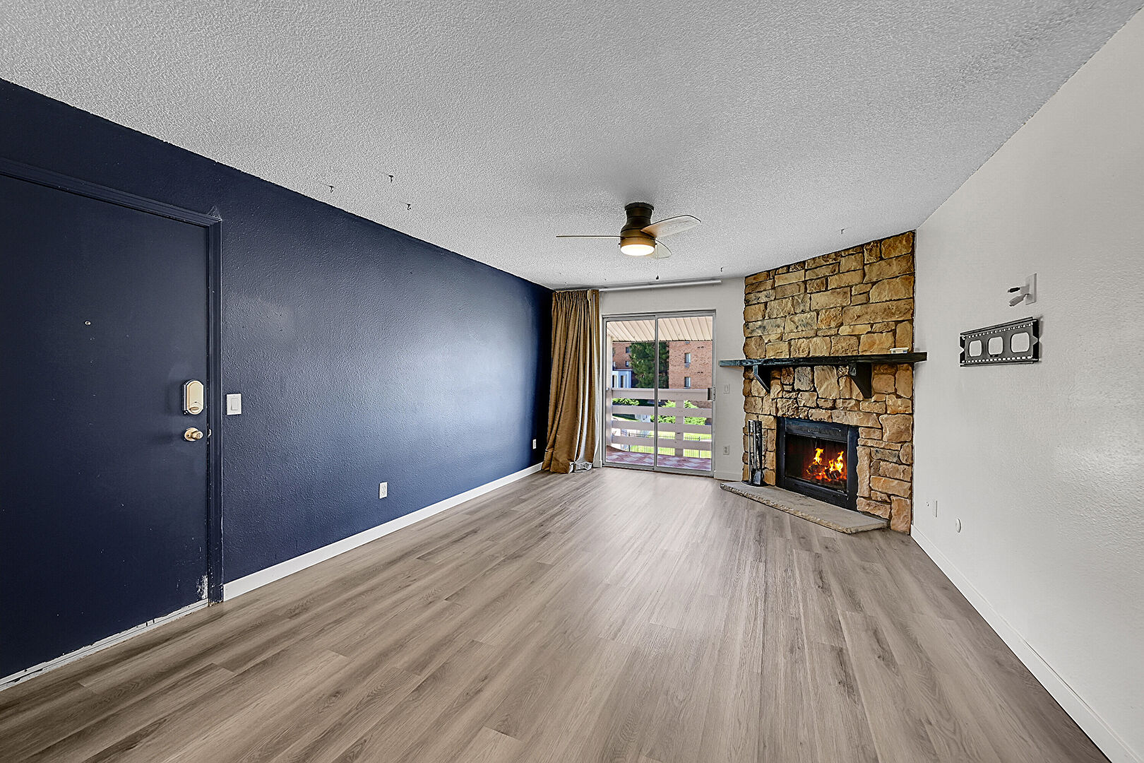 Baseboards Wall, Ceiling Fan, Drywall, Fireplace, Natural Light, Textured Ceiling, Textured Wall, Vent, Wood Finish Floor, Baseboards Wall, Textured Ceiling