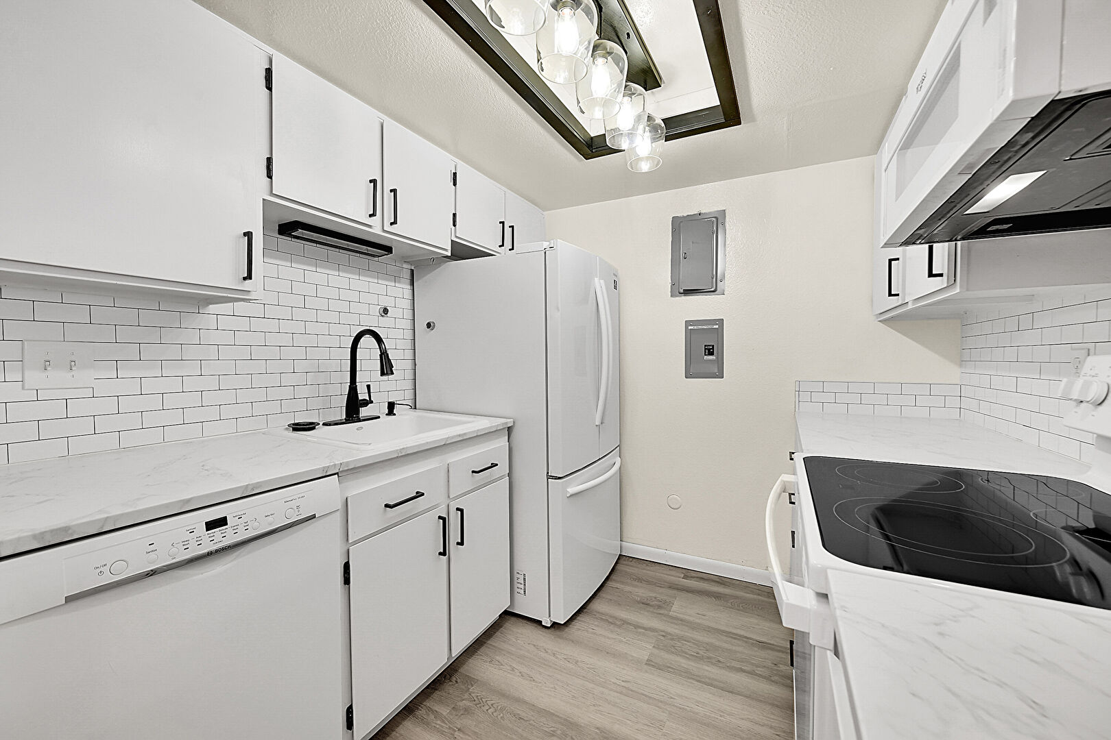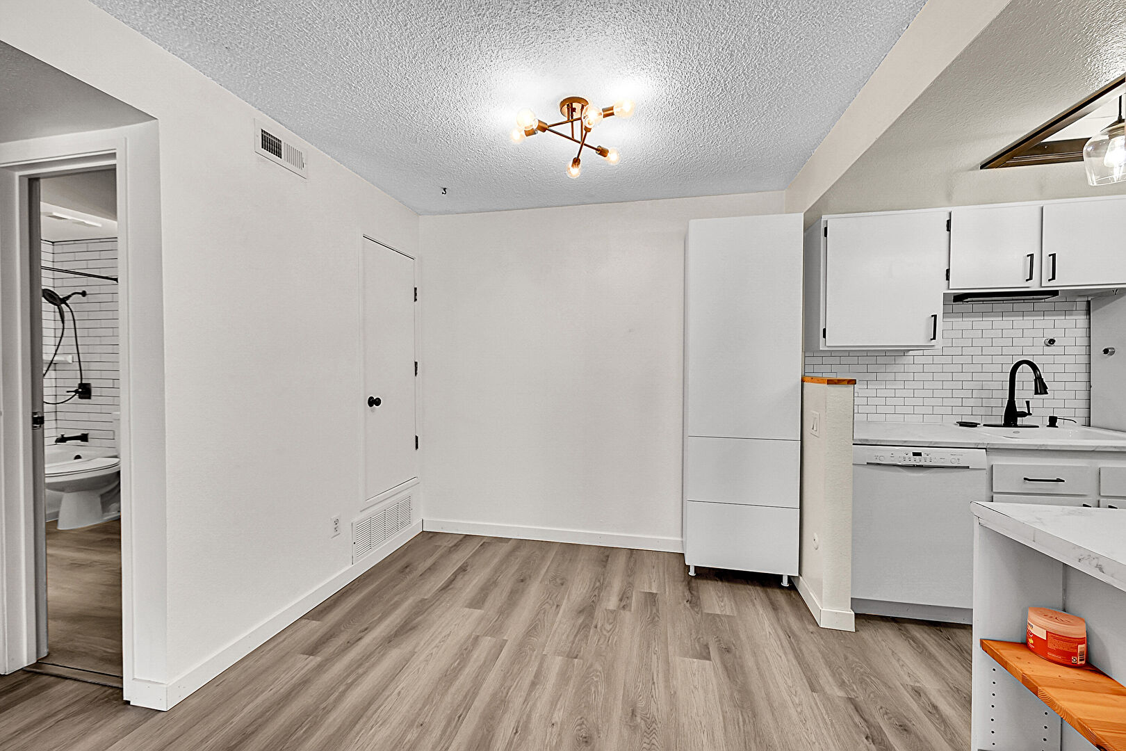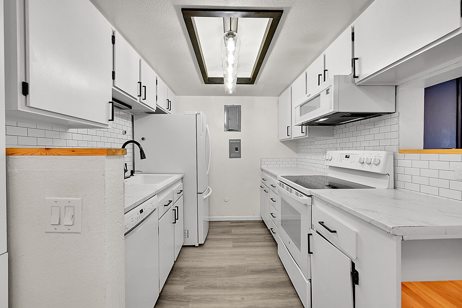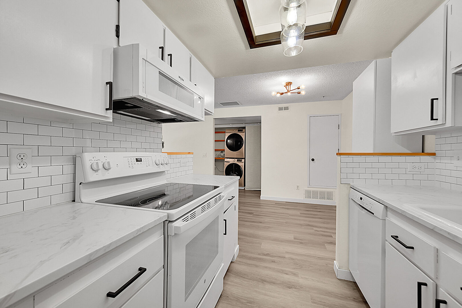 Baseboards Wall, Drywall, Electric Panel, Galley Kitchen, Laundry, Stone Countertops, Textured Ceiling, Vent, Visible Hinge Cabinets, Wood Finish Floor, Drywall, Stone Countertops, Textured Ceiling