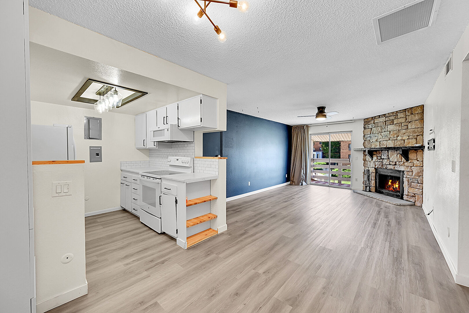 Baseboards Wall, Ceiling Fan, Drywall, Fireplace, Natural Light, Notable Chandelier, Open Shelves, Opens To Living Area, Textured Ceiling, Vent, Visible Hinge Cabinets, Wood Finish Floor, Textured Ceiling, Vent