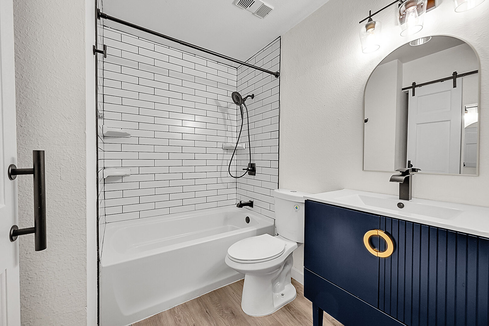 Combined Bath Shower, Full Bathroom, Textured Wall, Vanity, Wood Finish Floor, Vent