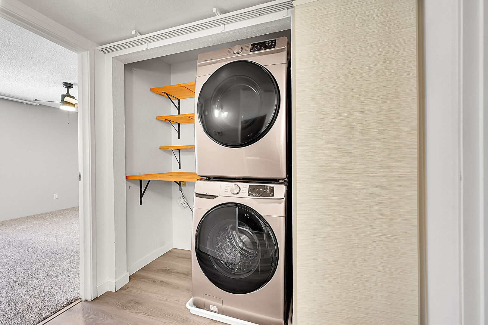 Baseboards Wall, Carpet, Ceiling Fan, Drywall, Laundry, Wood Finish Floor, Textured Ceiling