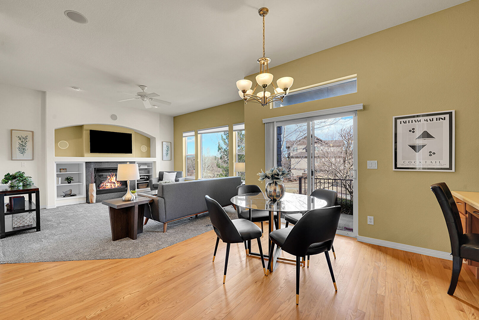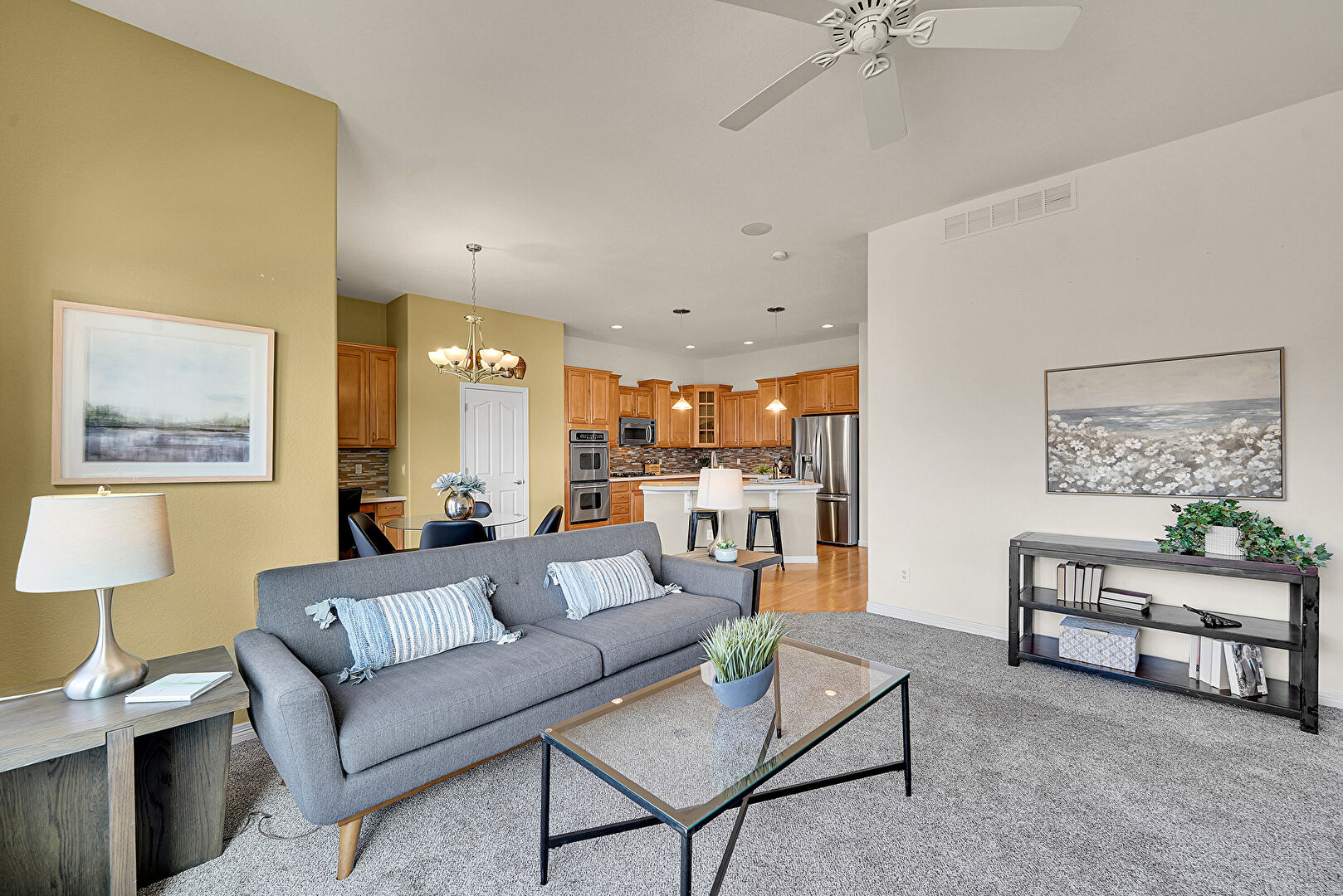 Baseboards Wall, Built In Shelves, Carpet, Double Oven, Drywall, Fireplace, L Shaped Kitchen, Natural Light, Notable Chandelier, Recessed Lighting, Vent, Ceiling Fan