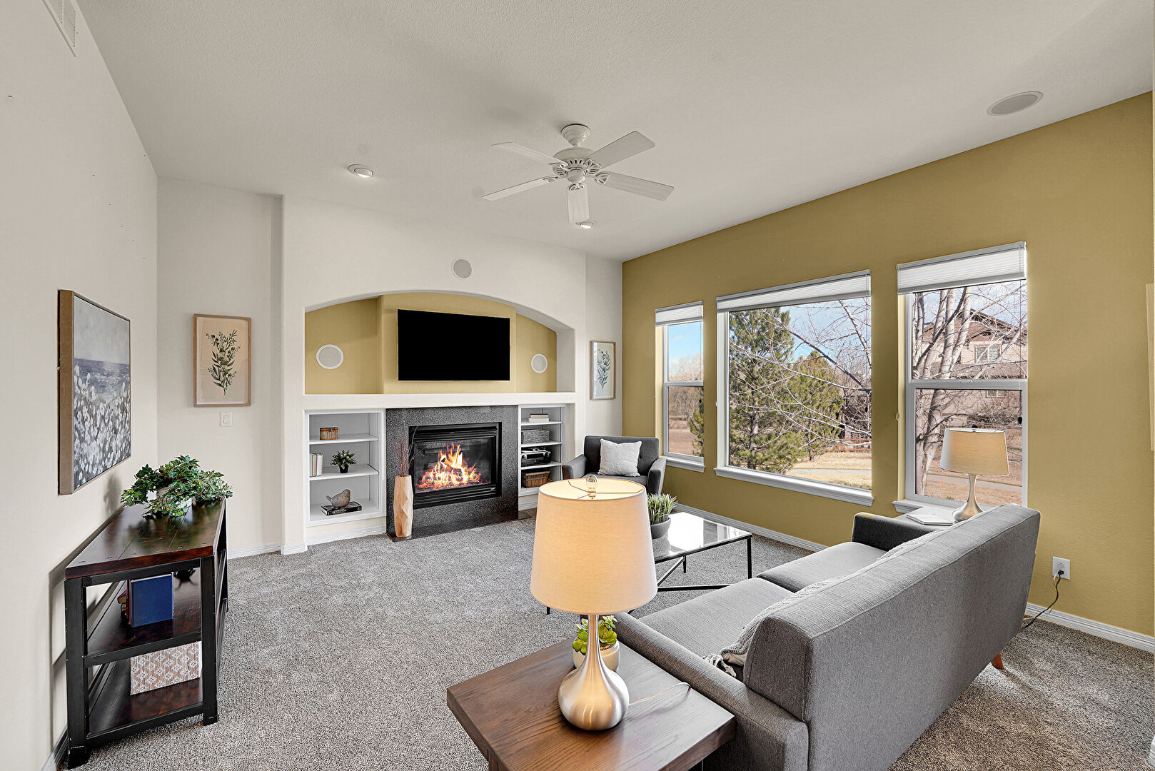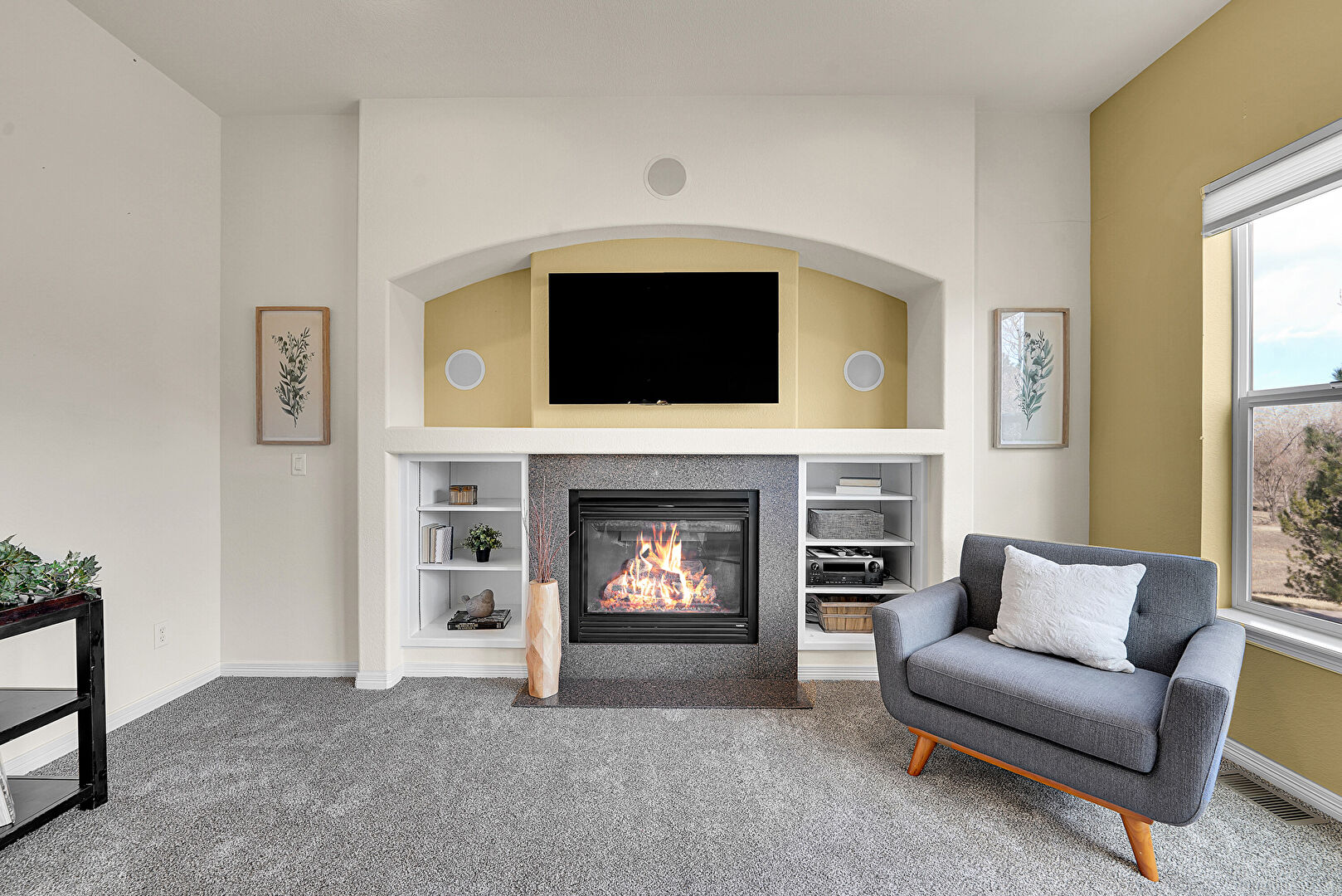 Built In Shelves, Carpet, Drywall, Fireplace, Natural Light, Vent, Baseboards Wall