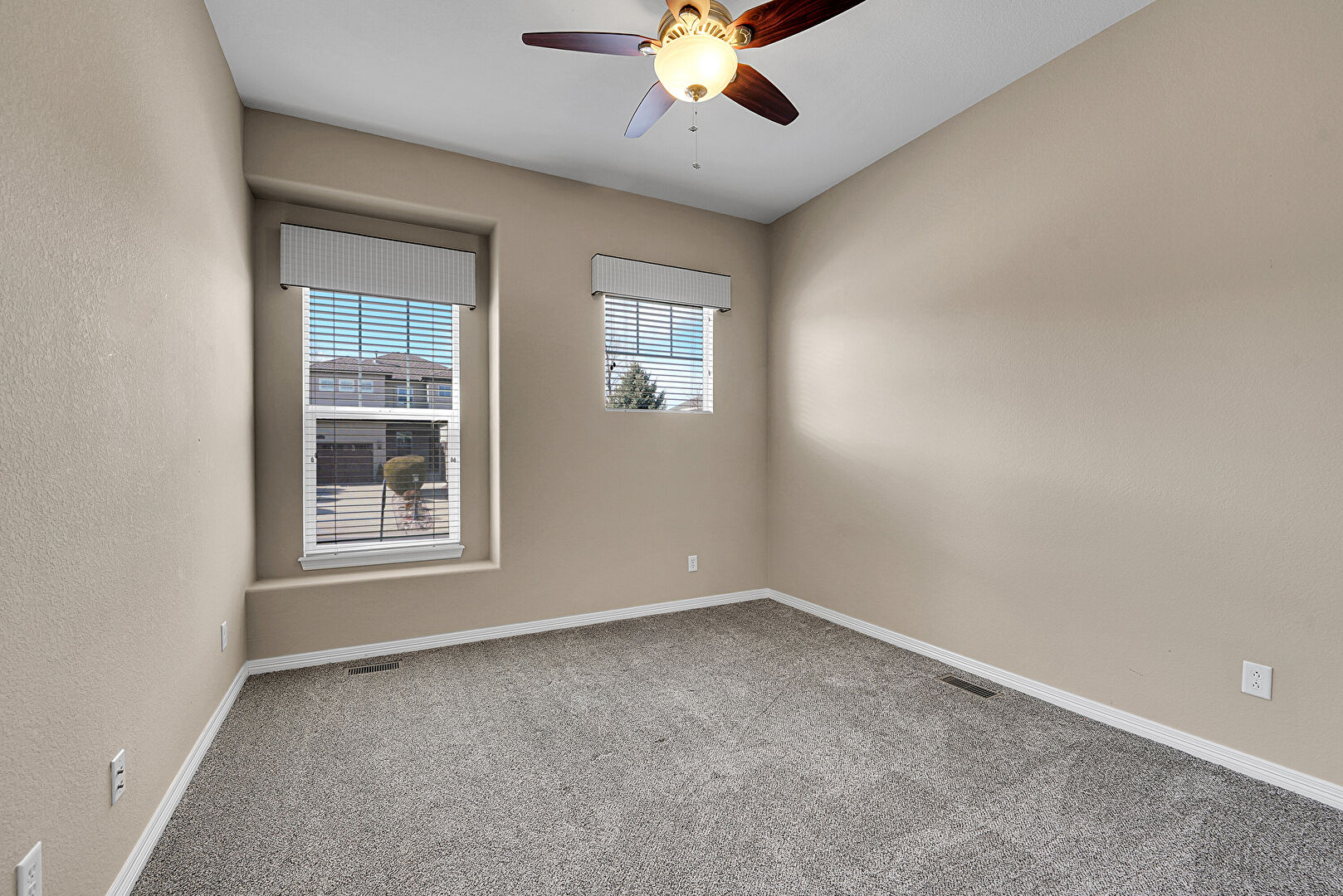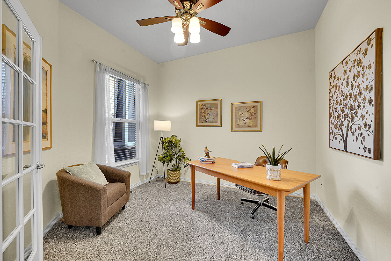 Carpet, Ceiling Fan, Drywall, Natural Light, Office Area, Baseboards Wall