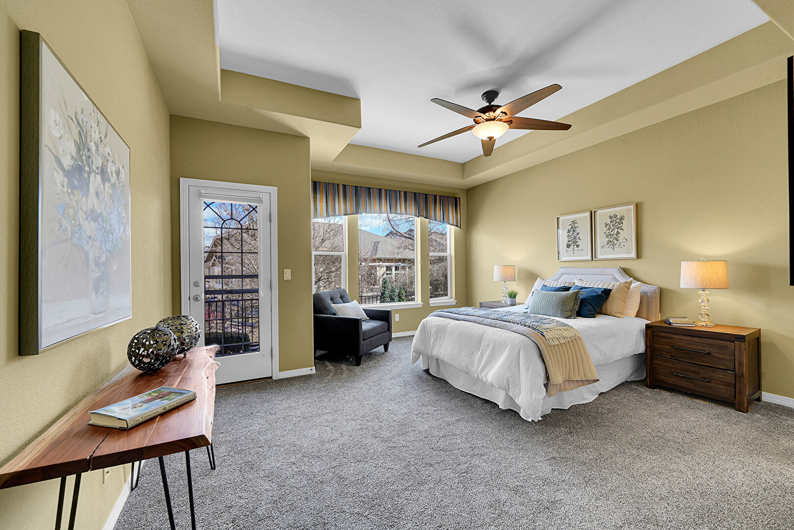 Access To Exterior, Baseboards Wall, Carpet, Ceiling Fan, Drywall, Ensuite Bathroom, Natural Light, Tray Ceiling, Ceiling Fan, Tray Ceiling
