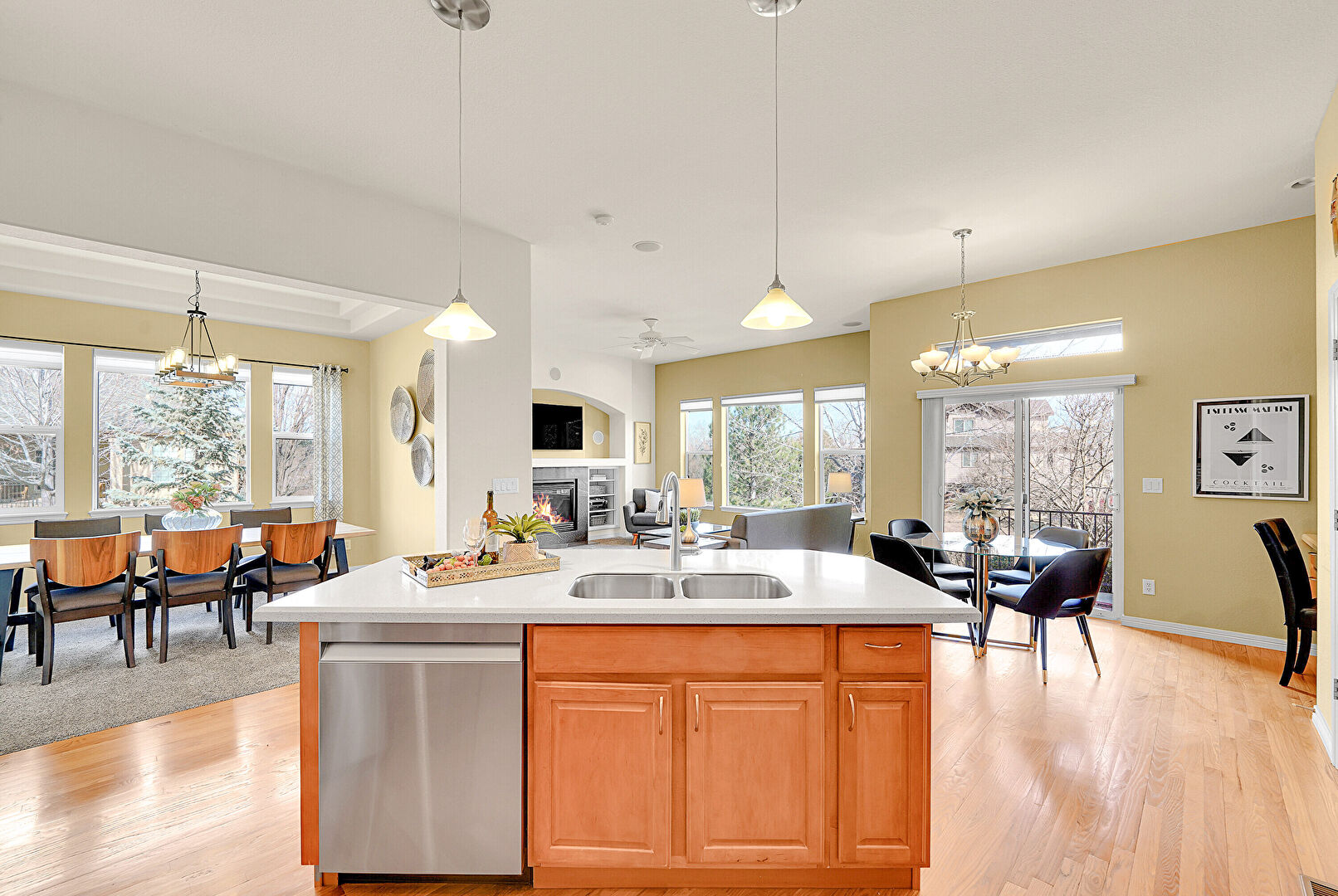 Baseboards Wall, Crown Molding Cabinets, Double Oven, Drywall, Glass Insert Cabinets, Kitchen Bar, Kitchen Island, L Shaped Kitchen, Medium Brown Cabinets, Natural Light, Notable Chandelier, Opens To Living Area, Pendant Lighting, Raised Cabinets, Recessed Lighting, Smoke Carbon Monoxide Detector, Stone Countertops, Vent, Wood Finish Floor, Pendant Lighting, Raised Cabinets