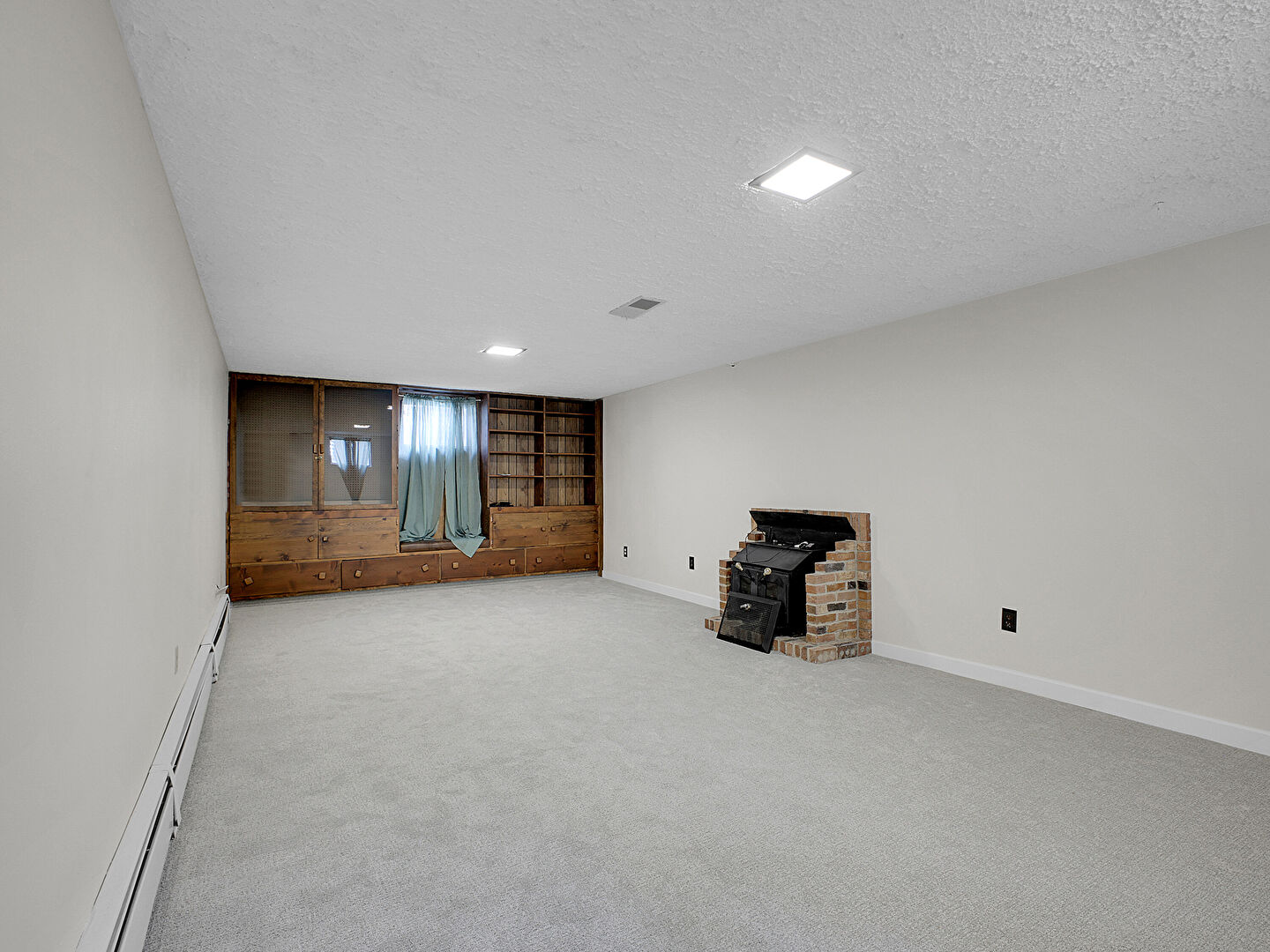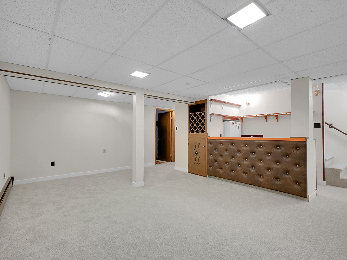 Accent Wall, Baseboard Radiator, Baseboards Wall, Basement, Carpet, Drop Ceiling, Drywall, Natural Light, Recessed Lighting, Textured Ceiling, Vent, Wood Stove, Wood Wall, Baseboards Wall, Basement, Carpet, Indoor Bar, Textured Ceiling, Vent, Wood Stove