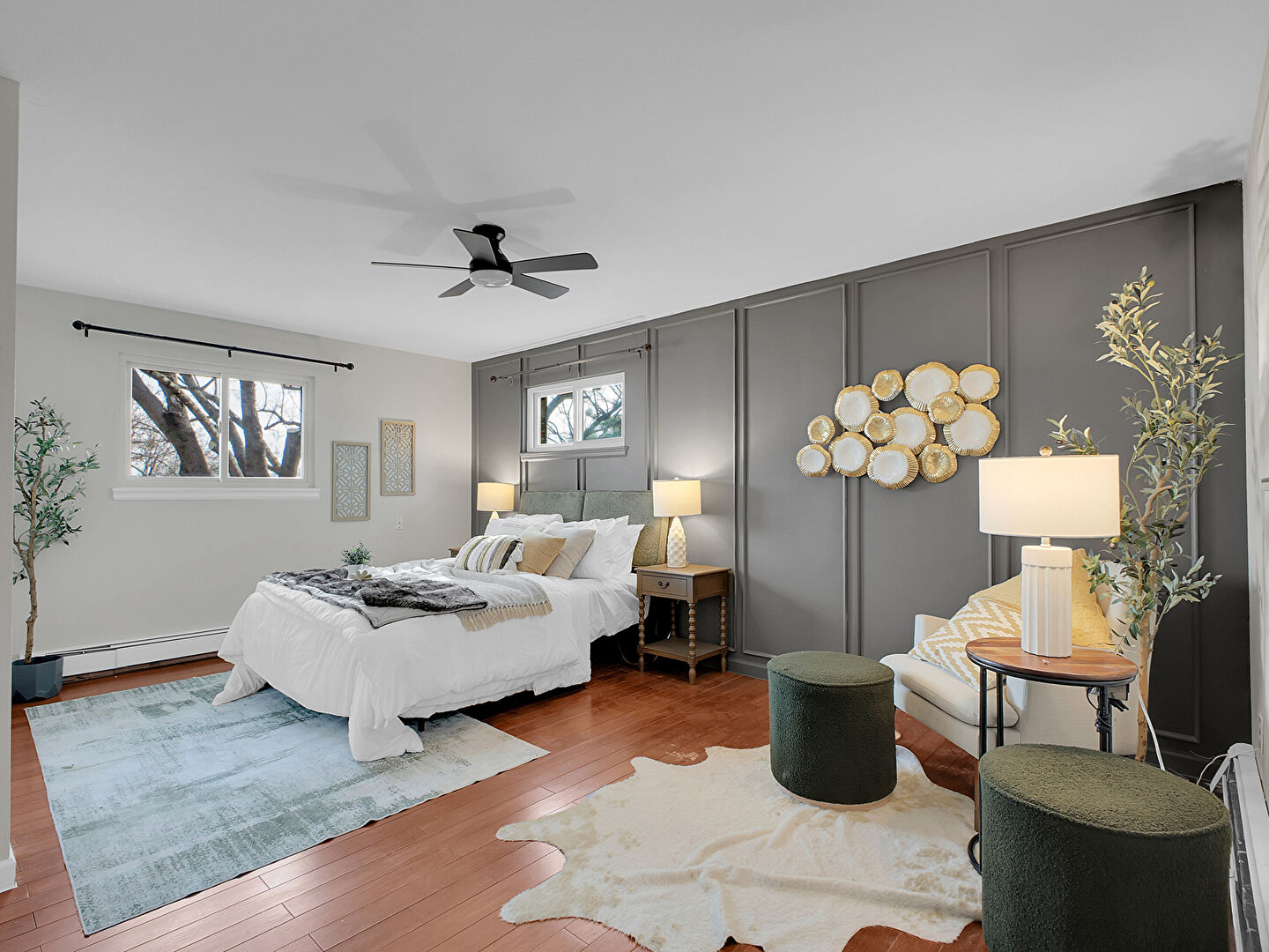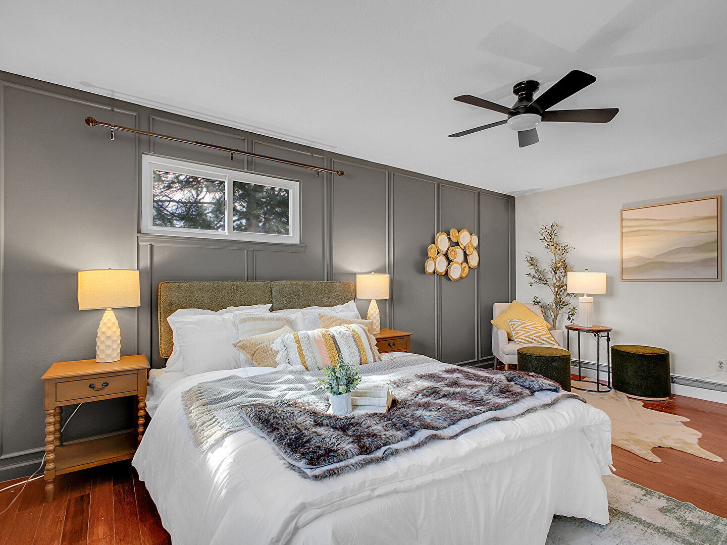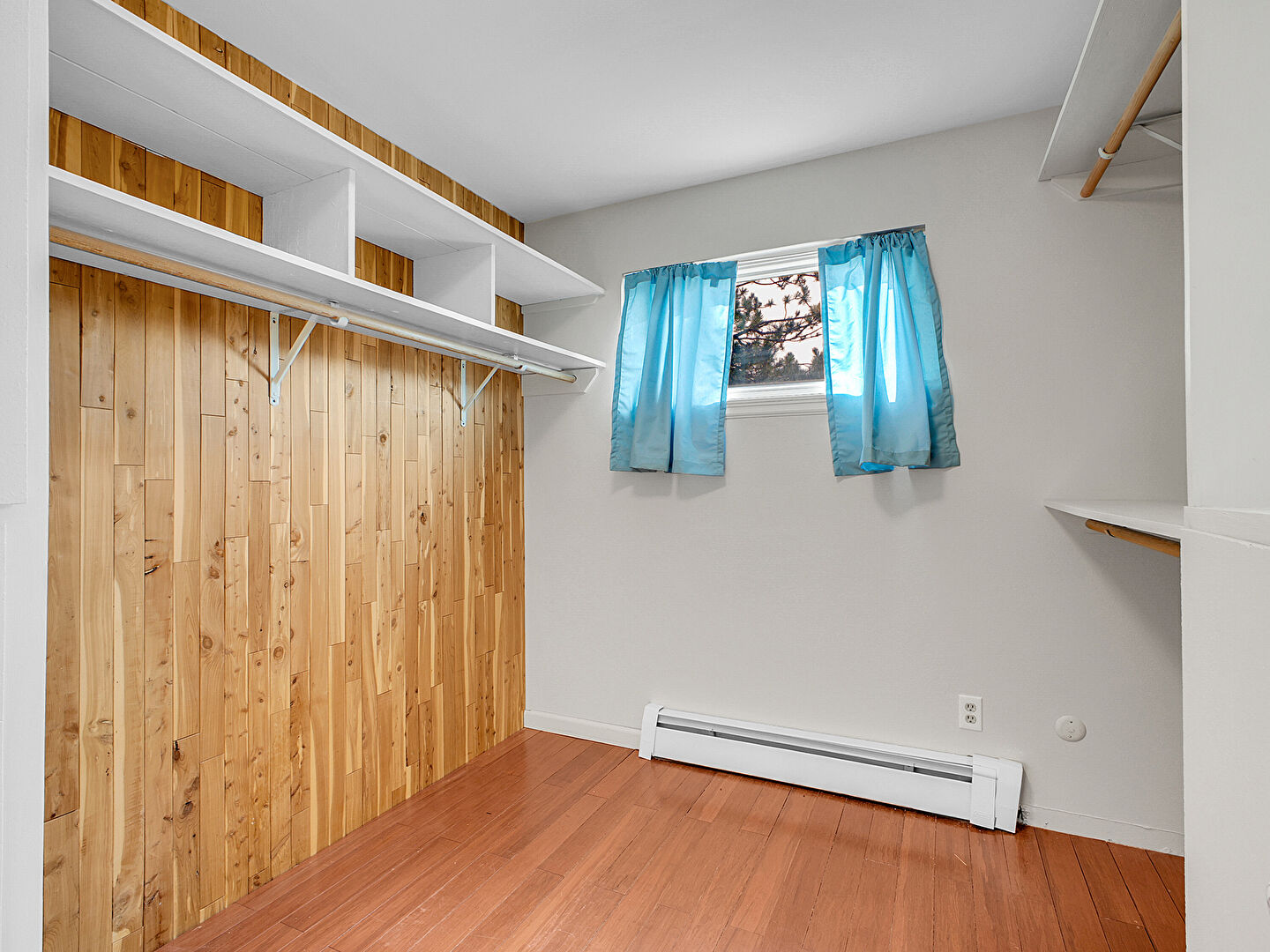 Baseboard Radiator, Baseboards Wall, Ceiling Fan, Drywall, Natural Light, Paneling Wall, Two Closets, Wood Finish Floor, Accent Wall, Drywall, Wood Finish Floor