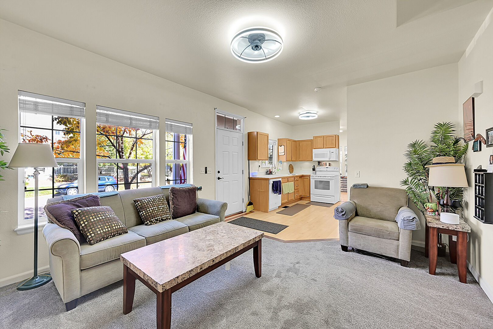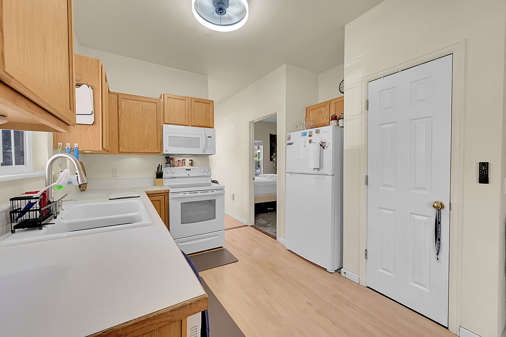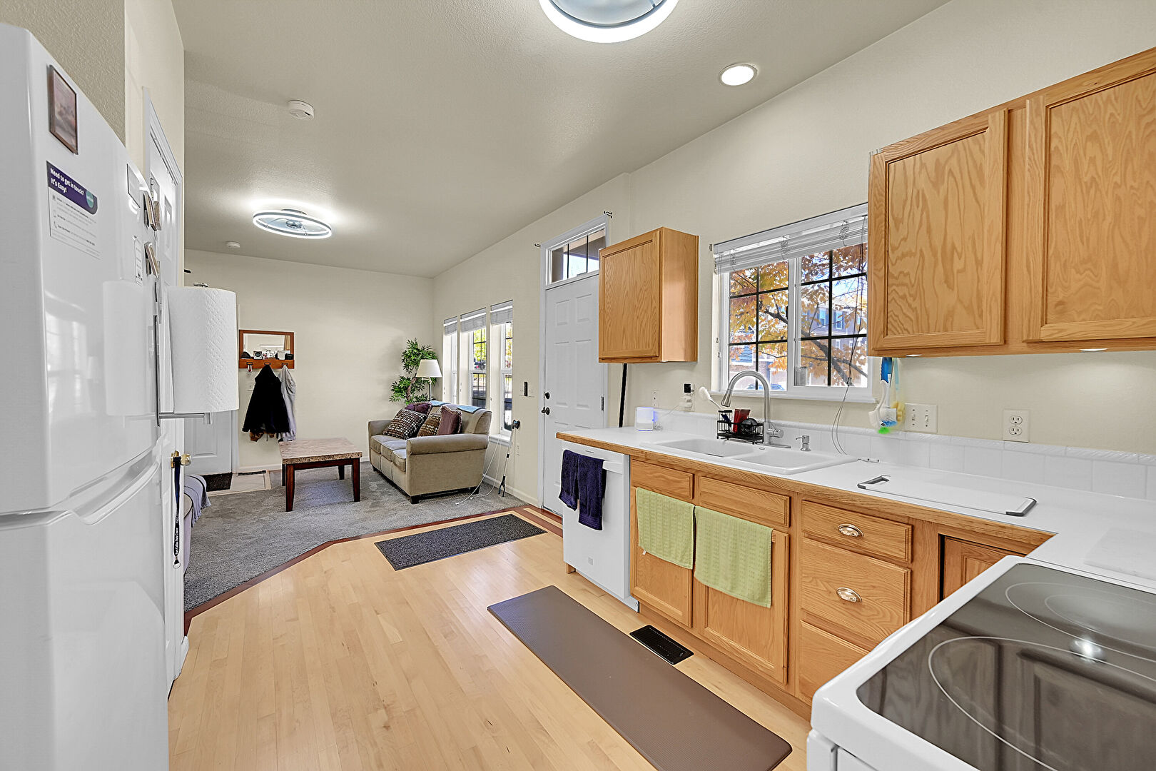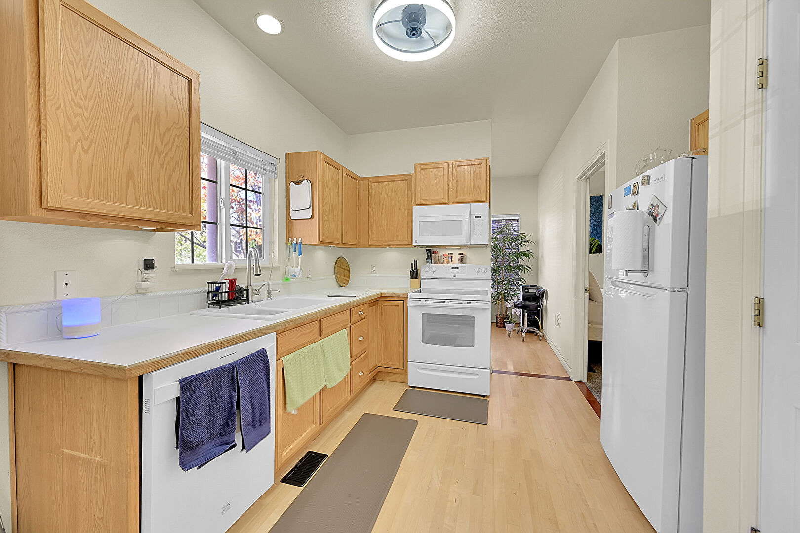 Baseboards Wall, Drywall, Medium Brown Cabinets, Natural Light, Opens To Living Area, Recessed Lighting, Shaker Cabinets, Smoke Carbon Monoxide Detector, U Shaped Kitchen, Wood Finish Floor, Natural Light, Recessed Lighting
