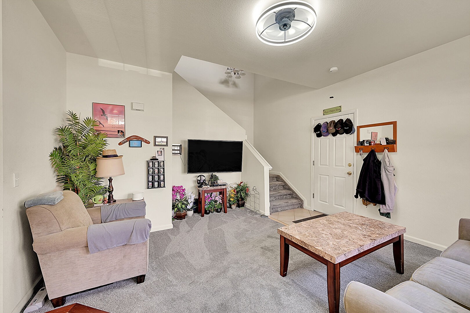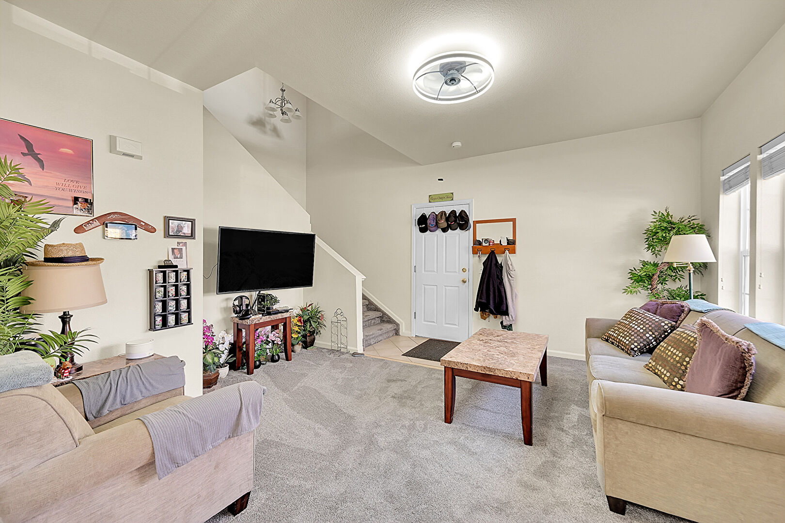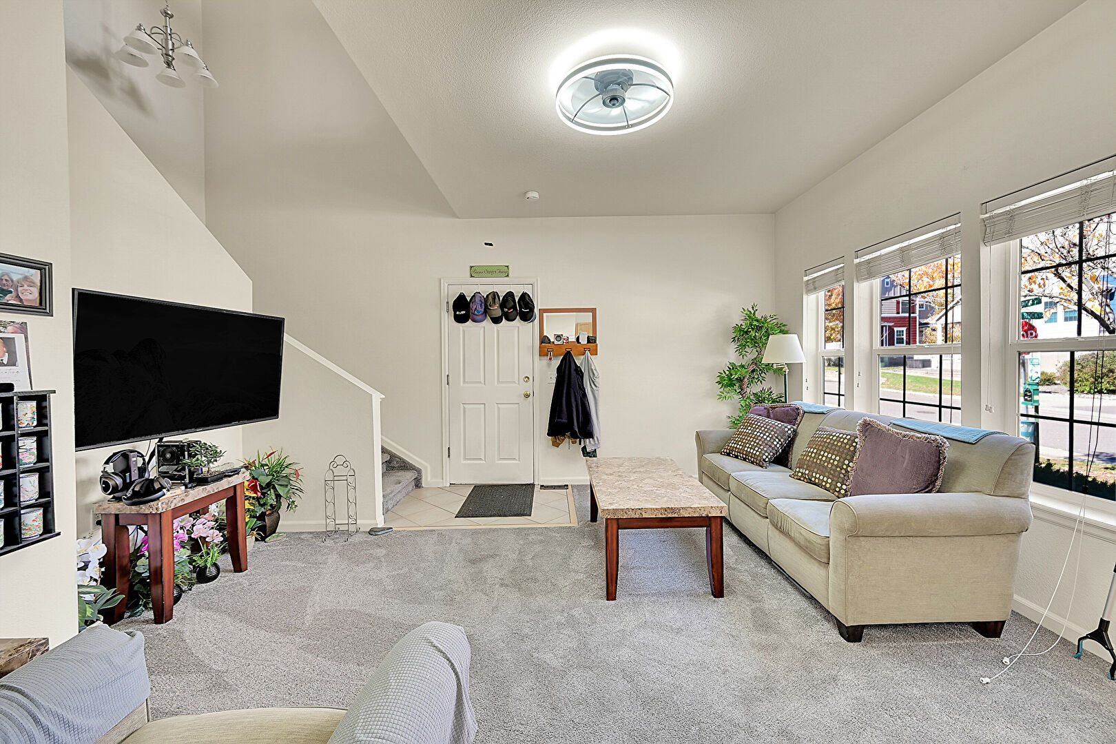 Baseboards Wall, Carpet, Drywall, Natural Light, Stairs, Vaulted Ceiling, Drywall, Stairs, Textured Ceiling
