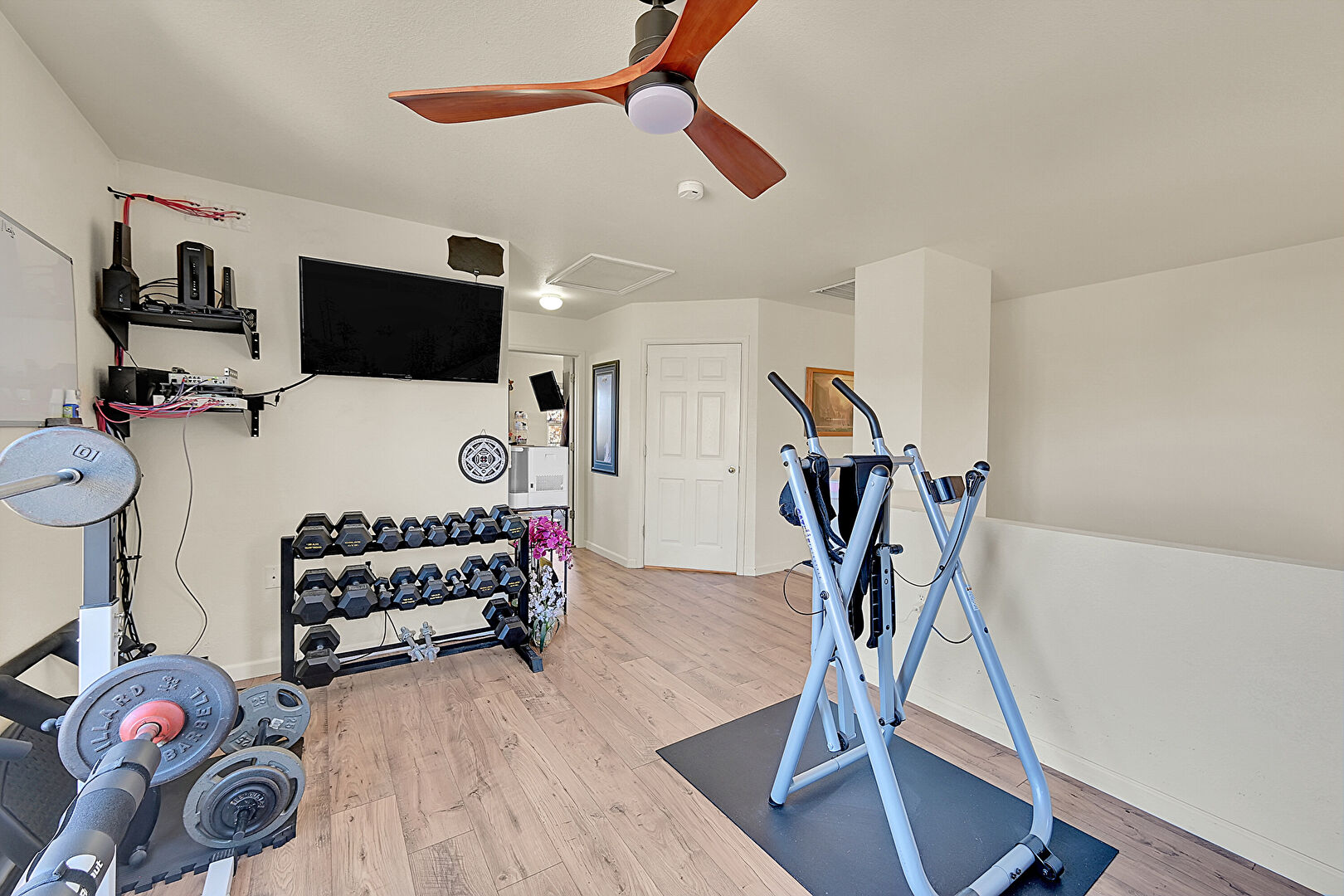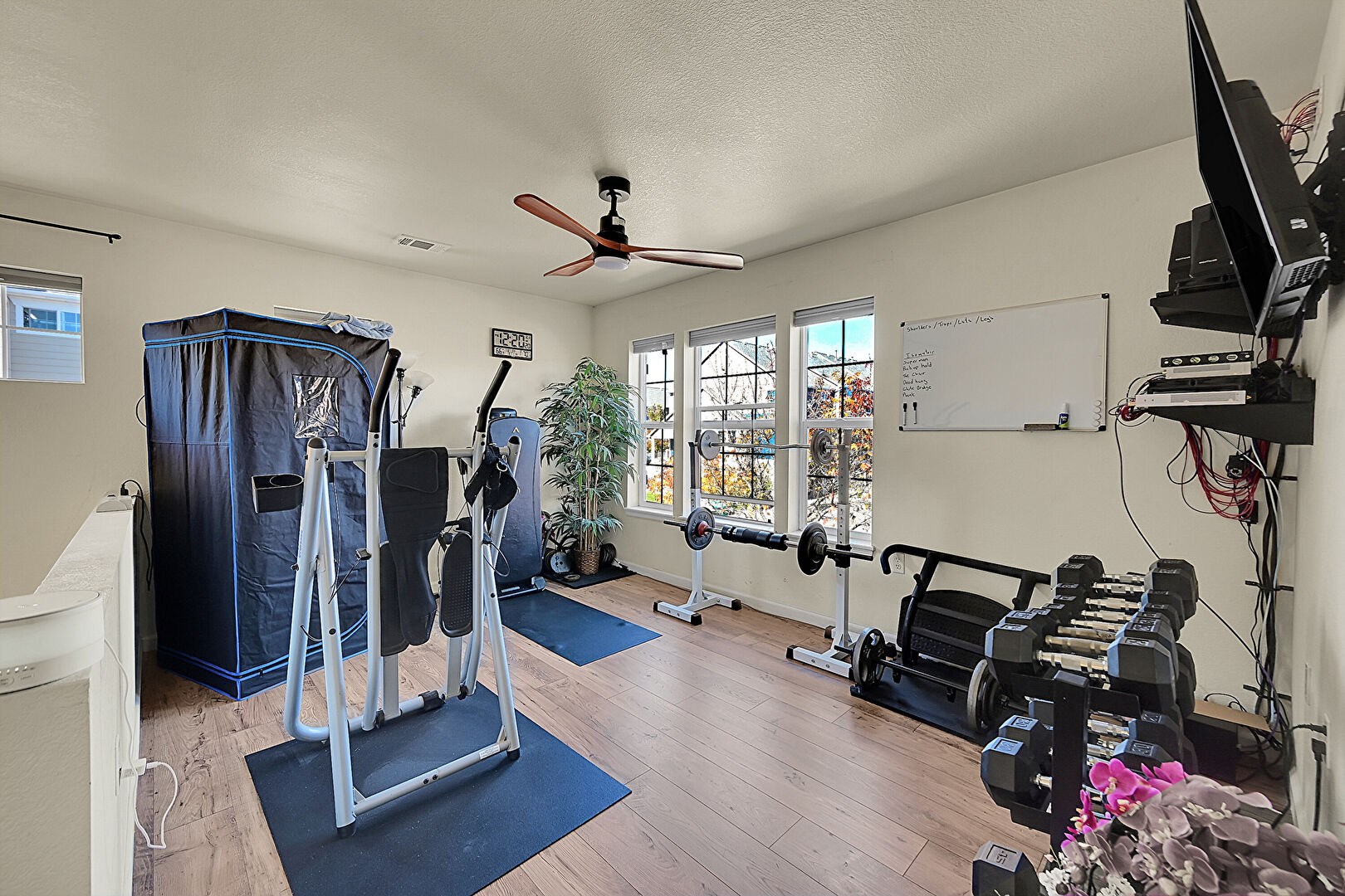 Baseboards Wall, Ceiling Fan, Drywall, Natural Light, Vent, Wood Finish Floor, Scuttle, Textured Ceiling
