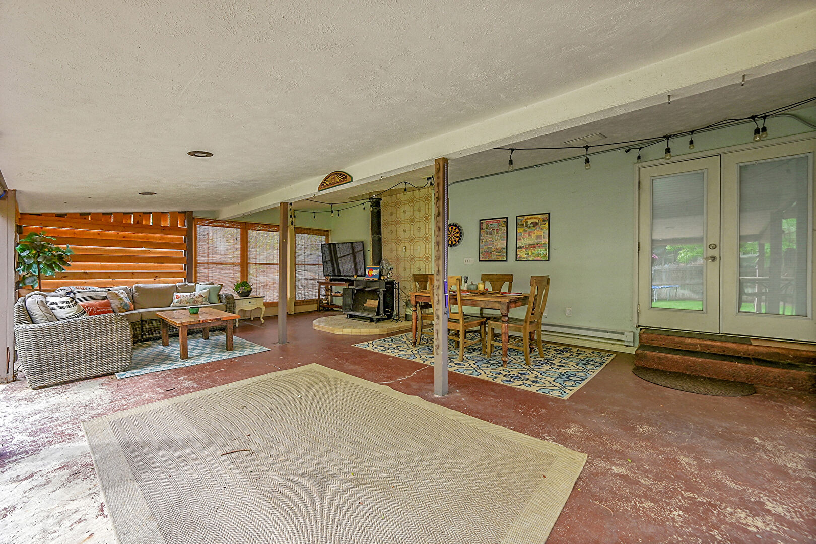 Concrete Floor, Drywall, French Doors, Natural Light, Textured Ceiling, Track Lighting, Vent, Wood Stove, Concrete Floor, Vaulted Ceiling