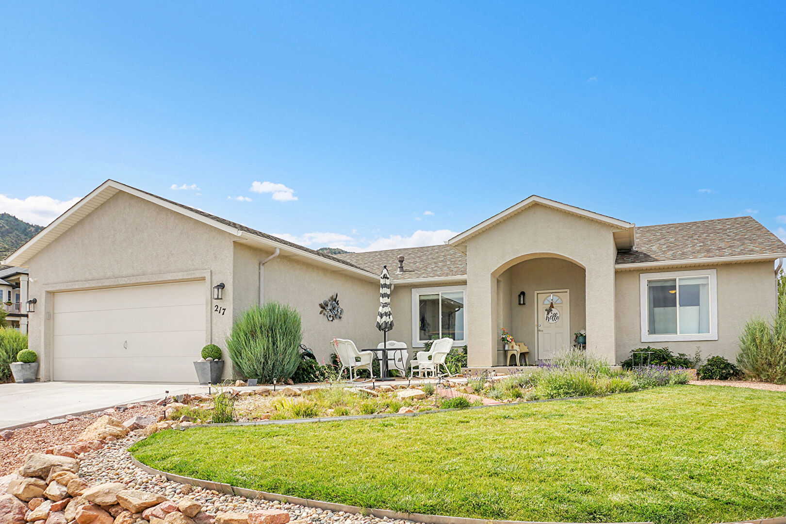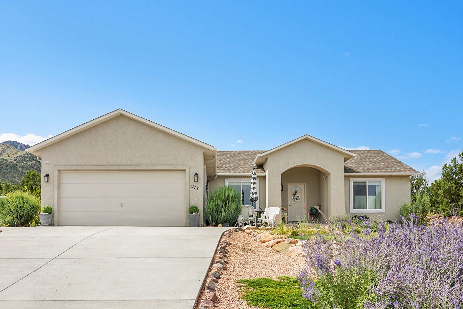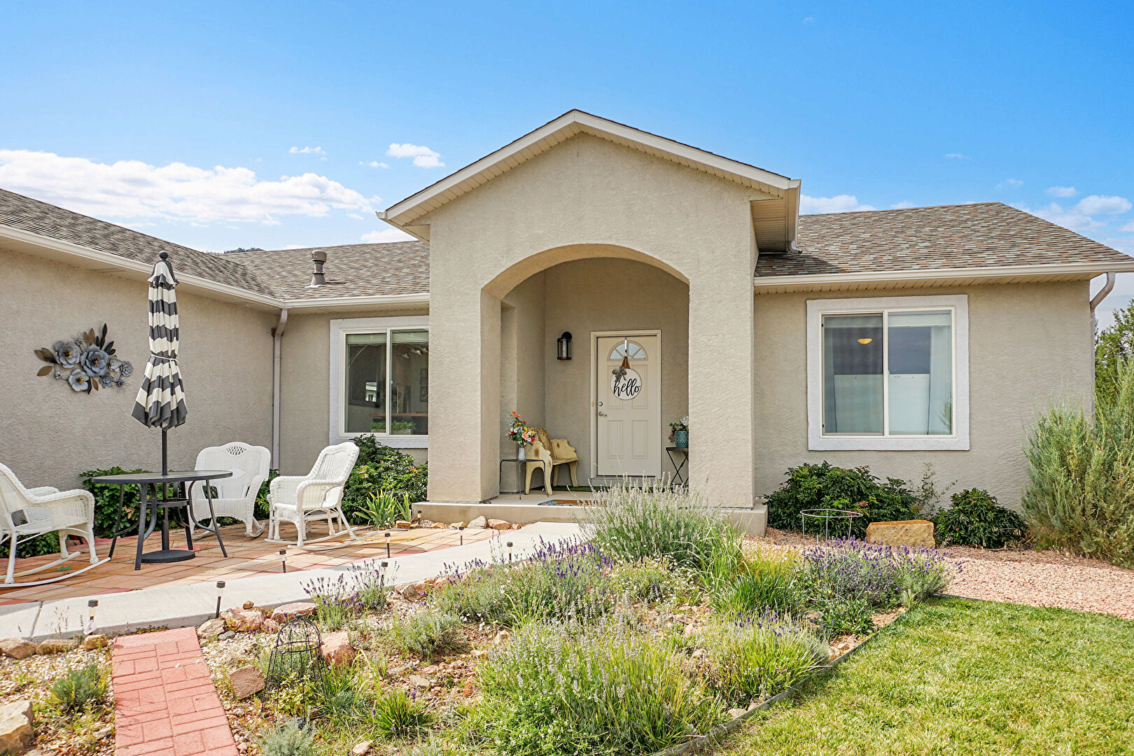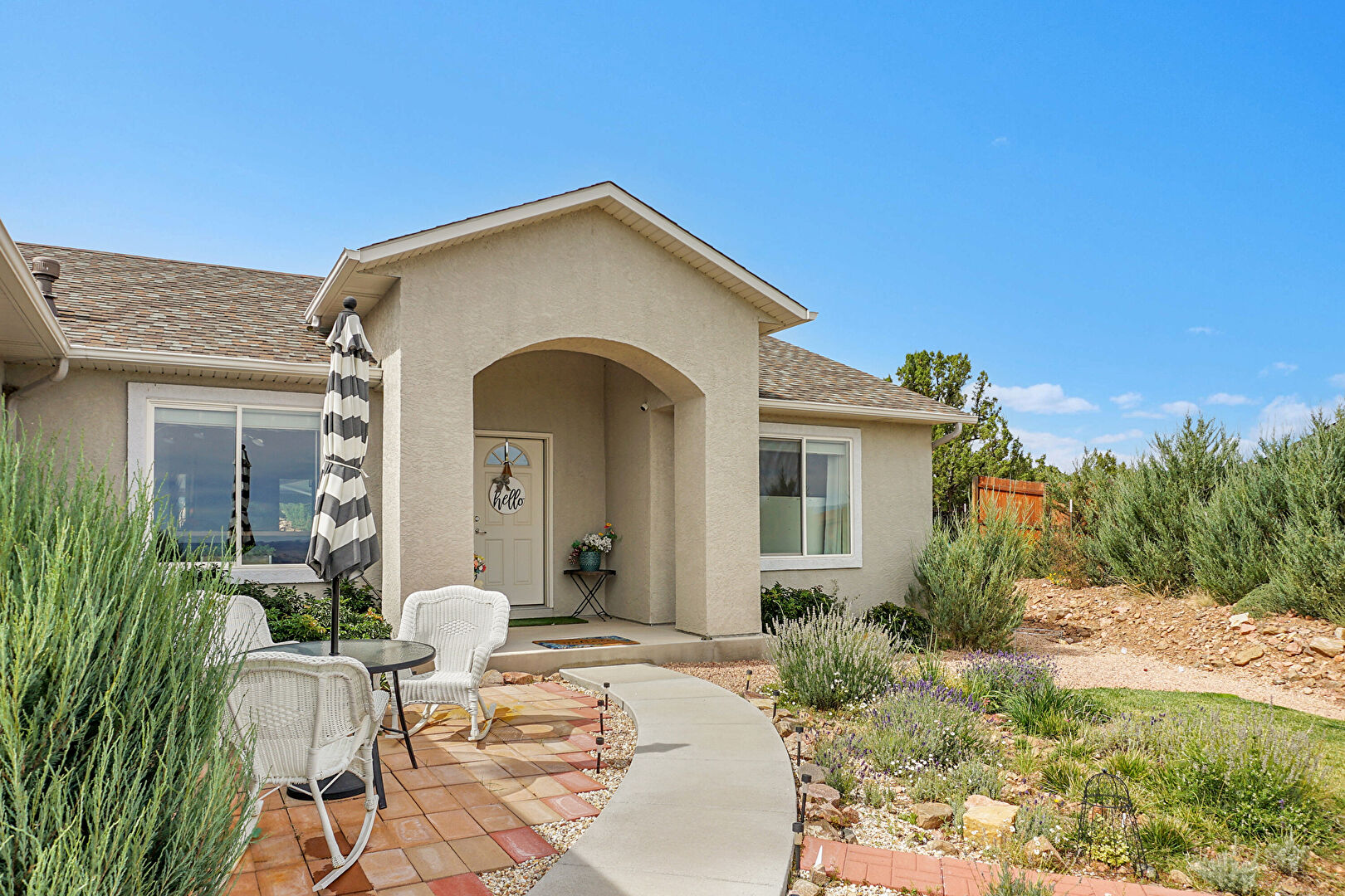 Downspout, Driveway, Fence, Gutters, Lawn, Patio, Porch, Shingle Roof, Stucco Siding, Downspout, Lawn, Shingle Roof, Stucco Siding