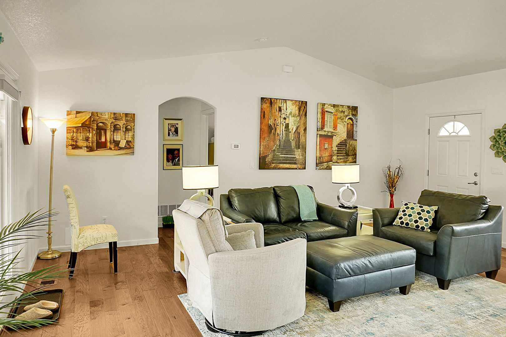 Arched Walkways, Baseboards Wall, Cathedral Ceiling, Drywall, French Doors, Natural Light, Textured Ceiling, Vaulted Ceiling, Vent, Wood Finish Floor, Drywall, High Ceiling, Wood Finish Floor