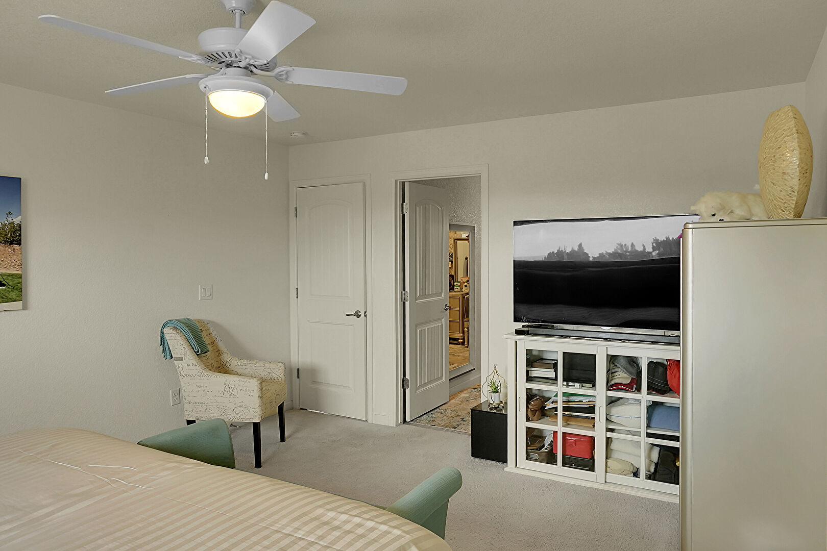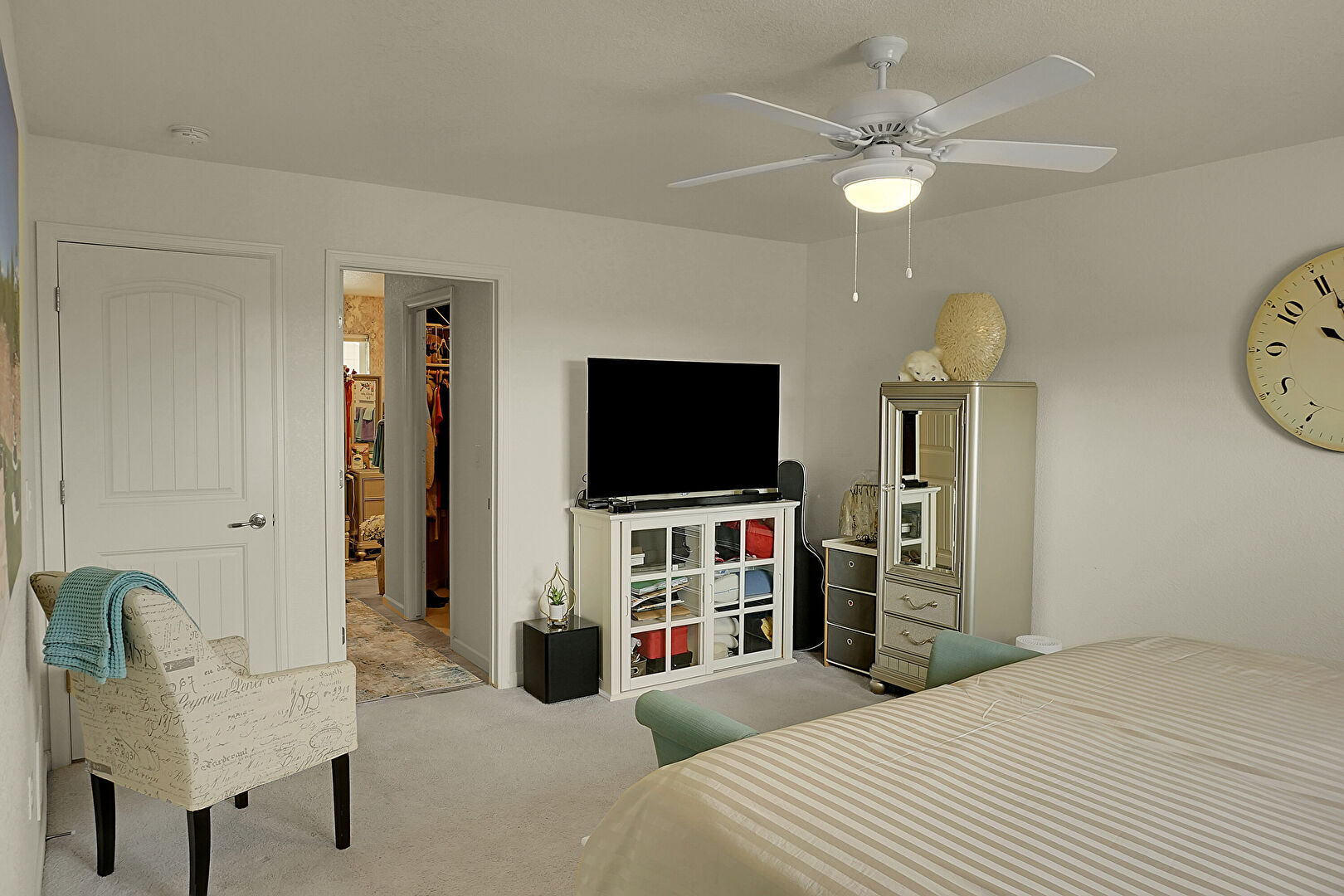 Baseboards Wall, Carpet, Ceiling Fan, Drywall, Textured Ceiling, Walk In Closet, Carpet, Natural Light