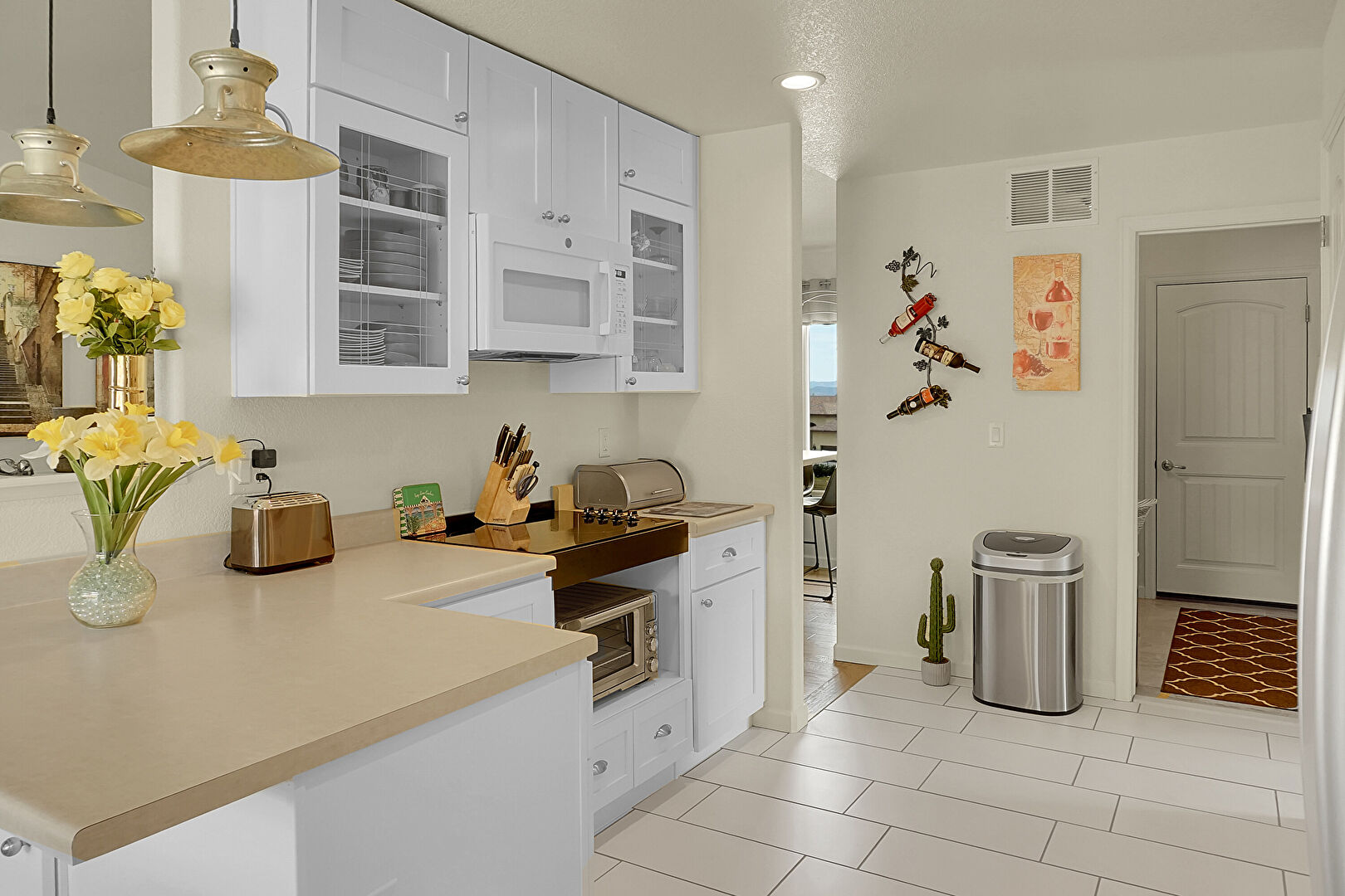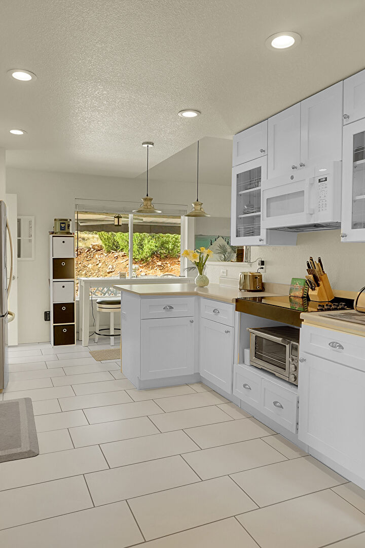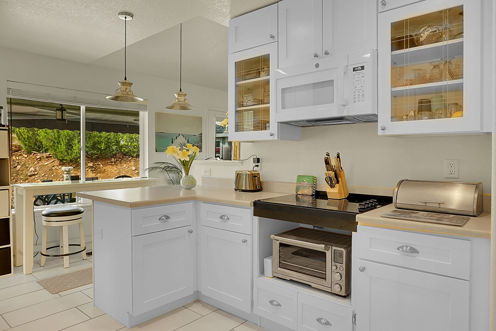 Baseboards Wall, Drywall, Glass Insert Cabinets, Kitchen Bar, Kitchen Peninsula, Natural Light, Pendant Lighting, Recessed Lighting, Shaker Cabinets, Textured Ceiling, Tile Floor, Toaster, Vaulted Ceiling, Vent, Glass Insert Cabinets, Natural Light, Shaker Cabinets, Tile Floor