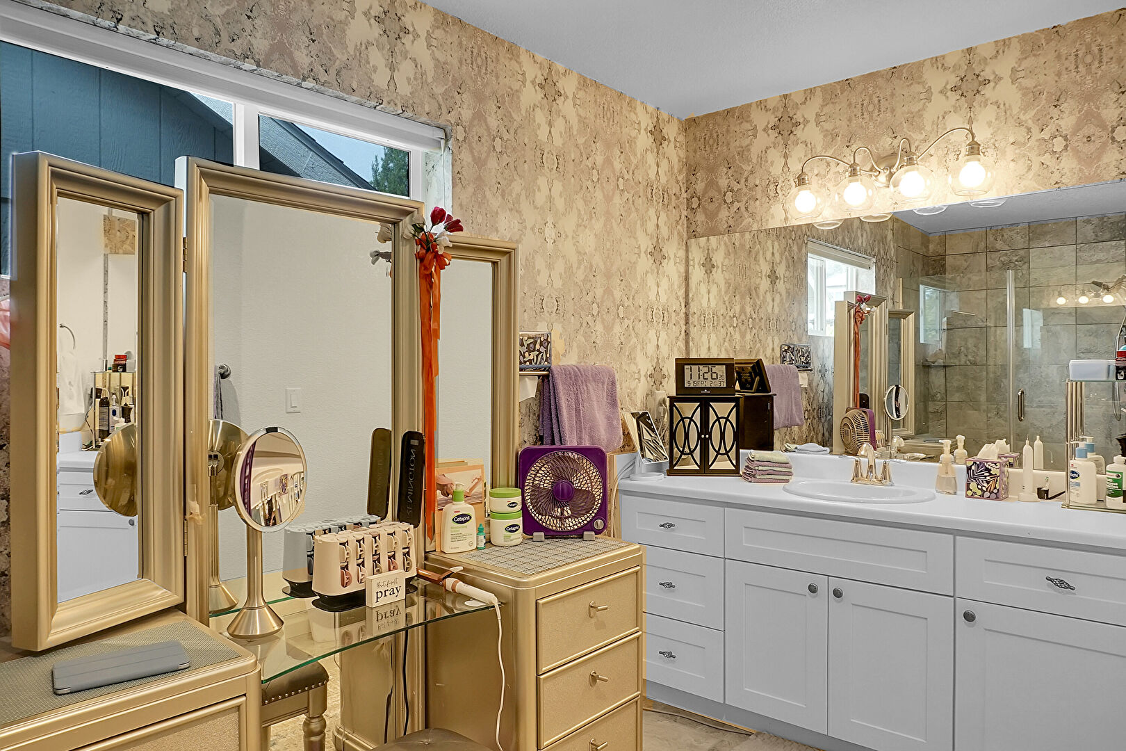 Combined Bath Shower, Drywall, Full Bathroom, Natural Light, Tile Floor, Vanity, Vent, Wallpaper Wall, Baseboards Wall, Full Bathroom, Vanity