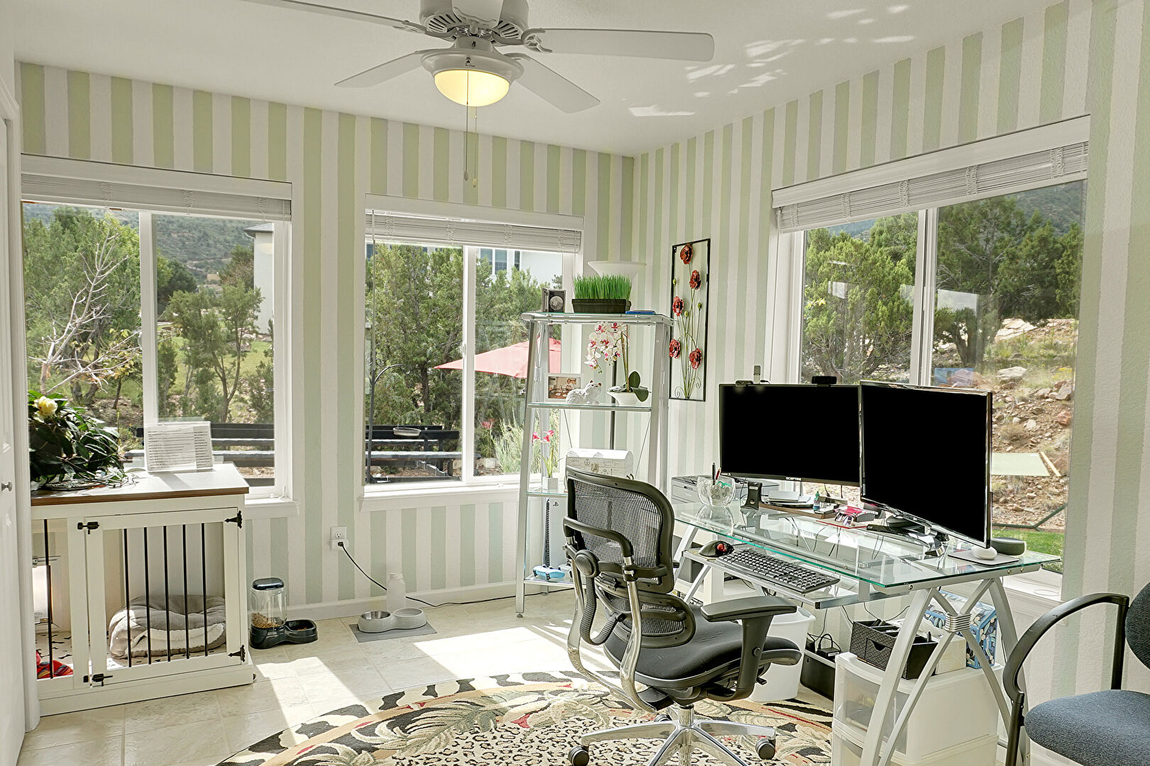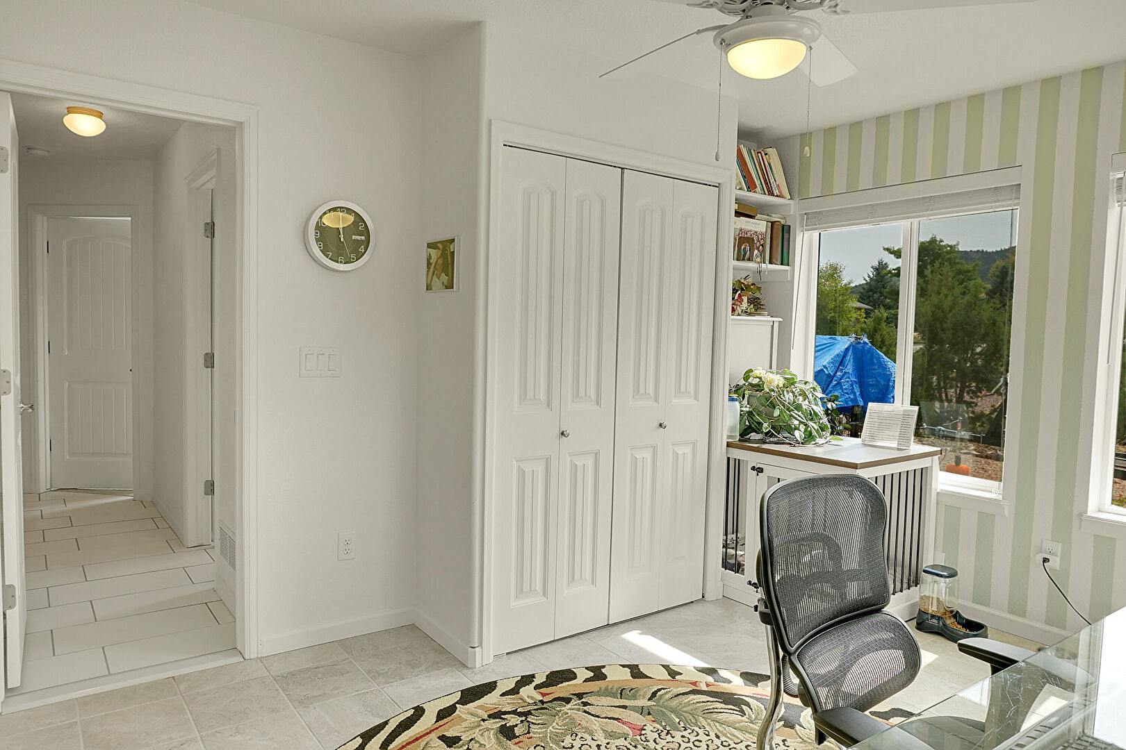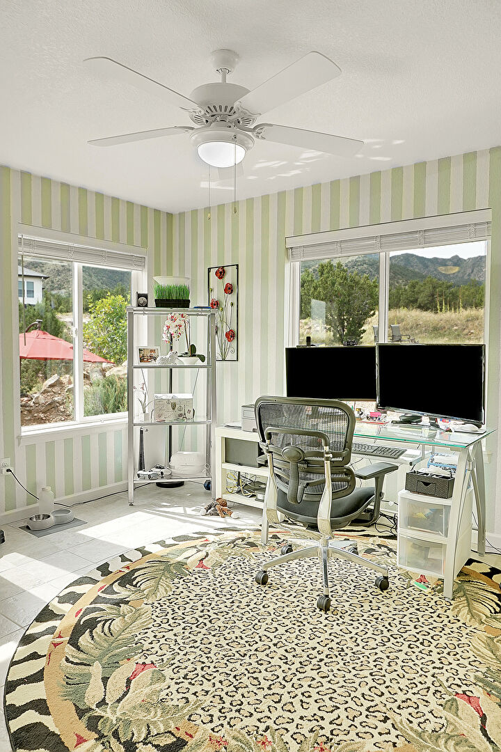 Baseboards Wall, Ceiling Fan, Drywall, Natural Light, Office Area, Sunroom, Tile Floor, Wallpaper Wall, Office Area, Tile Floor, Wallpaper Wall