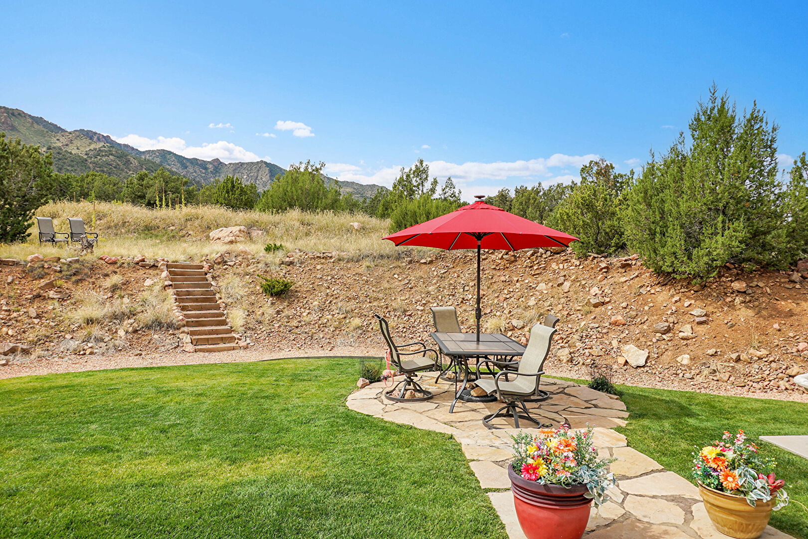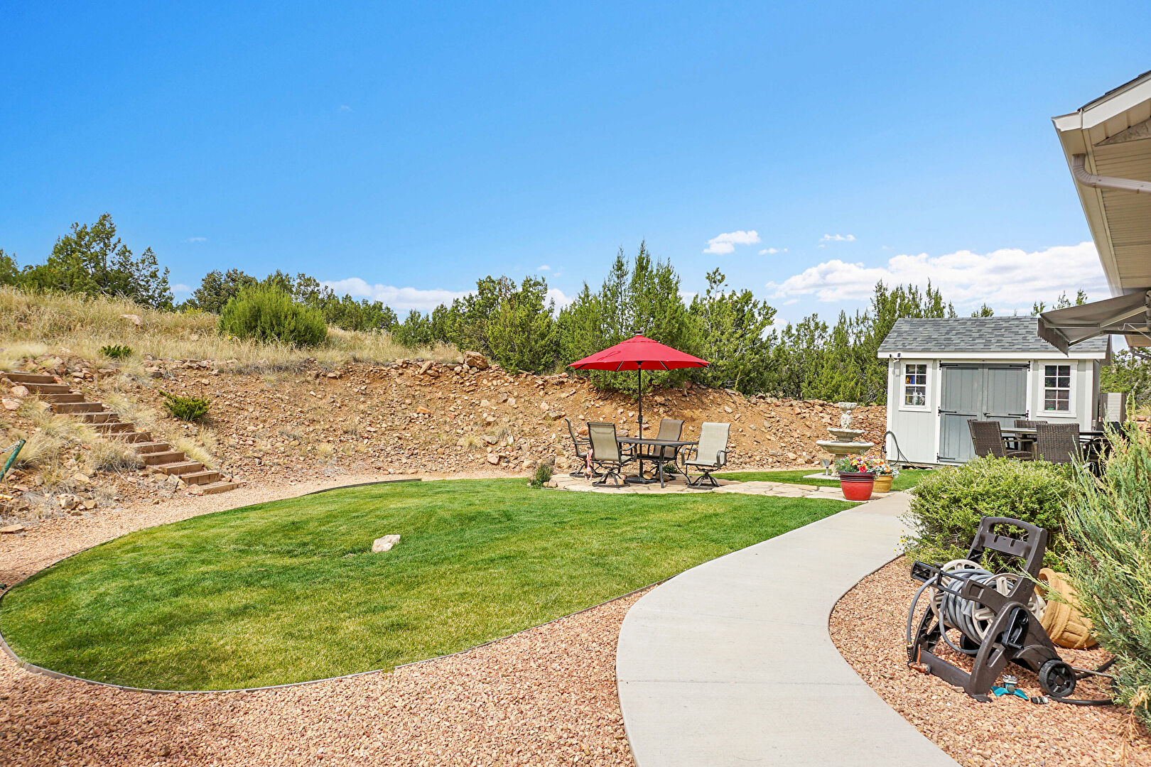 Fence, Lawn, Mountain View, Outdoor Dining Area, Outdoor Structure, Patio, Stairs, Patio, Shed