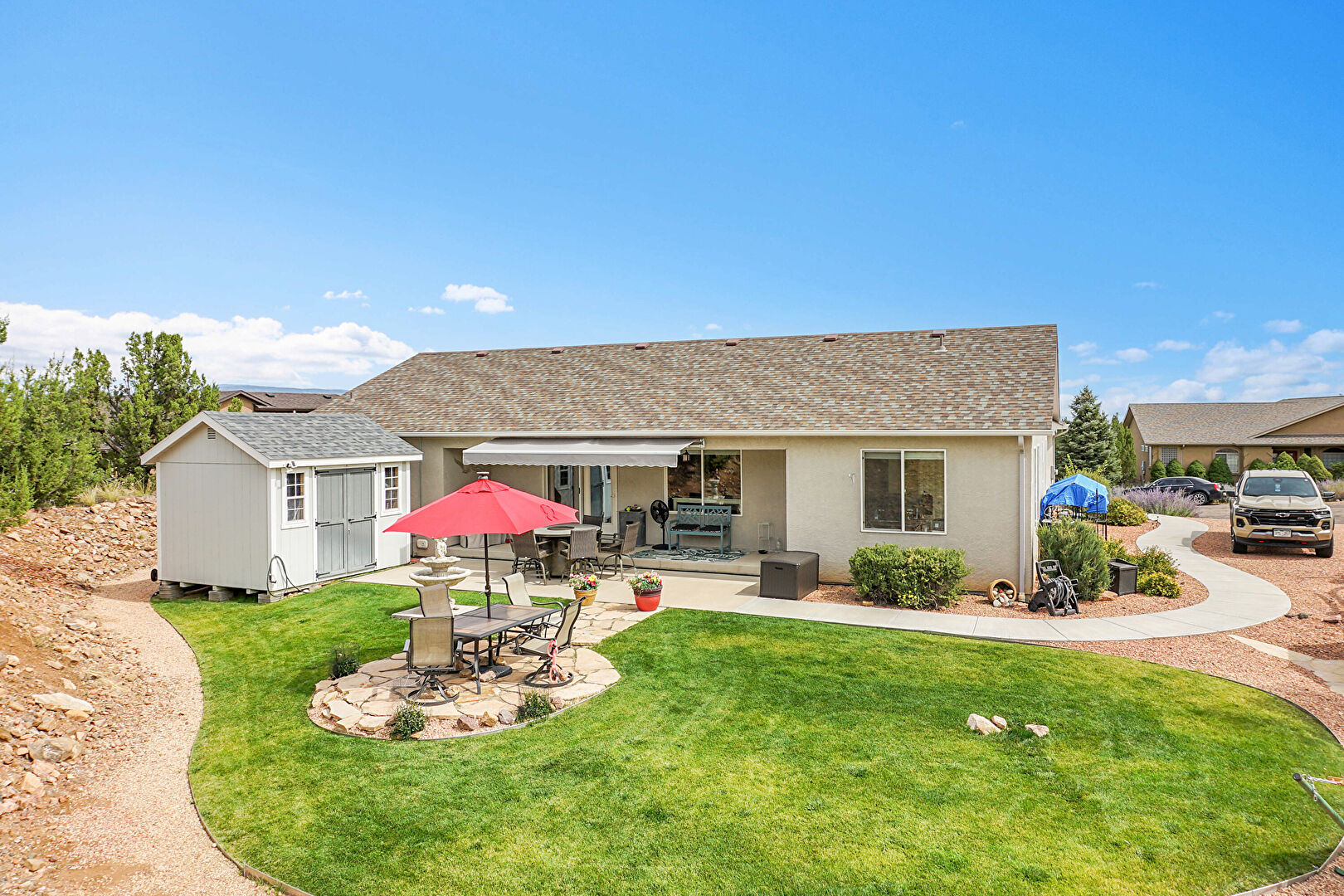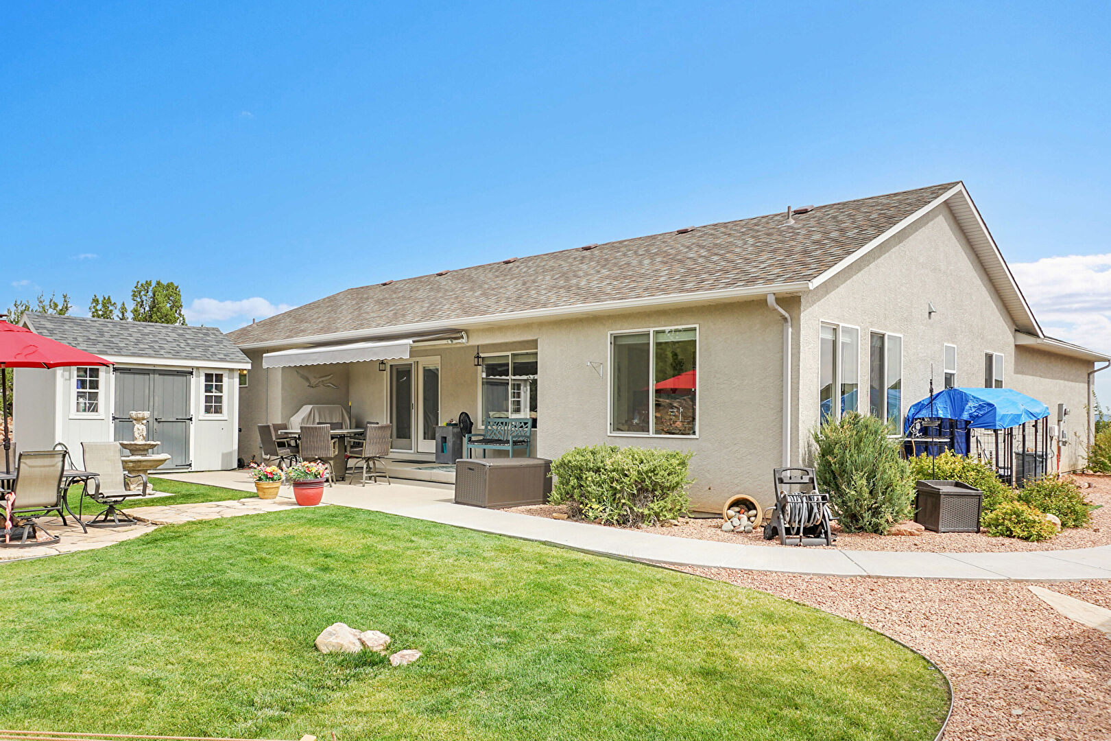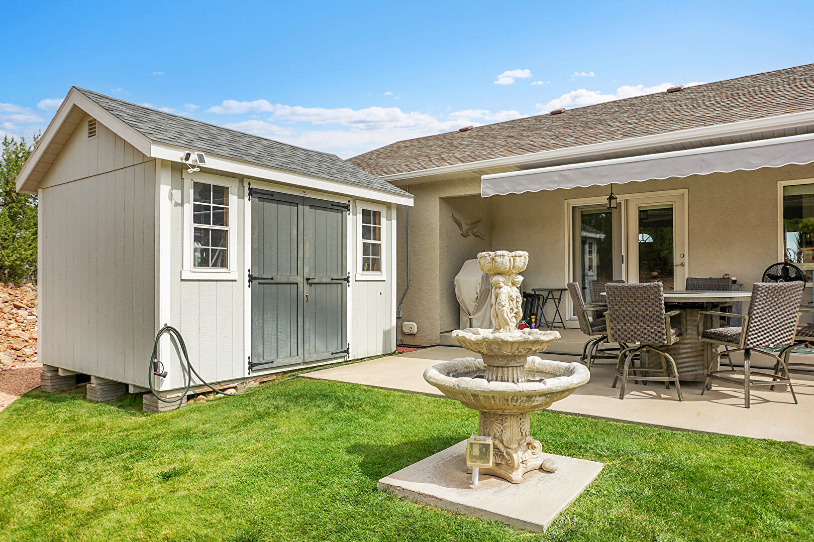 Awning, Downspout, Fountain, Gutters, Lawn, Outdoor Dining Area, Outdoor Structure, Patio, Shed, Shingle Roof, Stucco Siding, Patio, Shingle Roof