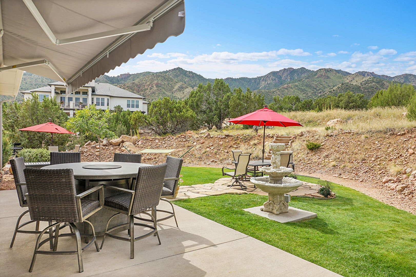 Awning, Fountain, Mountain View, Outdoor Dining Area, Patio, Lawn