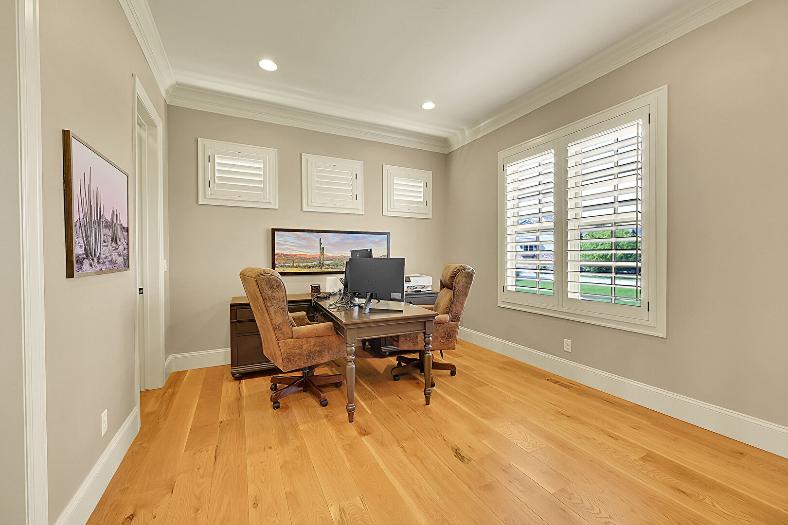Baseboards Wall, Crown Molding, Drywall, Natural Light, Office Area, Recessed Lighting, Wood Finish Floor, Vent, Wood Finish Floor