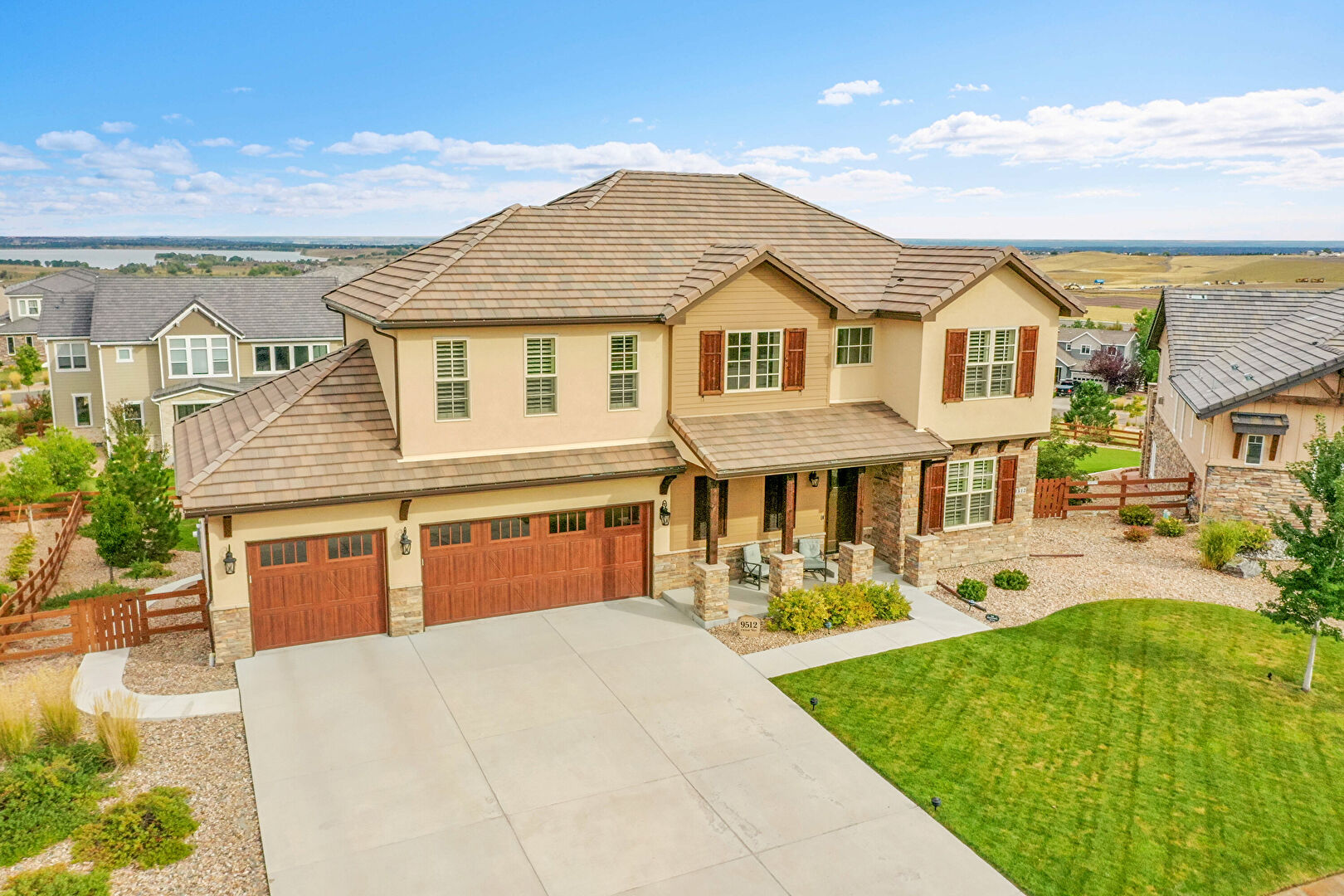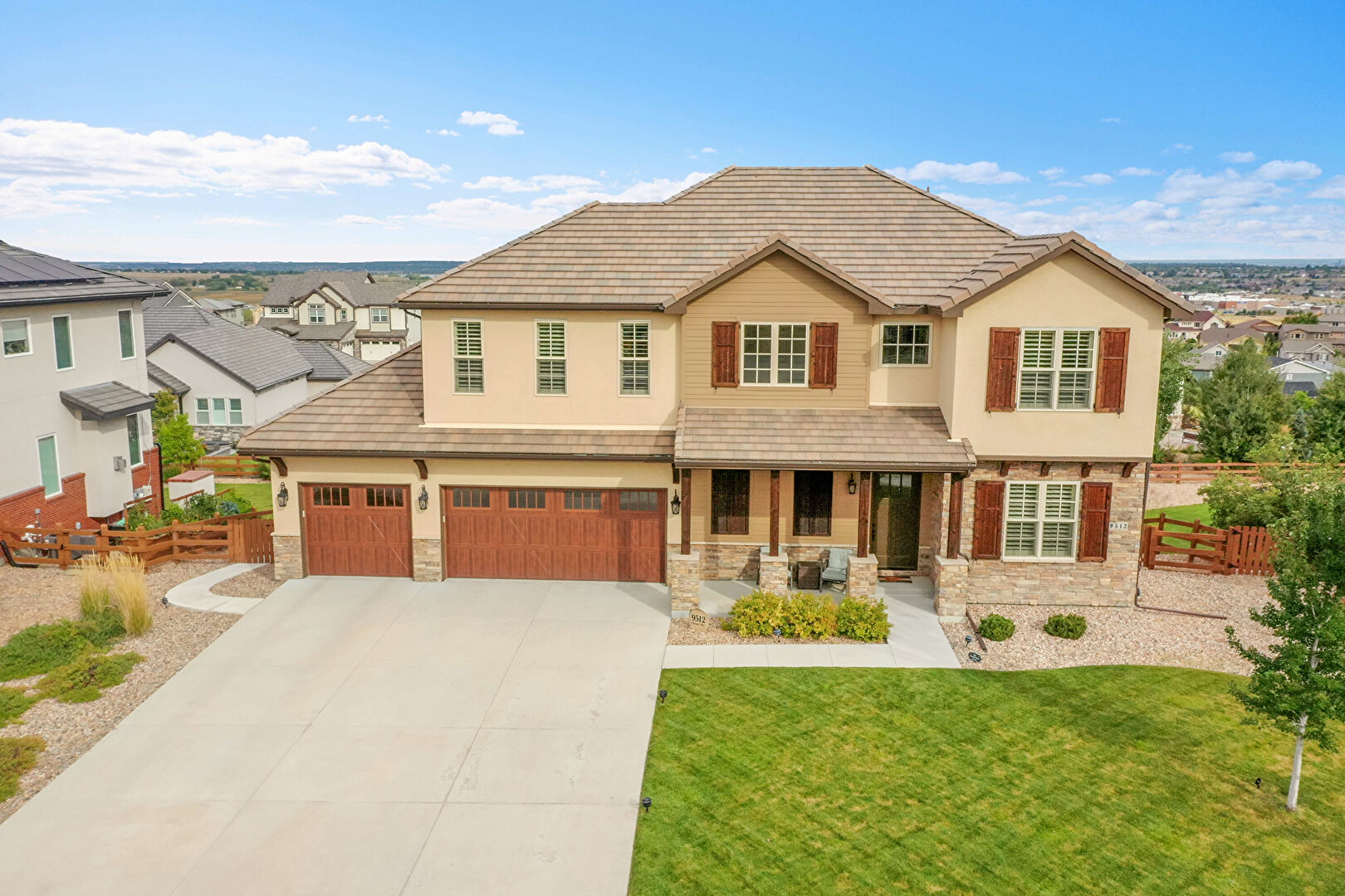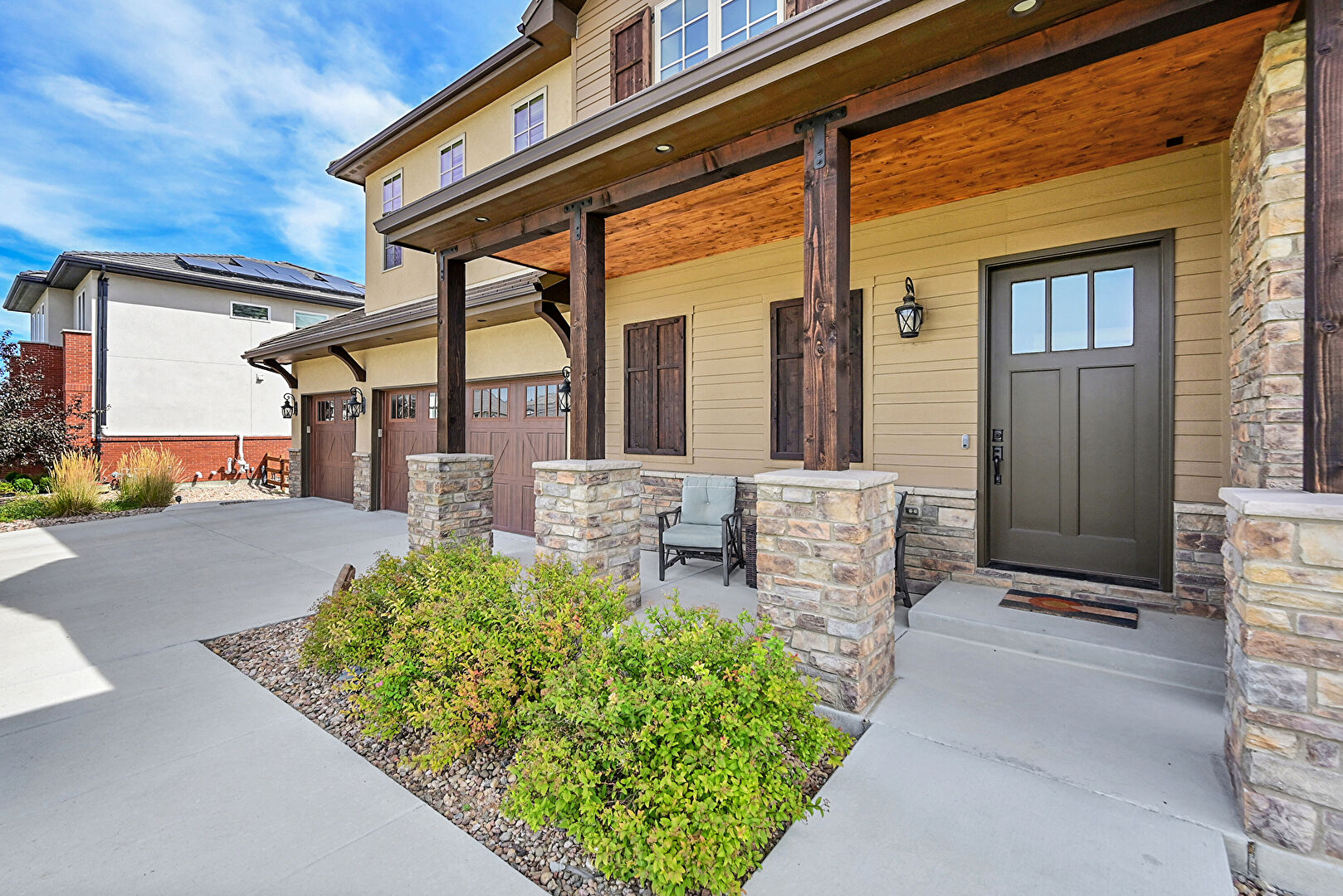 Built In Garage, Downspout, Driveway, Fence, Gutters, Horizontal Siding, Lawn, Porch, Residential View, Stone Siding, Stucco Siding, Tile Roof, Downspout, Driveway, Stone Siding, Tile Roof