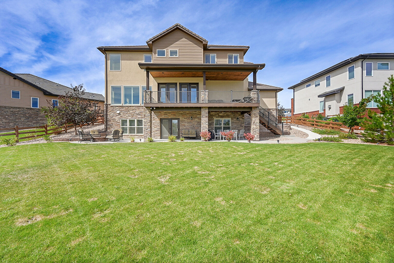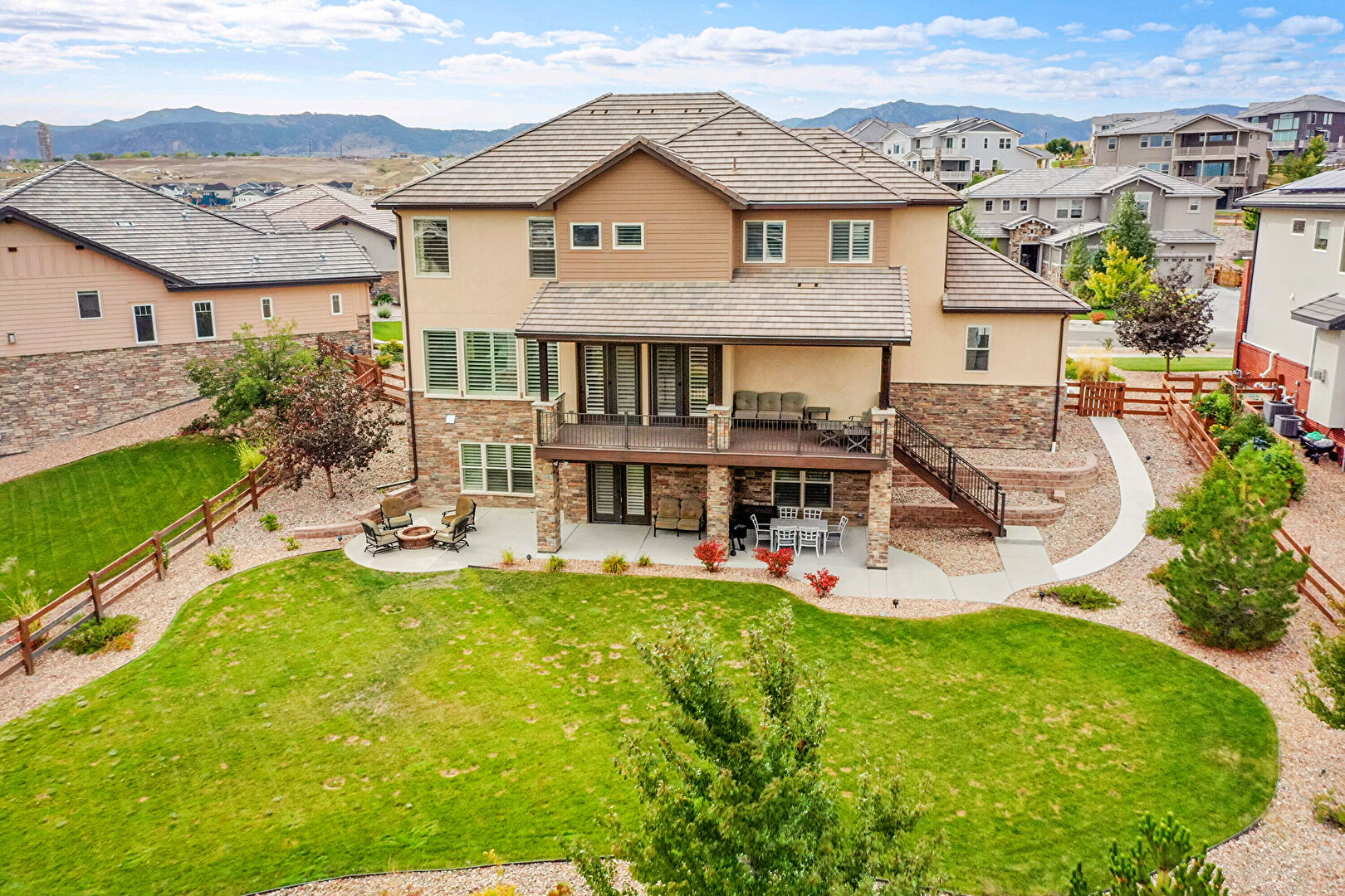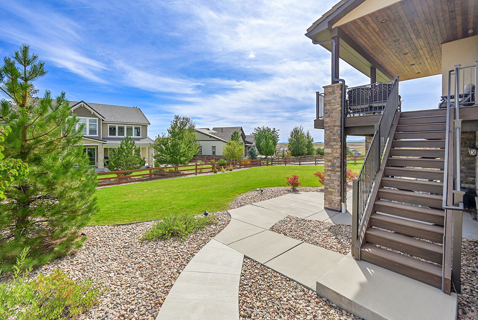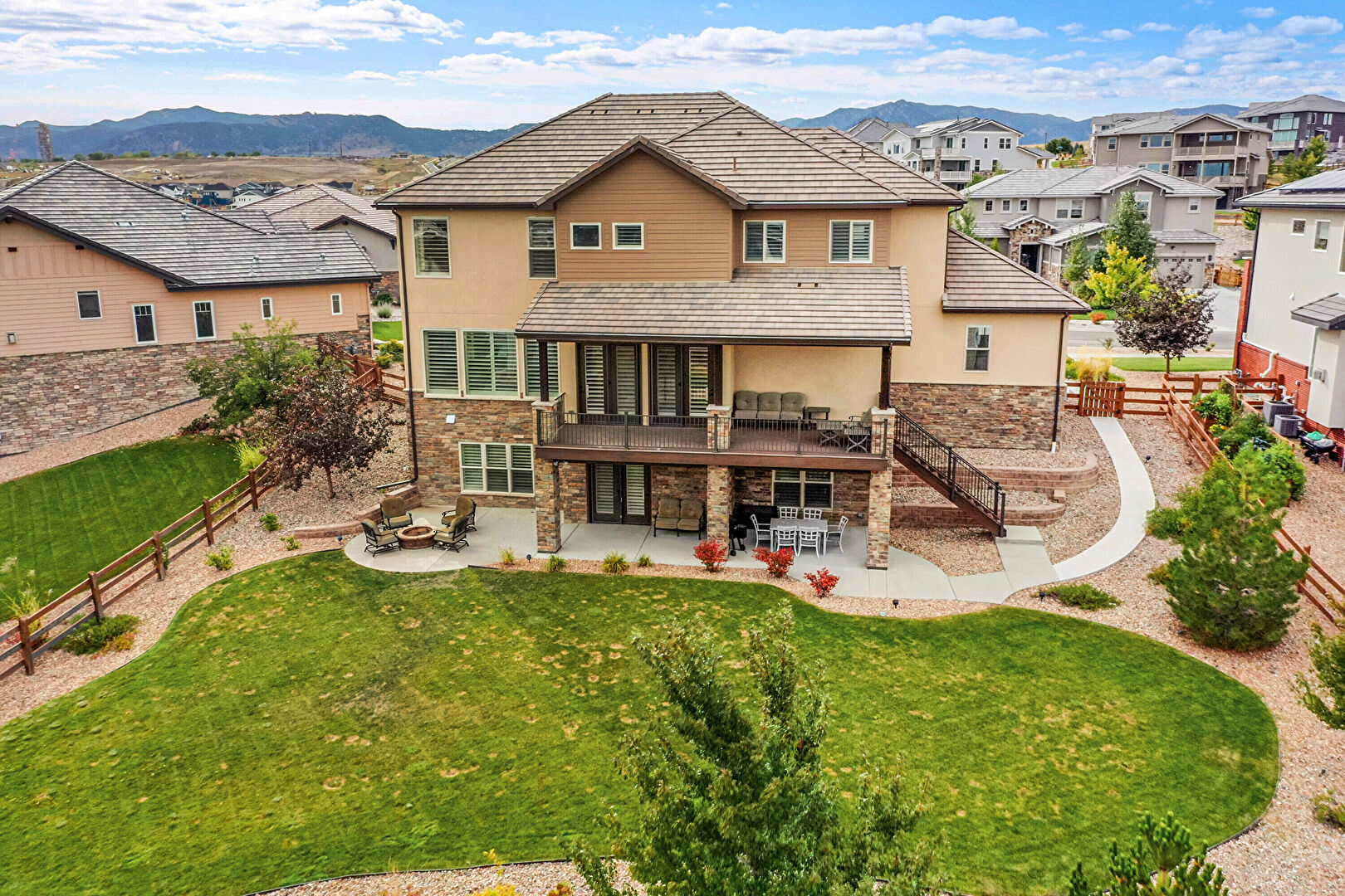 Balcony, Basement Walk Out, Deck, Downspout, Fence, Gutters, Horizontal Siding, Lawn, Mountain View, Outdoor Dining Area, Patio, Residential View, Stairs, Stone Siding, Stucco Siding, Tile Roof, Fence, Stairs, Stone Siding, Stucco Siding