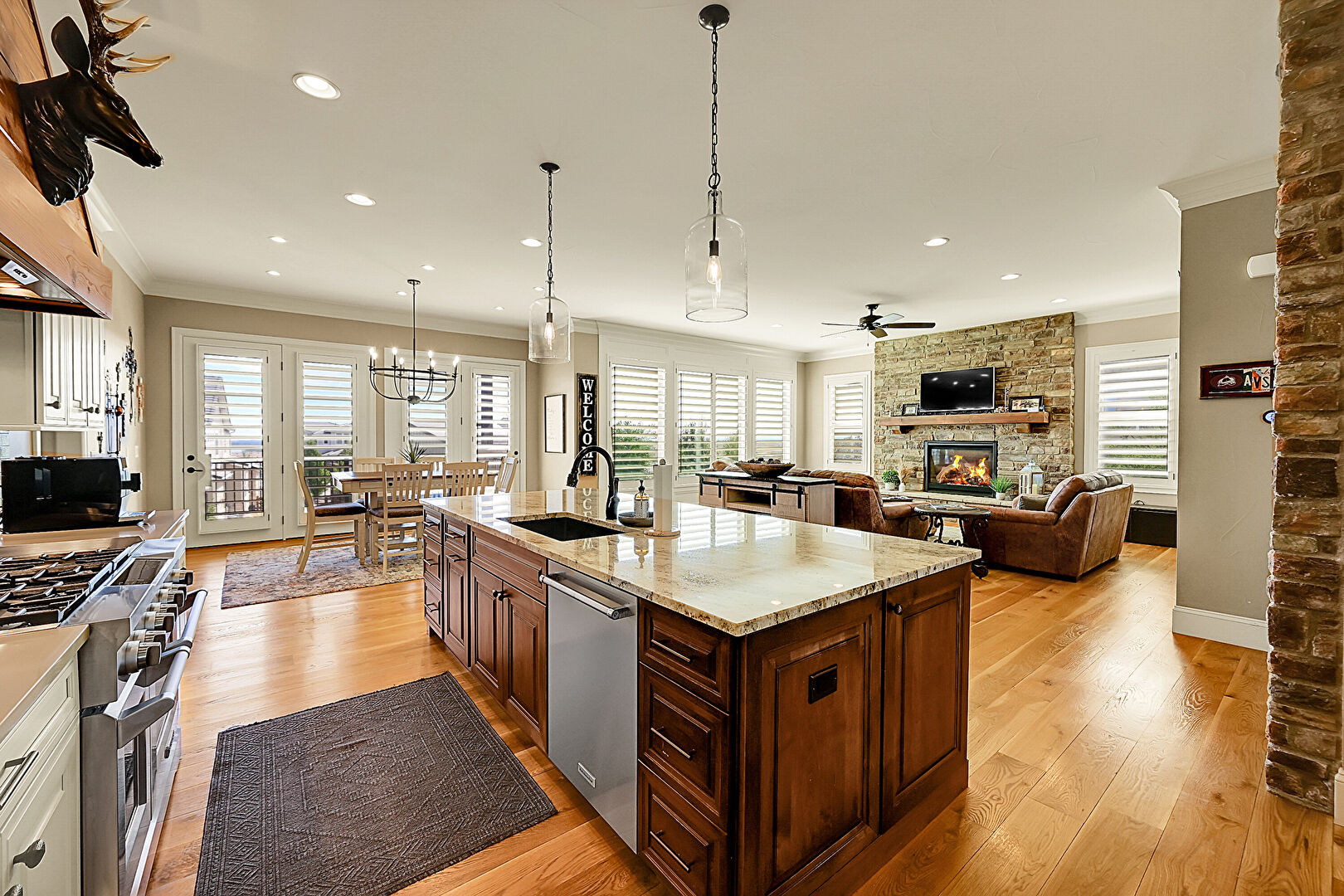 Baseboards Wall, Ceiling Fan, Crown Molding, Crown Molding Cabinets, Dark Brown Cabinets, Drywall, Fireplace, Kitchen Bar, Kitchen Island, Medium Brown Cabinets, Natural Light, Notable Chandelier, Opens To Living Area, Pendant Lighting, Raised Cabinets, Recessed Lighting, Stone Countertops, Toaster, Trash Compactor, Wood Finish Floor, Kitchen Island, L Shaped Kitchen, Toaster, Wood Finish Floor