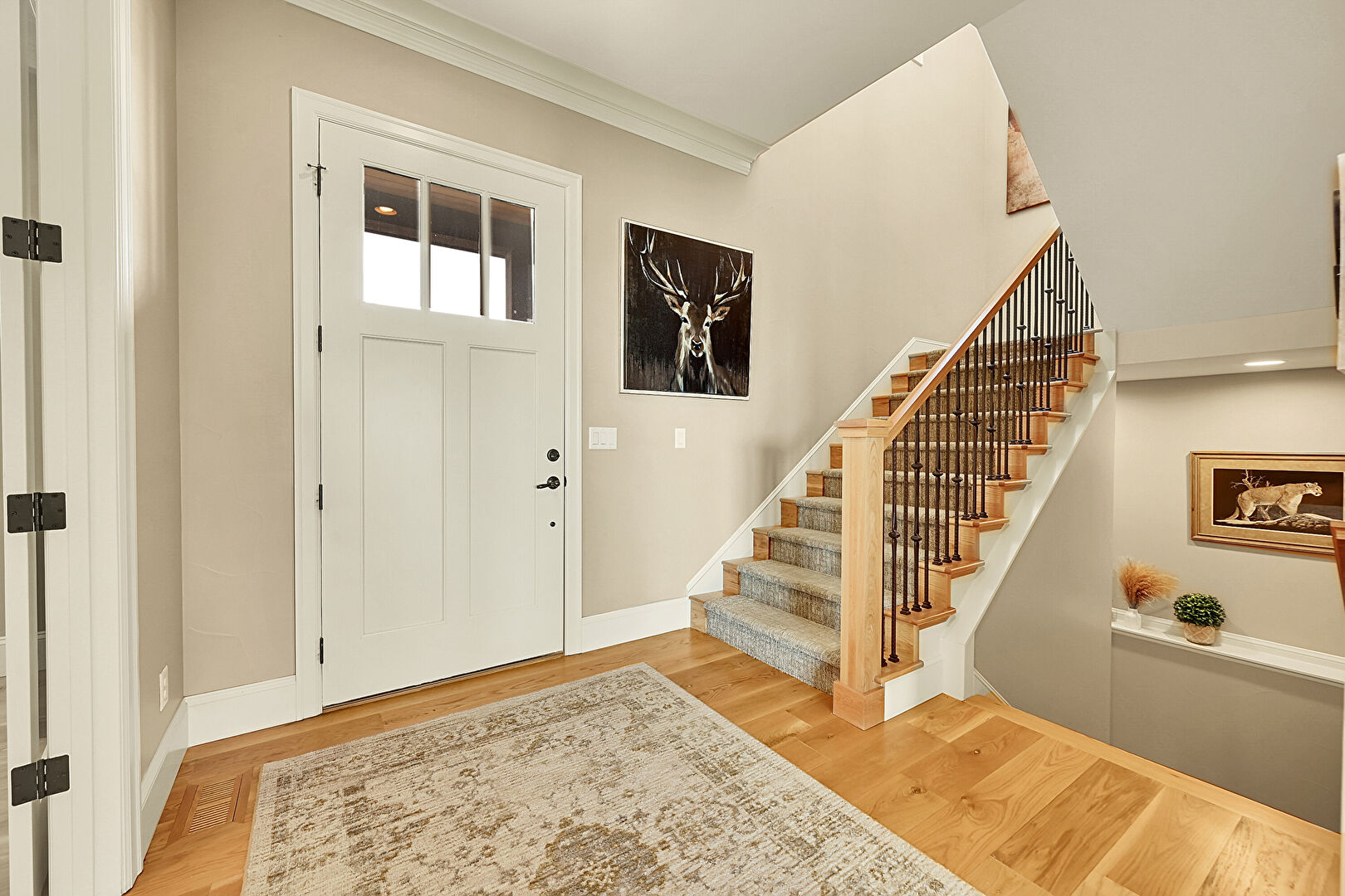Baseboards Wall, Drywall, Natural Light, Stairs, Wood Finish Floor, Crown Molding