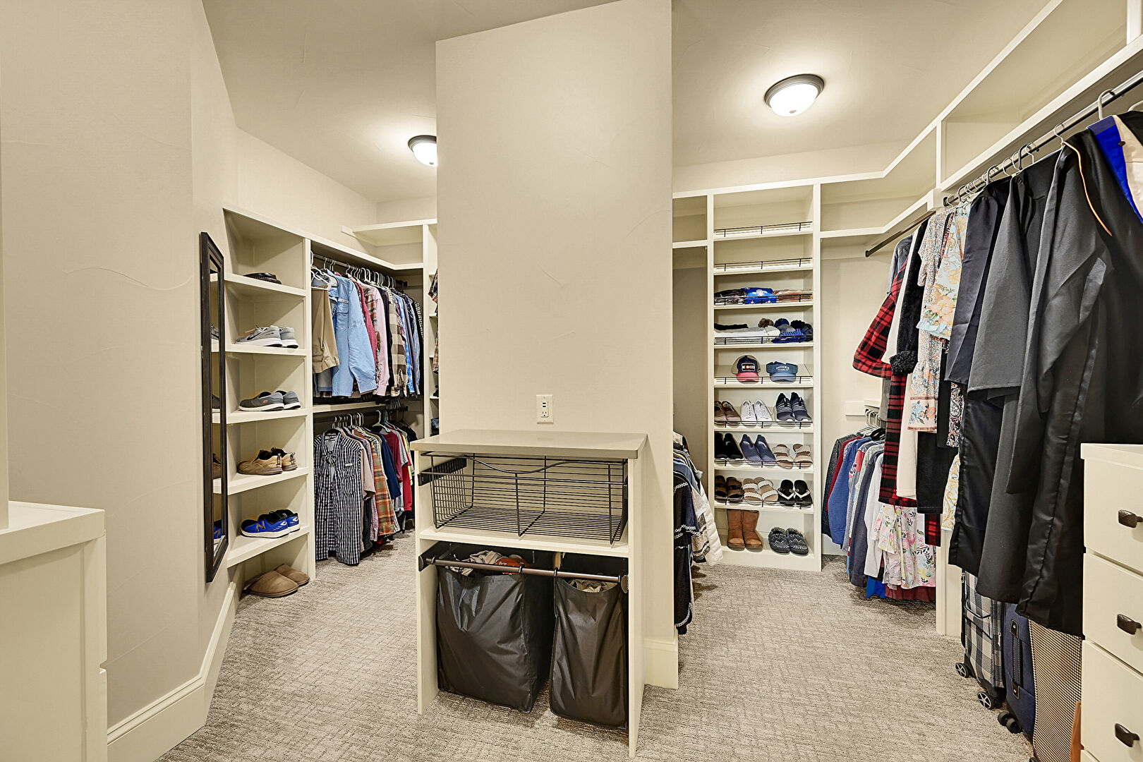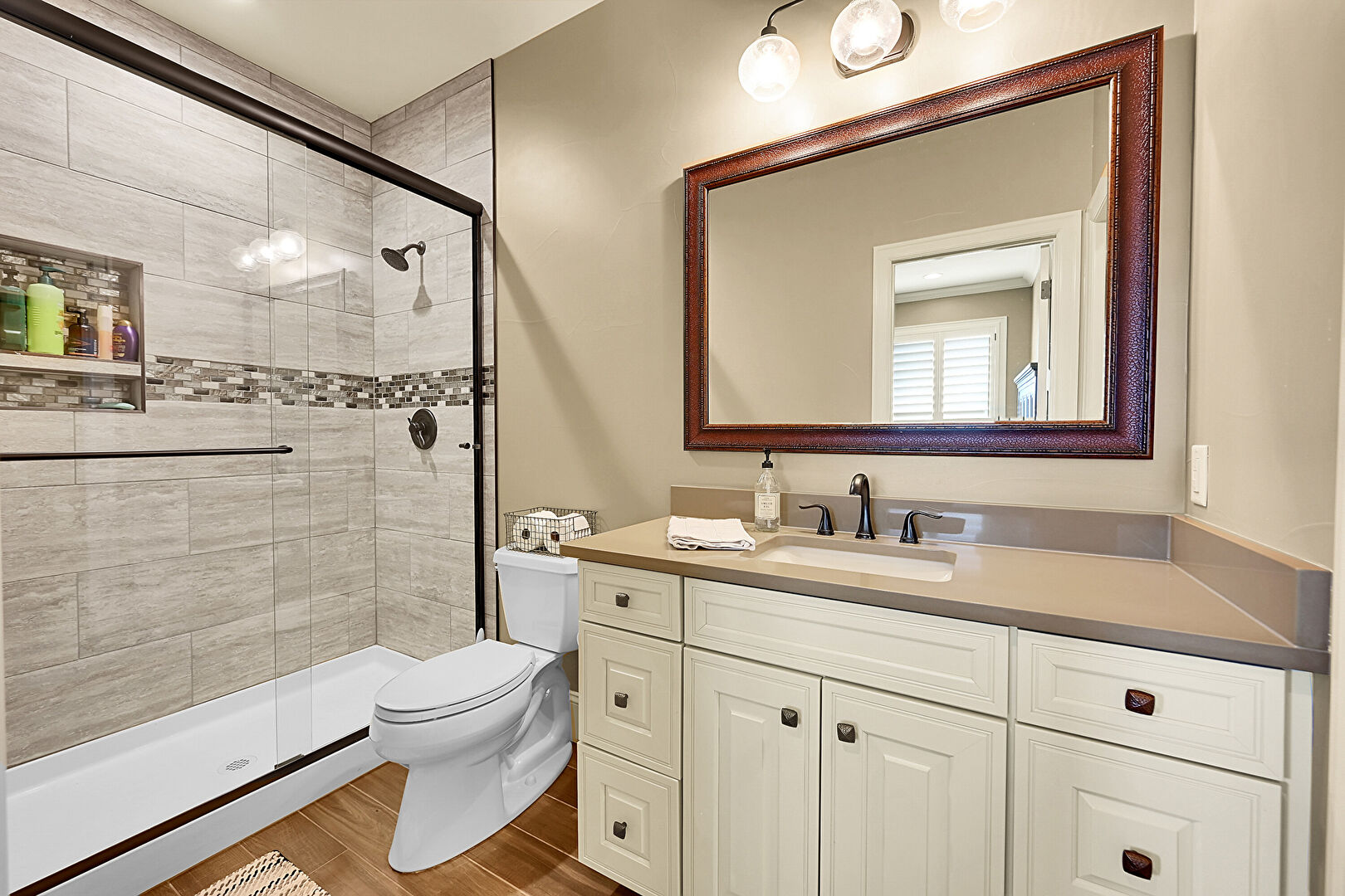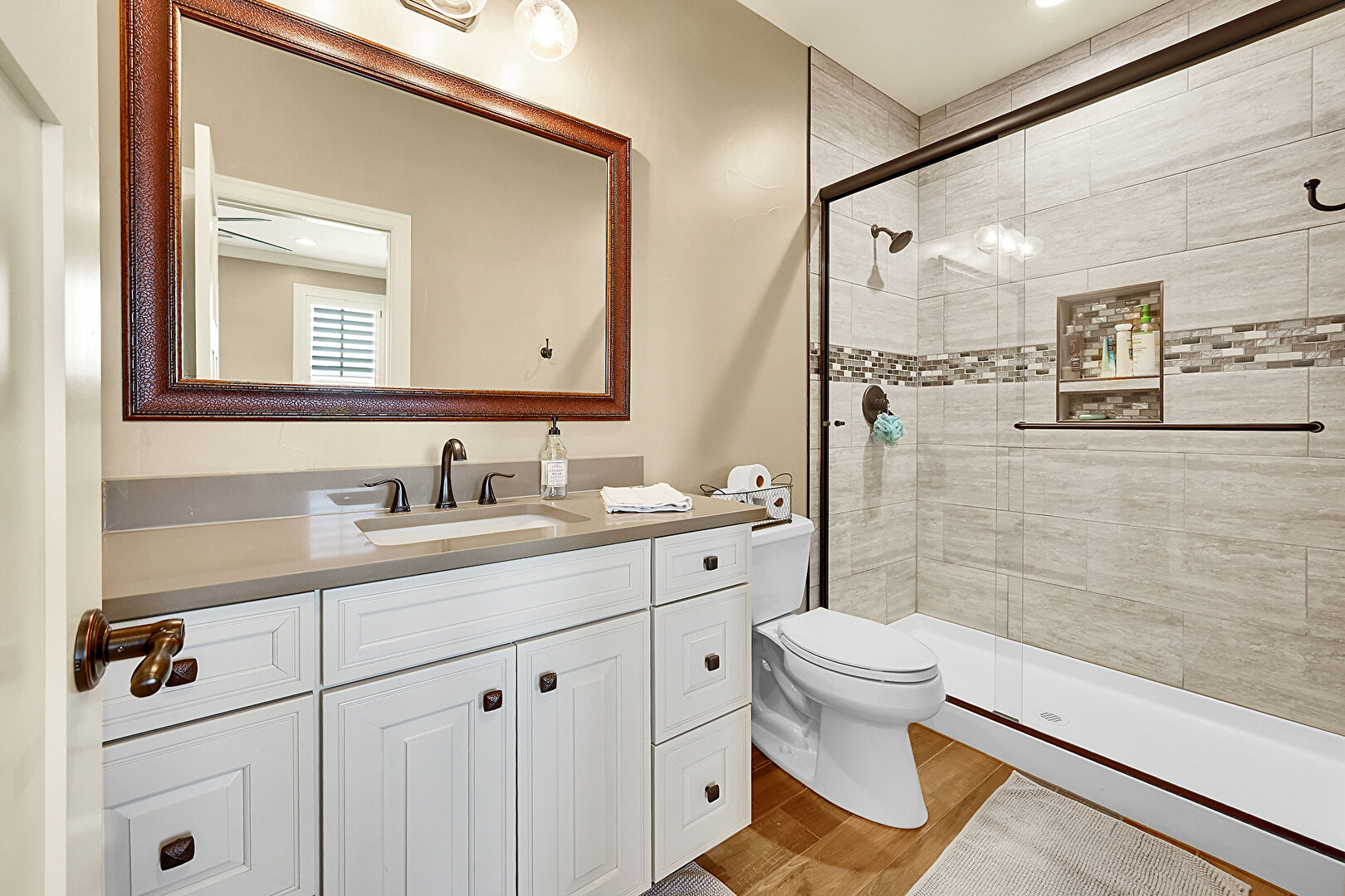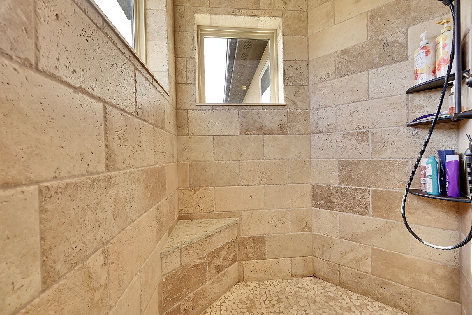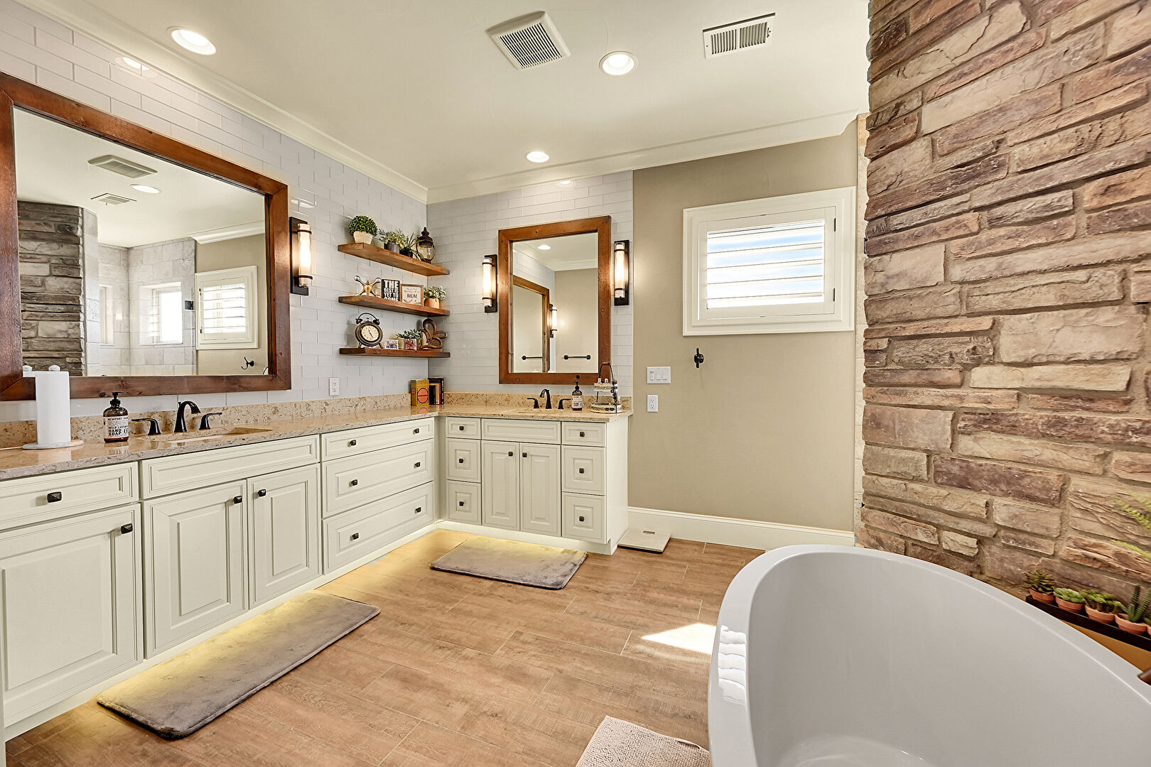 Baseboards Wall, Closet, Combined Bath Shower, Crown Molding, Double Vanity, Drywall, Full Bathroom, Natural Light, Recessed Lighting, Stone Wall, Vanity, Vent, Wood Finish Floor, Drywall, Full Bathroom, Natural Light, Recessed Lighting, Vanity
