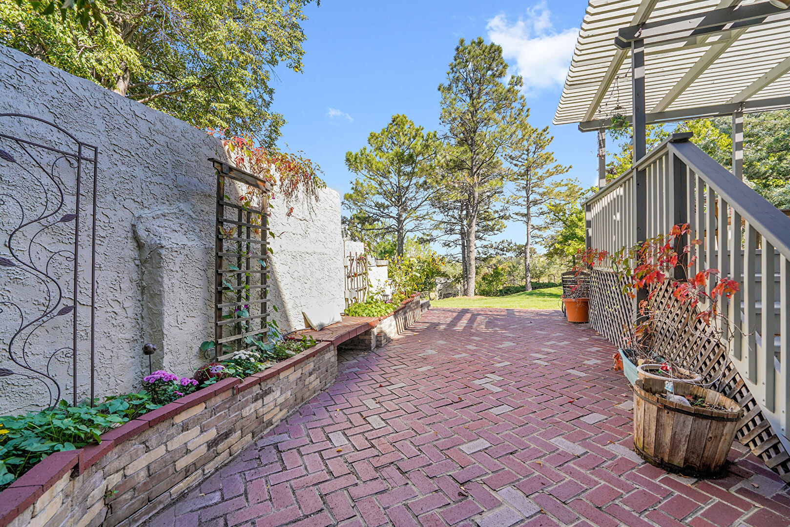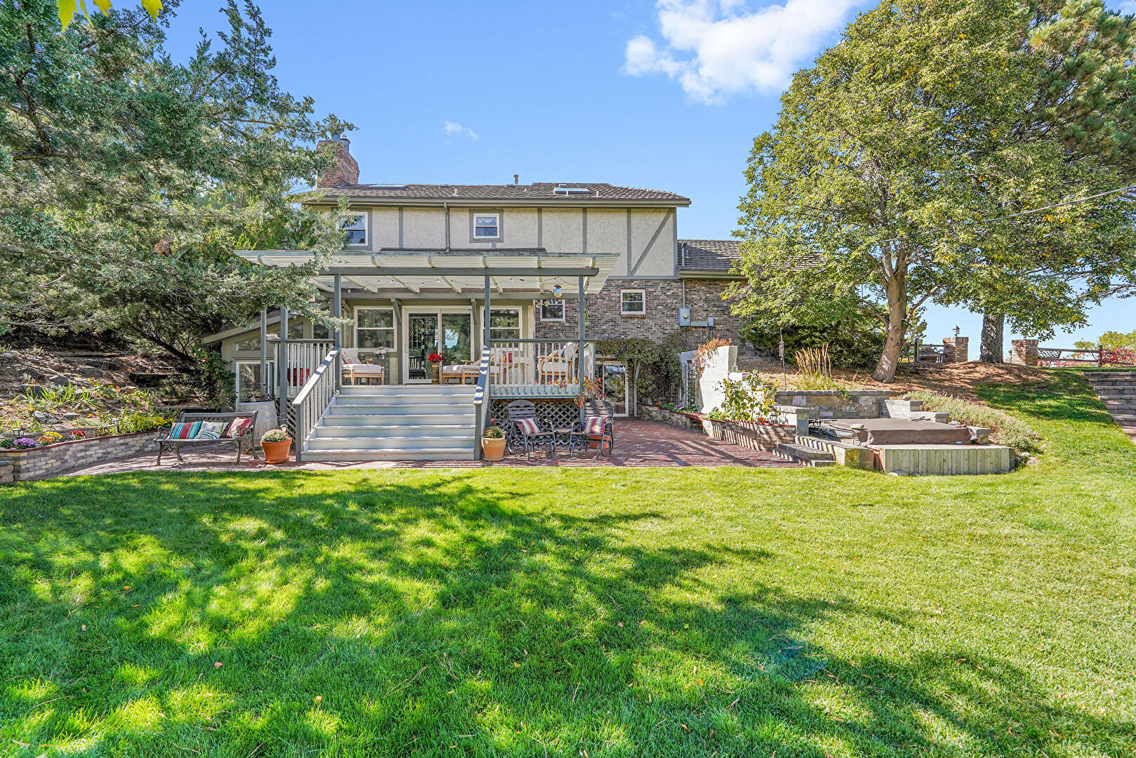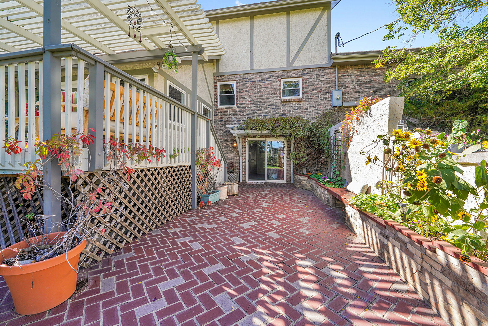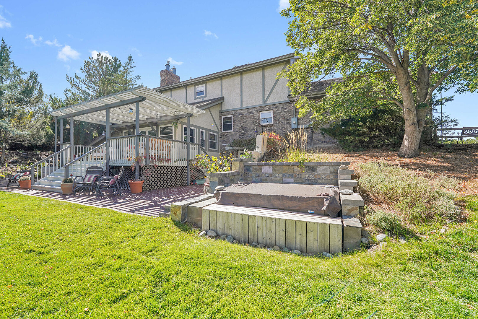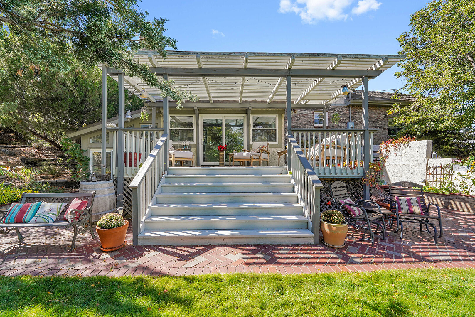 Brick Siding, Chimney, Deck, Lawn, Patio, Pergola, Stairs, Stone Siding, Stucco Siding, Deck, Pergola, Stucco Siding