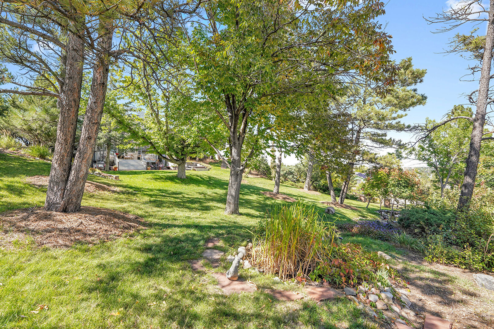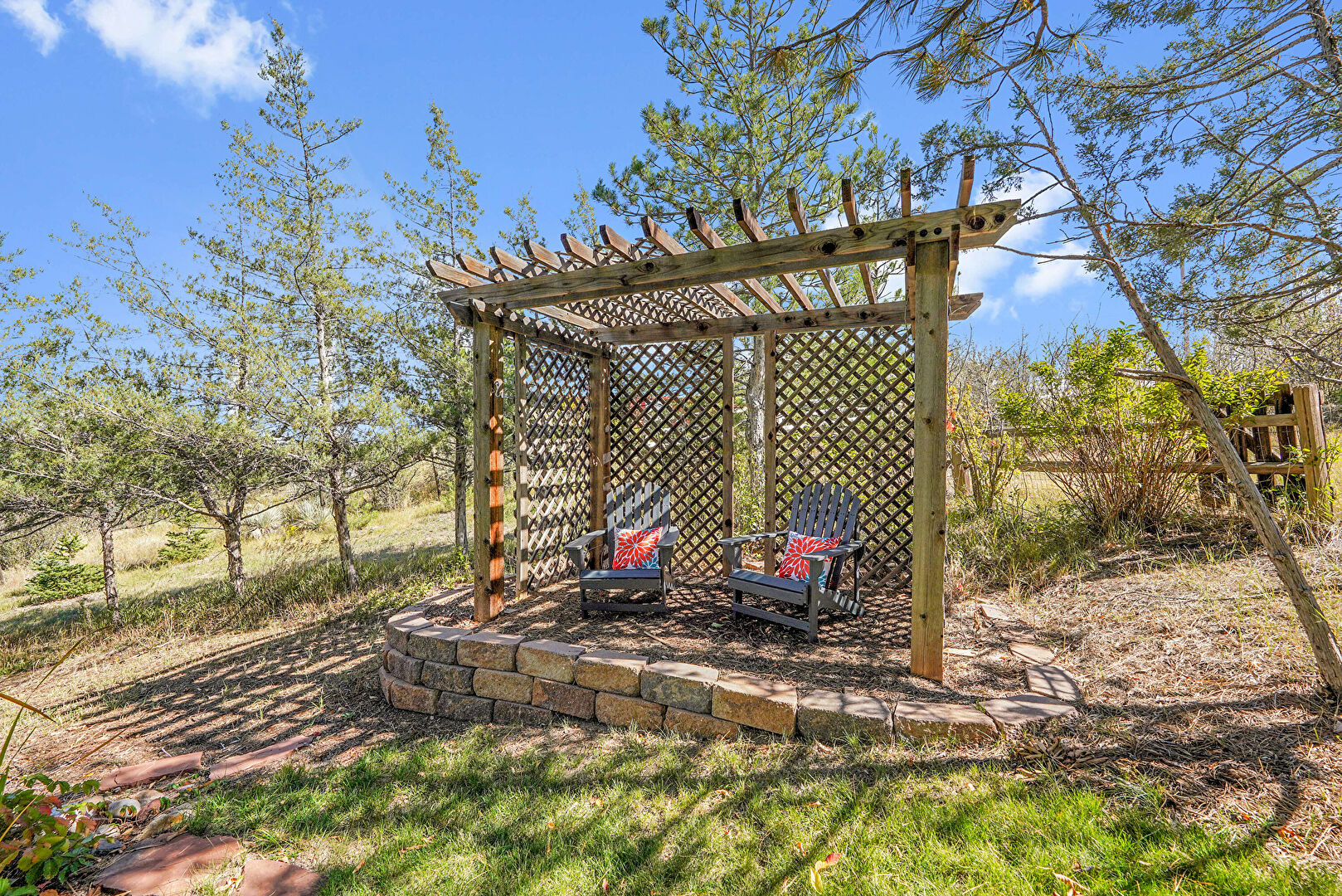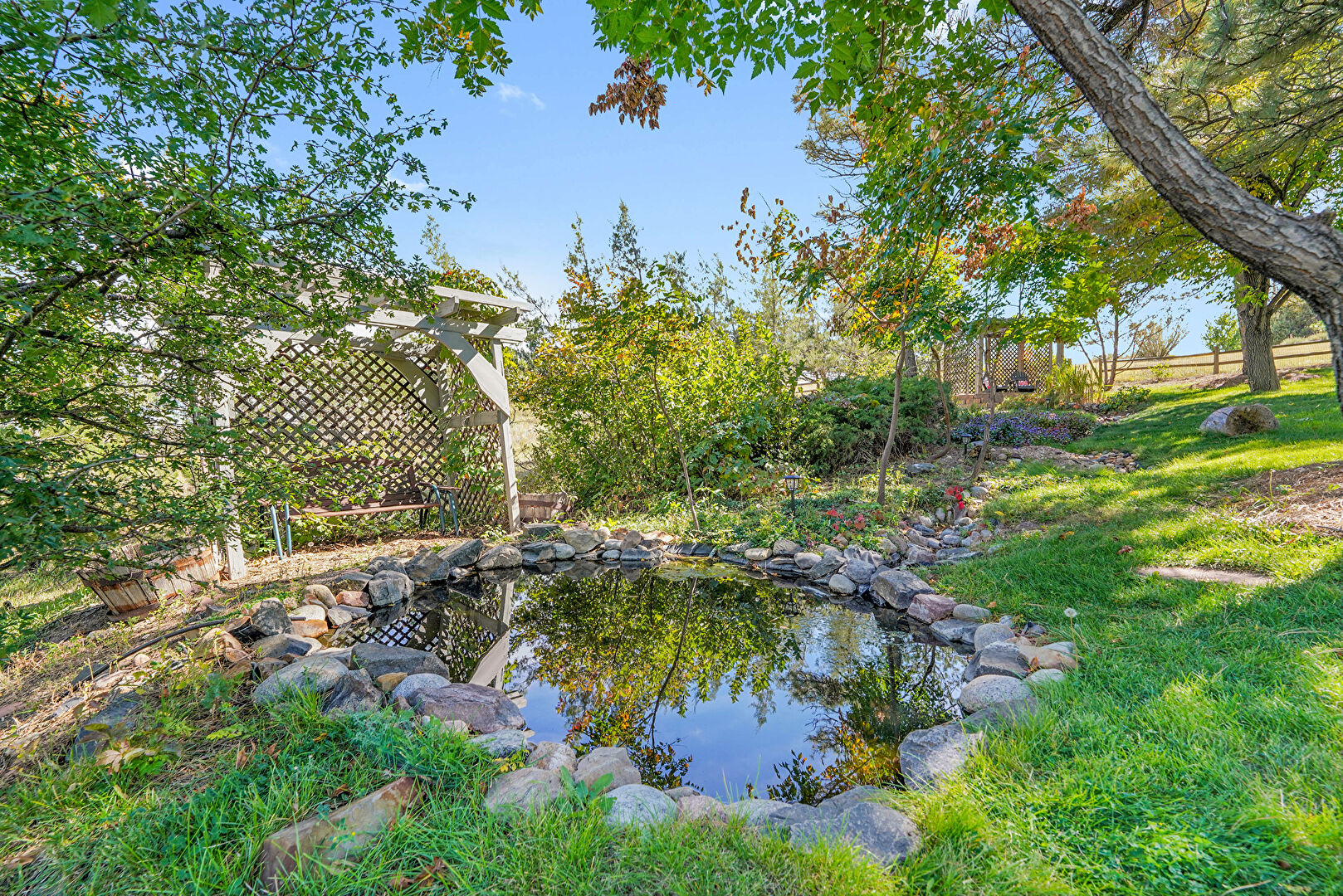 Deck, Fence, Garden Pond, Lawn, Patio, Pergola, Rural View, Stairs, Garden, Garden Pond, Lawn, Patio, Woods View