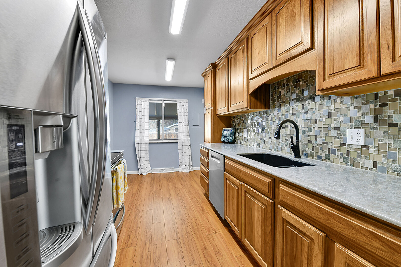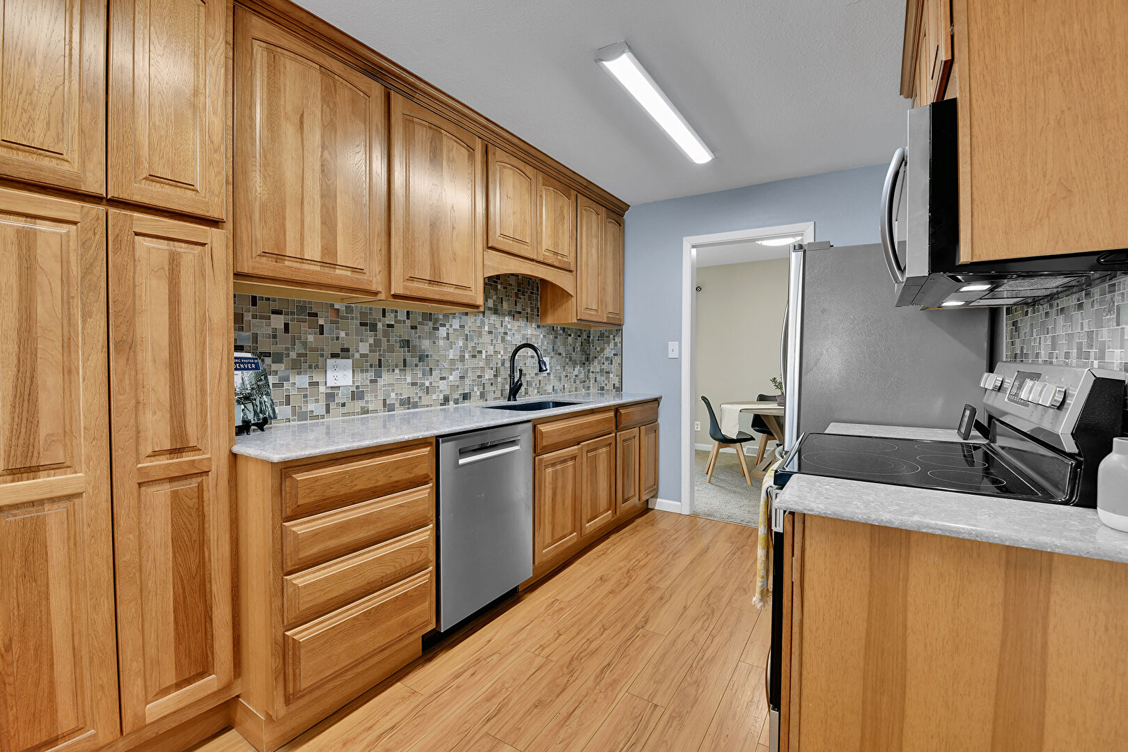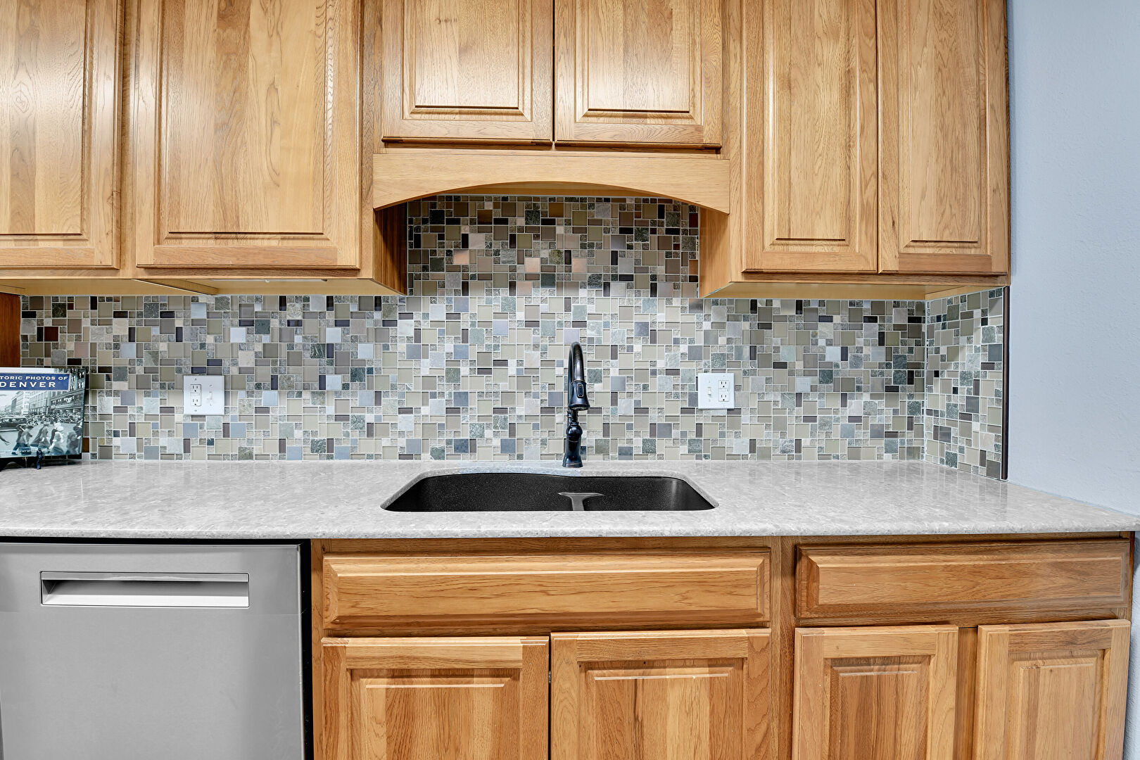 Arched Cabinets, Baseboards Wall, Crown Molding Cabinets, Drywall, Galley Kitchen, Medium Brown Cabinets, Natural Light, Raised Cabinets, Stone Countertops, Toaster, Vent, Wood Finish Floor, Arched Cabinets, Drywall, Raised Cabinets, Stone Countertops, Vent